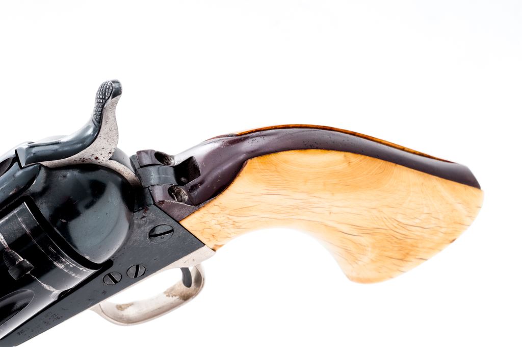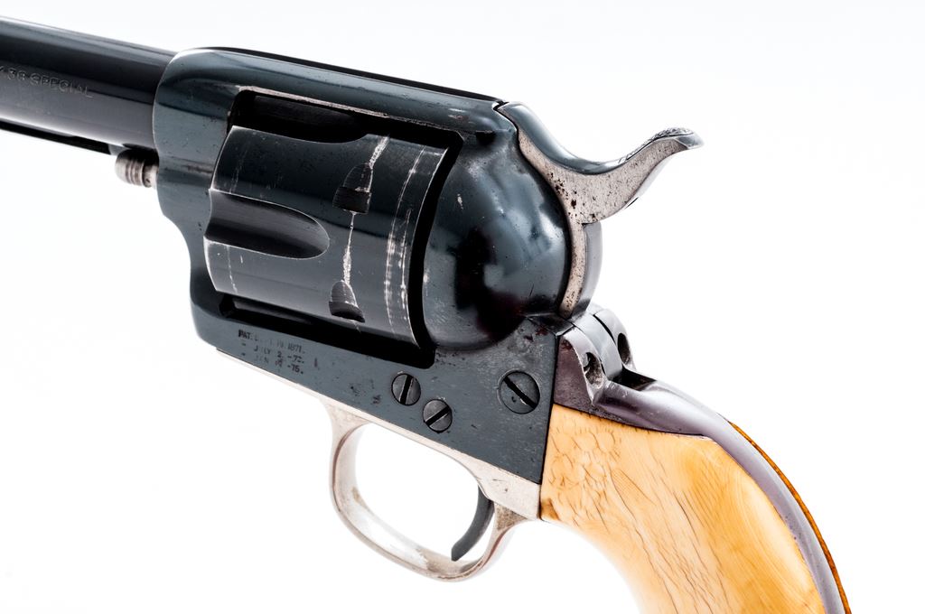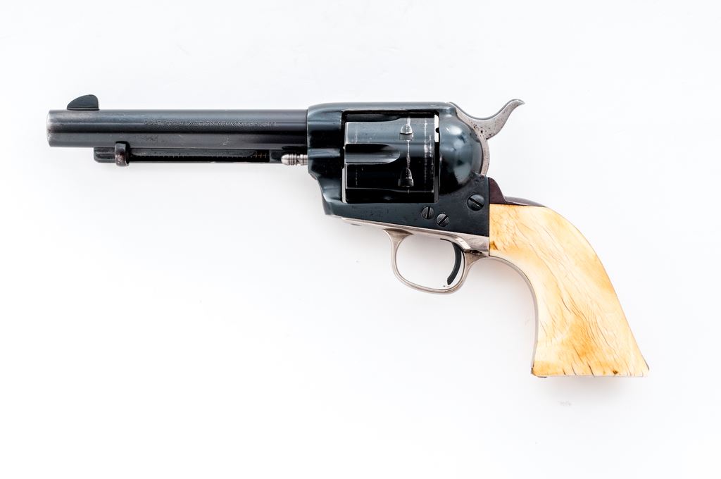 Colt Model 1873 Single Action Army Cartridge Revolver, #41273, .38 Spec. CF cal., later 5.5'' round barrel without top address line is marked ''Colt Single Action Army .38 Special'' on left side, ''Colt's Mfg. Co. Hartford, CT U.S.A.'' on right, left frame with three-line 1871-72-75 patent dates, full blued finish, steel grip straps with one-piece ivory grips. A composite gun, the only visible serial number being on the frame; loading gate is marked ''518''. Condition is excellent as refinished, retaining 95% dark blue to barrel, cylinder (with drag line) and frame; backstrap finish a plum color; nickel-plated triggerguard; blued hammer with sides polished bright; blued trigger. Grips are very good showing age striations and a pleasing cream color. Action is crisp and smooth; bore is mirror-bright with shallow rifling. Est.: $1,000-$1,500. (Antique)