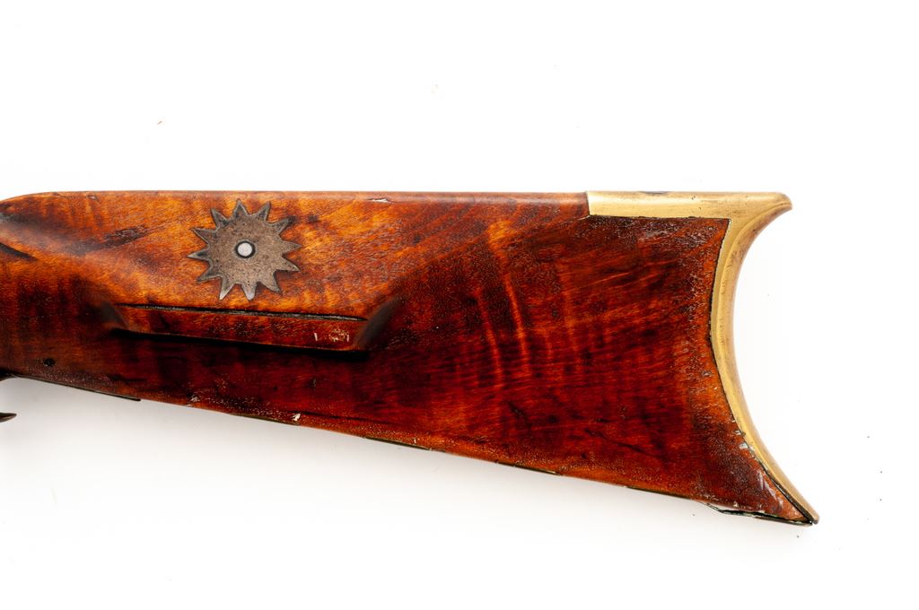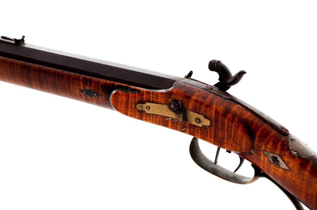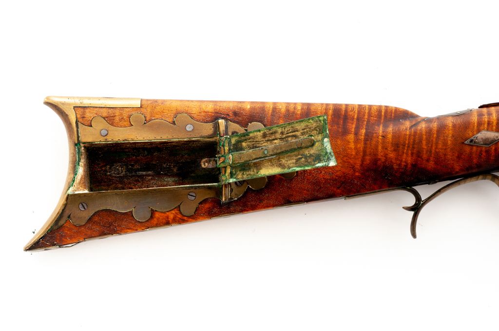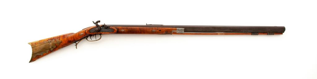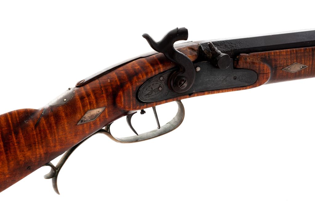 Antique American Halfstock Percussion Plains Rifle, by W. Cooper, NVSN, .38 cal., 34.5'' heavy octagonal barrel marked ''W. Cooper'' on top flat with a dovetailed low blade front sight and dovetailed adjustable buckhorn style rear sight; percussion lockplate with engraved oval vignette of pheasants at rear and marked ''Goulcher'' amid a floral spray (partly obscured by pitting); brass furniture includes a large patchbox with hinged lid, buttplate with long bottom extension, sideplate, fancy triggerguard and three octagonal ramrod ferrules. Double set triggers. The artificially tiger-striped maple stock has six diamond inlays, a vacant circular nameplate behind barrel tang, and sunburst on its carved cheekpiece, all in German silver, and a large pewter nosecap. Made ca. mid-19th Century. Condition is very good, barrel having a dark age patina with moderate pitting at nipple area, lock with a gray-brown patina and erosion at drum; triggerguard, patchbox and buttplate with a cleaned patina. Stock shows a few scattered dings and honest age with a loss at nipple, a 1'' crack emanating from front of lockplate, and another to rear of nosecap, but is sound with nice color; hardwood ramrod is a likely replacement. Action is tight; bore is dirty but with deep rifling. This is just the type of rifle that traveled West with the pioneers, carrying out America's Manifest Destiny wherever it went. Est: $450-$850. (Antique)