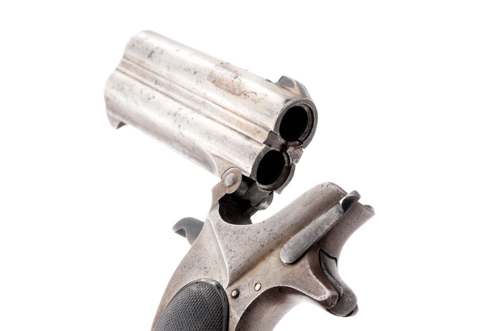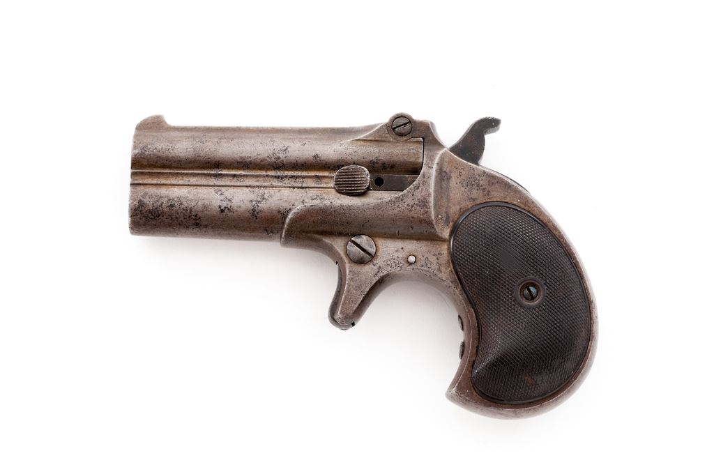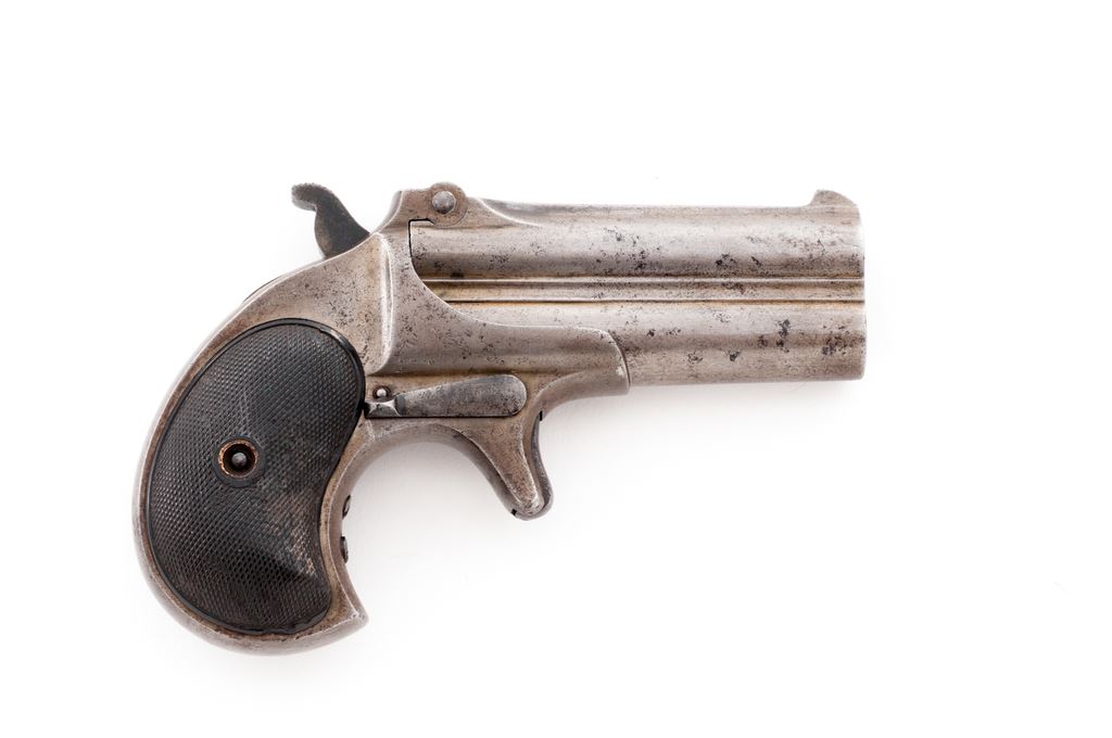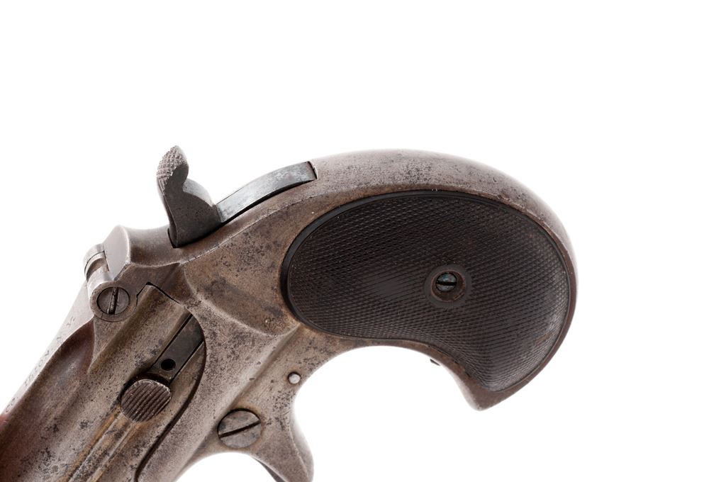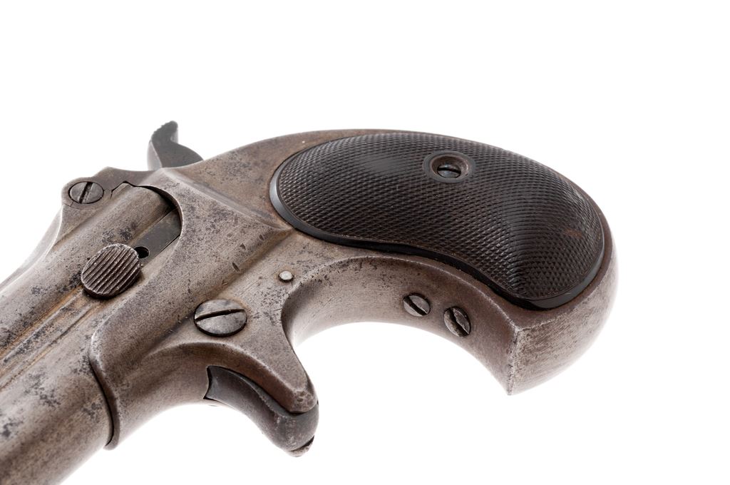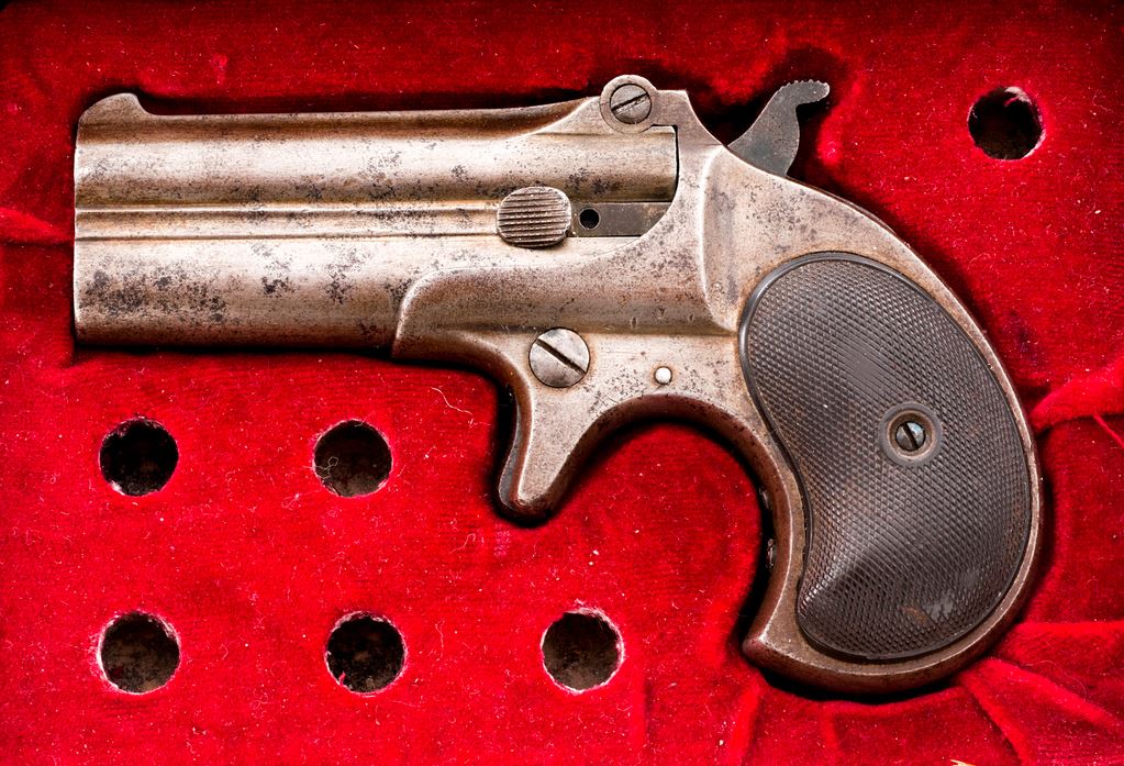 Cased Remington Over/Under Spurtrigger Cartridge Double Deringer, #788, 3'' round barrel group, .41 RF cal., originally blued finish, with finely checkered two-piece black hard rubber grips. Condition is very good, retaining no original finish and a smooth gunmetal gray color; screw slots are straight and unmarred. There is a tiny hairline crack on frame at barrel screw. Grips are matching in condition with light wear and flattening to checkering. Barrel hinge is strong and secure but does not lock up properly, action is crisp, bores are shiny with distinct rifling. Modern oak case with red velveteen interior fitted to gun, spaces for 6 cartridges and a working key. Est.: $450-$650. (C& R/PPT)