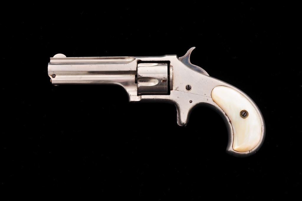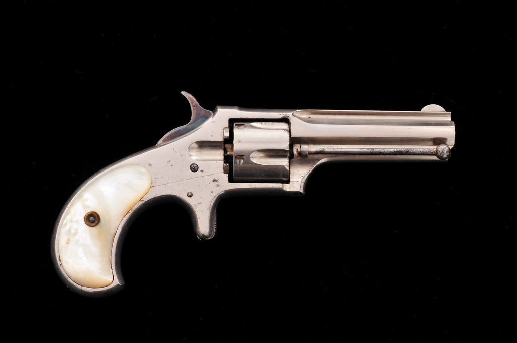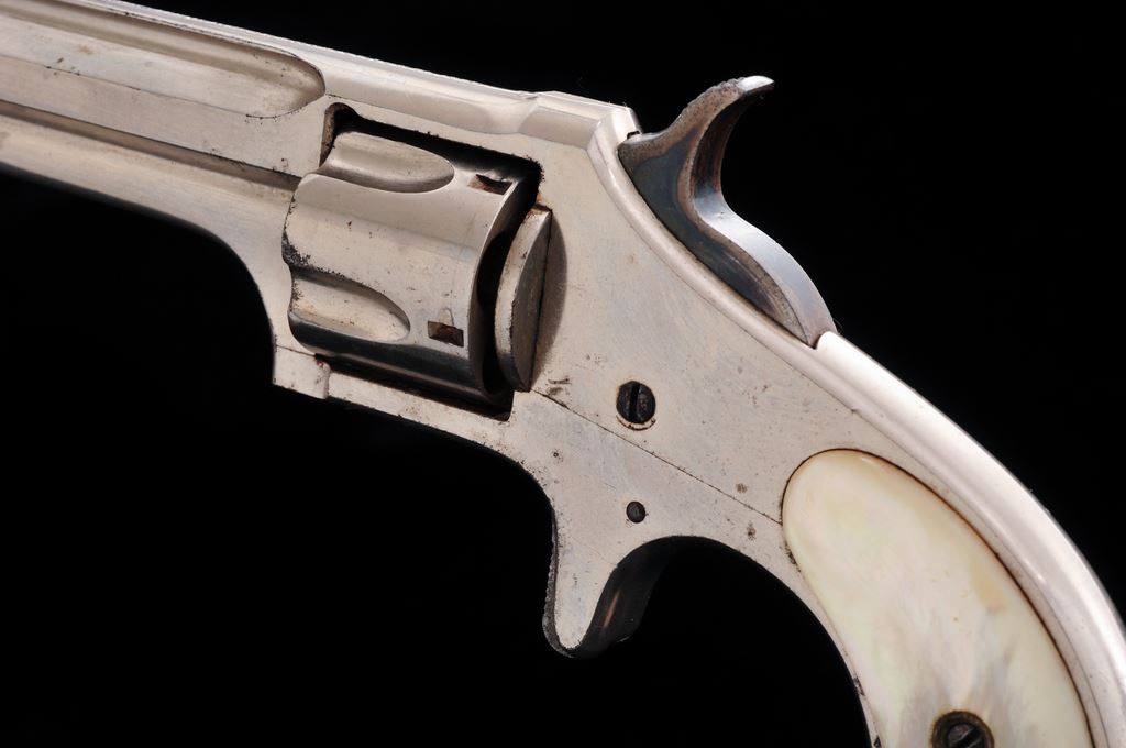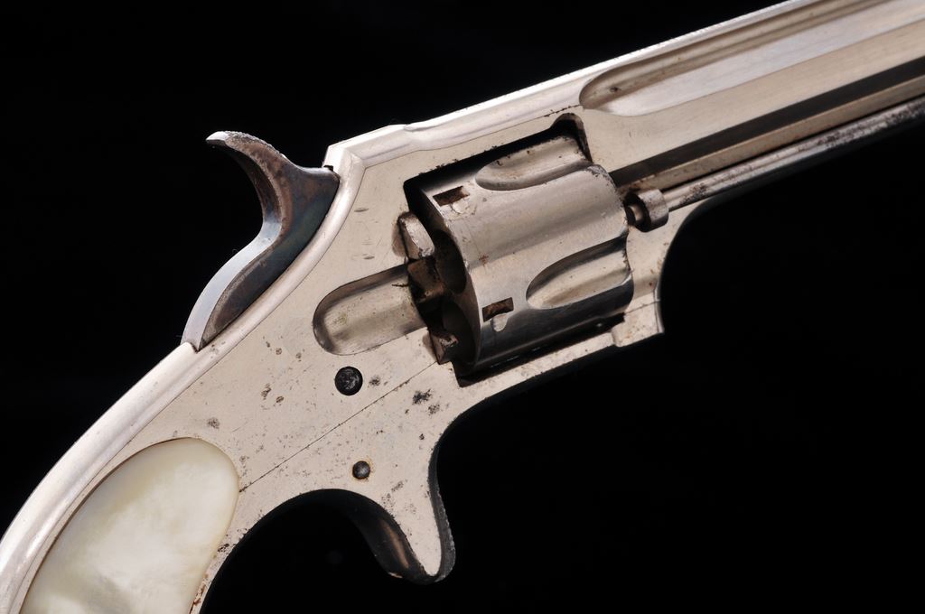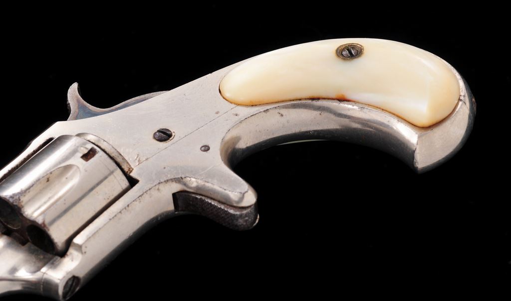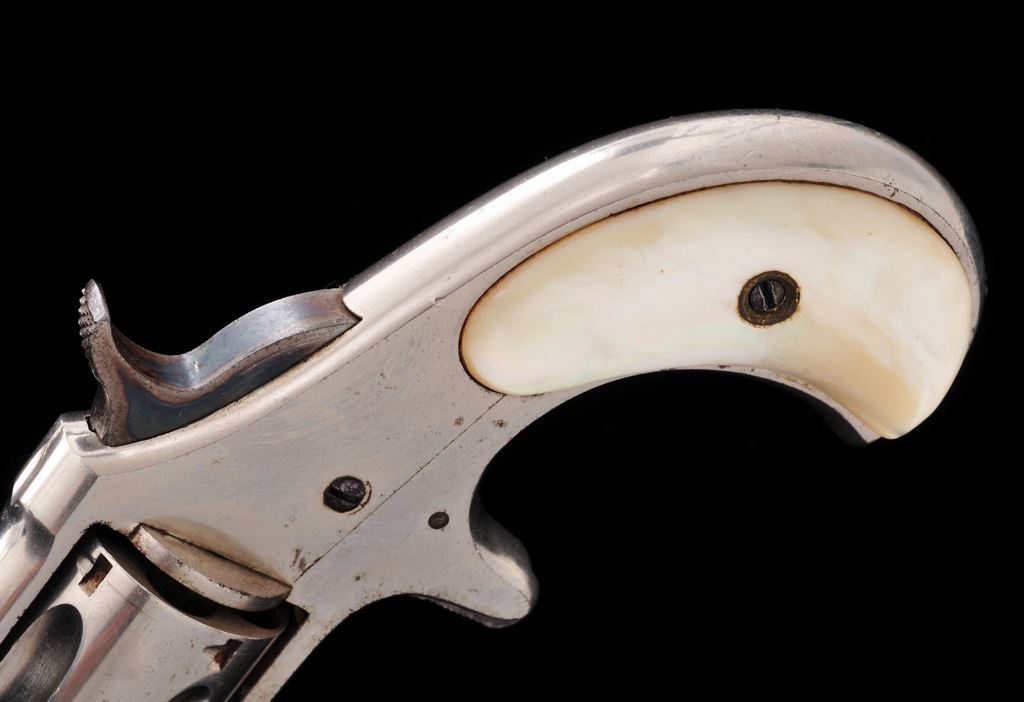 Remington Smoot's Patent No. 2 Spurtrigger Cartridge Revolver, #263, .32 RF Short cal., 2.75'' ribbed octagonal barrel marked ''E. Remington & Sons, Ilion, N.Y. Pat. W.S. Smoot Oct. 21, 1873'' in one line, originally finished in full nickel plate with case hardened hammer and trigger, and plain mother-of-pearl ''bird's head'' two-piece grips. Mfg'd. 1877-85, in a quantity of only 3000 pieces. Condition is near excellent retaining most original nickel (smooth, slightly dulled by age, with a few light marks), and strong case colors on hammer. Original pearl grips are perfect, showing brilliant figure and coloration and no chips or cracks. Action is smooth and sure; bore appears very good. A very collectible little Remington Smoot revolver, having lovely MOP grips. Est.: $400-$600. (Antique)