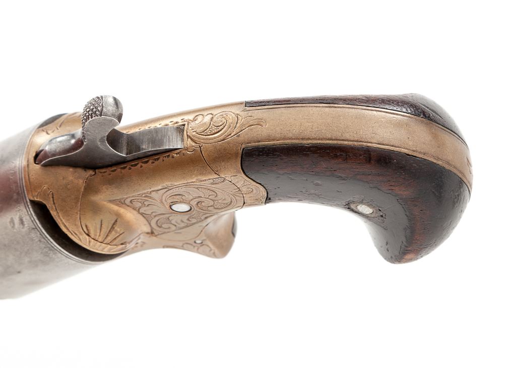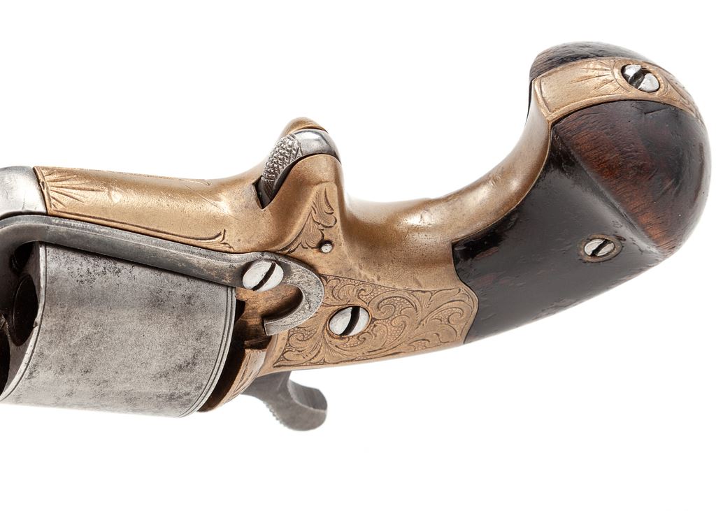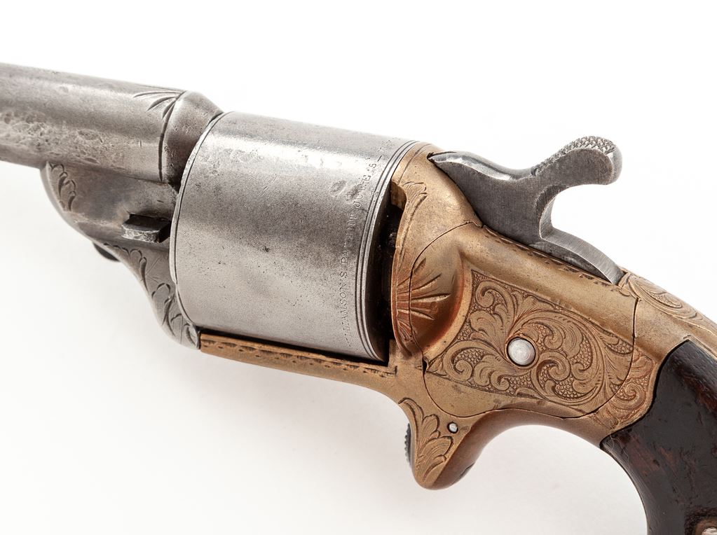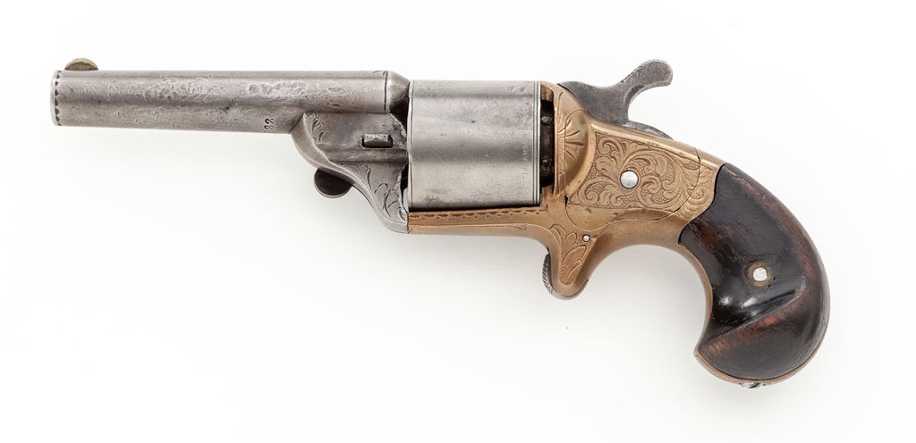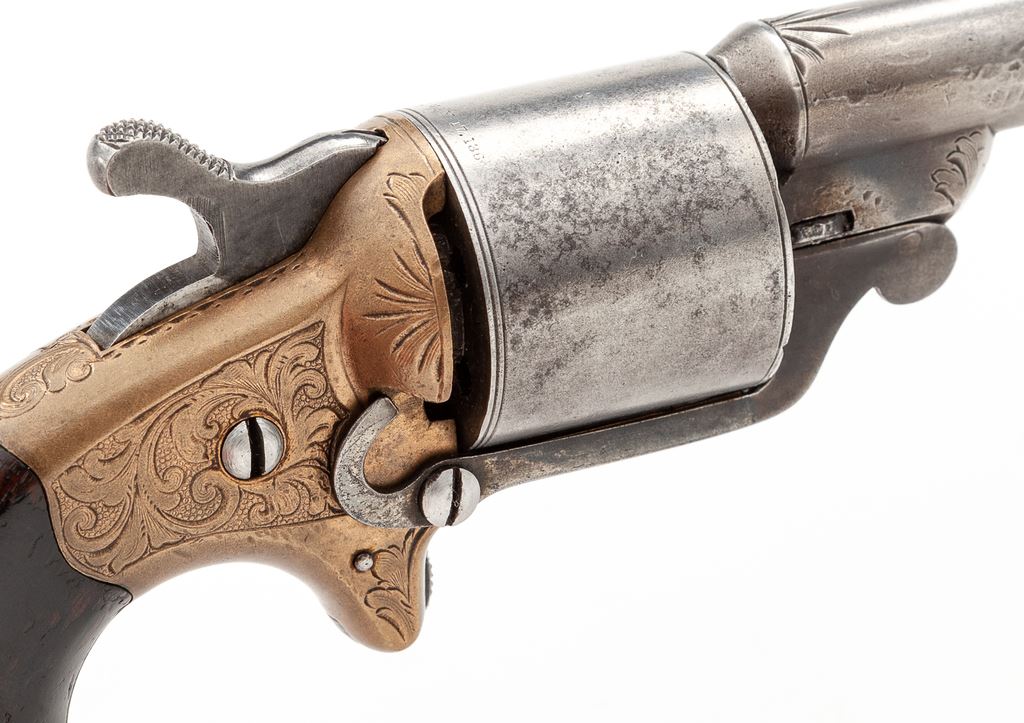 National Arms Co. Spurtrigger Cartridge Revolver, #27822, .32 Teatfire cal., 3.25'' round barrel marked ''National Arms Co. Brooklyn, N.Y.'' in one line, plain round cylinder has ''D. Williamson's Patent June 5-May 17 1864'' in tiny letters on circumference, bronze (or brass) frame with hooked extractor mounted to right side, two-piece varnished dark walnut ''bird's head'' grips. Mfg'd ca. 1864-70. Originally finished with blued barrel and cylinder, silver-plated frame and case hardened hammer. This revolver uses the distinctive front-loading ''teatfire'' metallic cartridge jointly designed by Daniel Moore and David Williamson to evade Colt's rear-loading cartridge patent. Fine floral hand engraving covers much of the frame, butt, barrel lug and breech. Condition is very good retaining no original finish, with a gunmetal gray to steel parts and clear markings. Grips show wear and retain approx. 50% original varnish finish. Action is firm; bore appears clean with distinct rifling. Est.: $350-$500. (Antique)