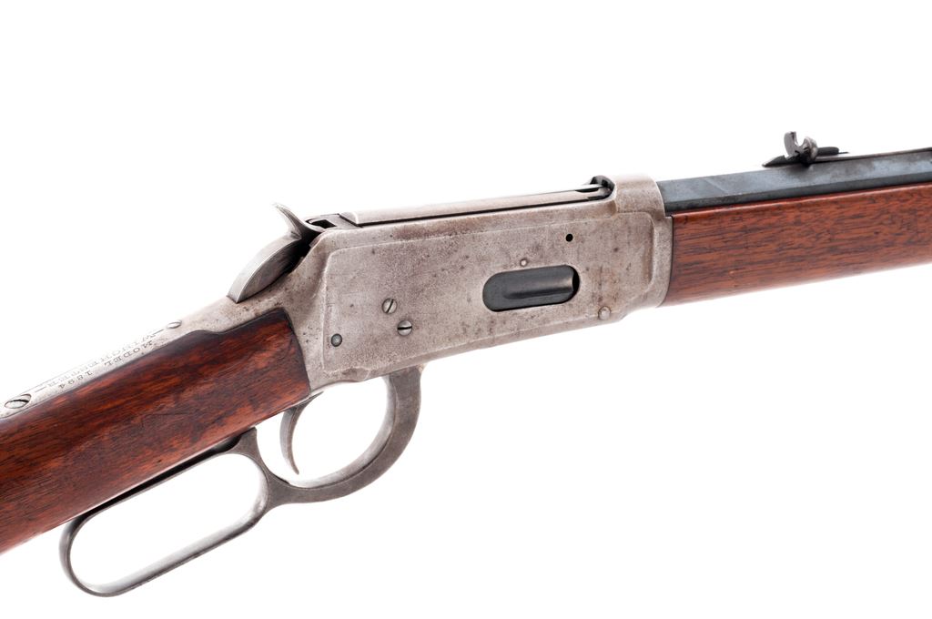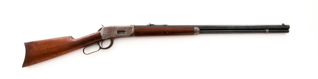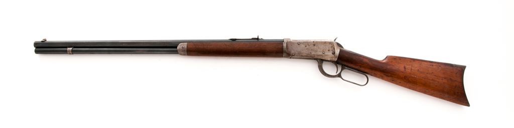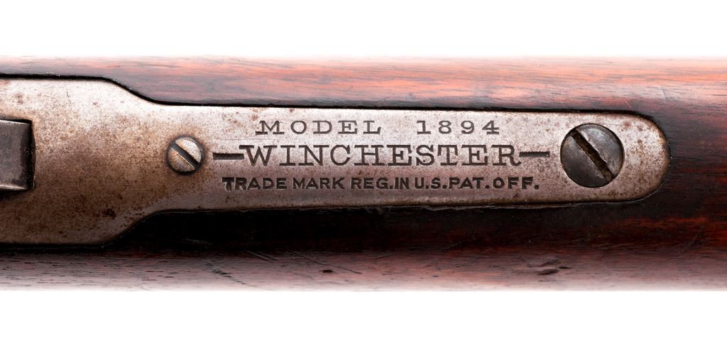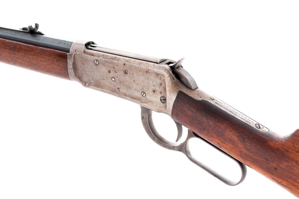 Winchester Model 1894 Lever Action Rifle, #471226, .32 WS cal., 26'' nickel steel octagon barrel, blue finish, straight grip walnut stock, crescent steel buttplate, dovetailed blade front sight, with sporting elevator rear sight. Barrel with two-line ''August 21, 1894'' patent date address and is additionally marked on the left barrel flat ''NICKEL STEEL BARREL / ESPECIALLY FOR SMOKELESS POWDER'' - ''32 W.S.'' Top of barrel and receiver are Winchester proofed. Mfg'd 1908. Condition is good overall. Barrel and magazine tube with approx. 93% original blue finish and some light surface freckling; protected areas with patches of built-up dirt and grime from prolonged storage and would improve with a thorough cleaning; barrel address is clear. Receiver and lever are silvery gray metal with intermittent dark spotting. Buttplate is dark with some light surface rust. Buttstock and forend fit tight at the adjoining metal surfaces; overall the wood shows age and wear consistent with the rest of the rifle, including scattered scratches and impressions and an older coat of added finish. Action is crisp. Bore rates as good for its age with some light pitting. Est.: $600-$800. (C&R)