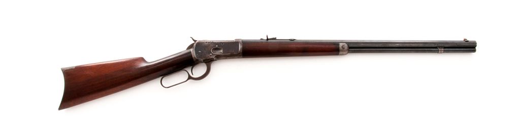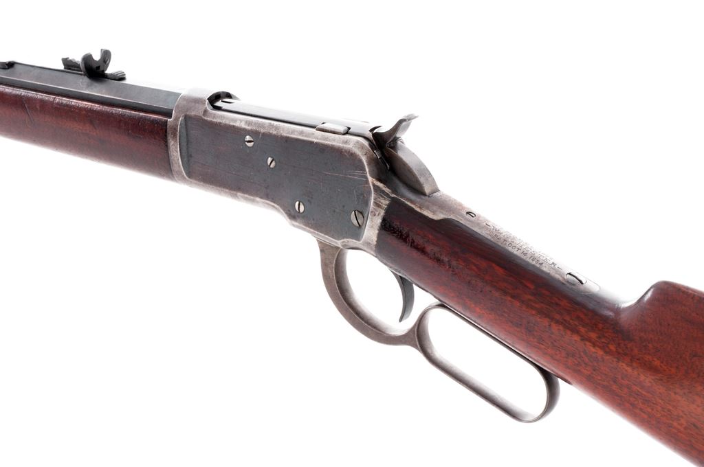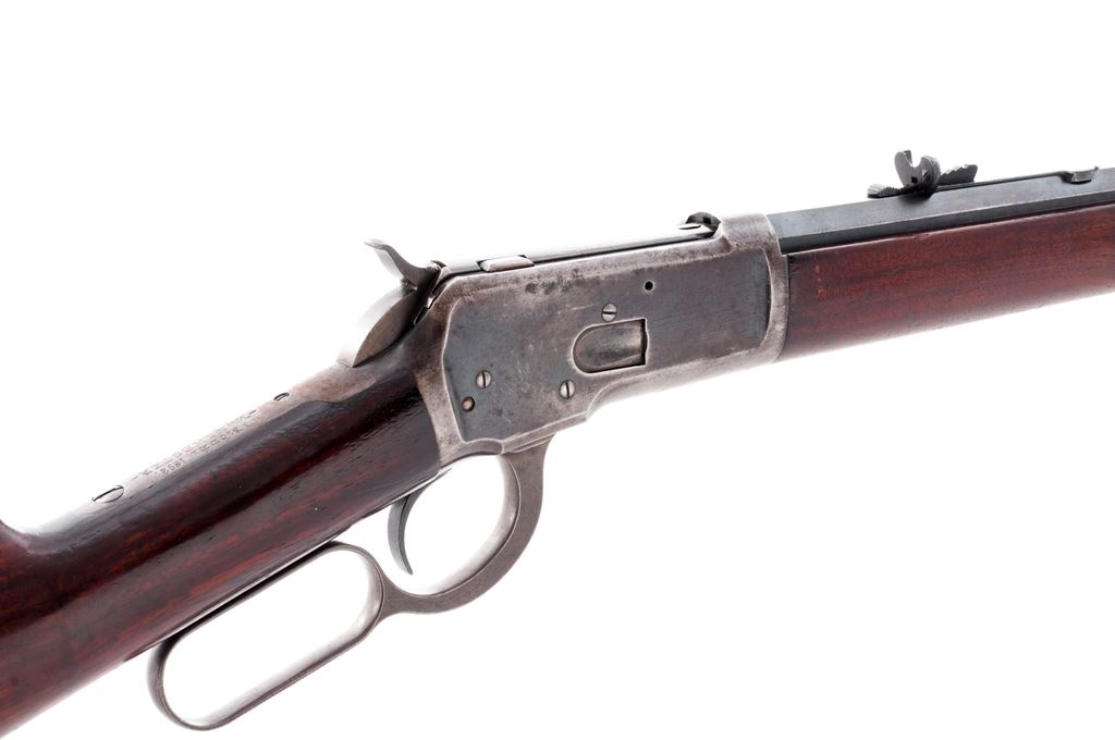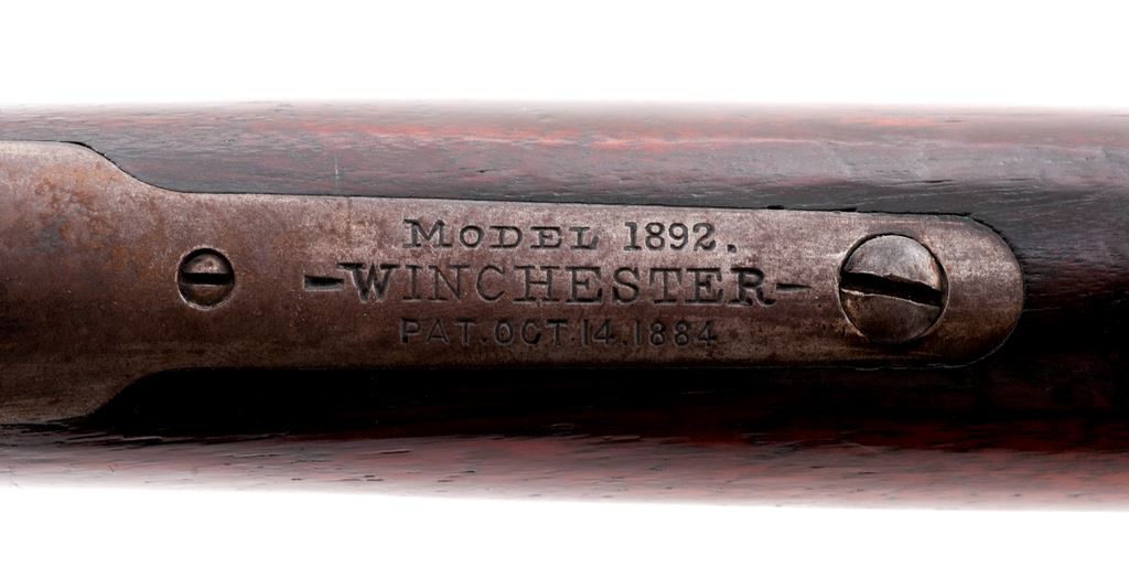 Winchester Model 1892 Lever Action Rifle, #201692, .25-20 cal., 24'' octagon barrel, blue finish, straight grip walnut stock, crescent steel buttplate, dovetailed blade front sight, with semi-buckhorn rear sight. Barrel address reads ''MANUFACTURED BY THE / WINCHESTER REPEATING ARMS CO. NEW HAVEN, CONN. U.S.A.'' and is additionally marked on top barrel flat near the receiver ''25-20 W.C.F.'' Mfg'd 1902. Condition is good overall. Barrel and magazine tube retain approx. 80%-85% thinning and lightly toning original finish; barrel address is clear. Receiver with approx. 50% toning blue, the balance a combination silvery gray with some cloudy darkening. Wood fits tight at the adjoining metal surfaces and overall shows age and wear consistent with the rest of the rifle, including scattered scratches and impressions and an older coat of added finish. Action is crisp with a smooth hammer and trigger. Bore is good for its age with general light to moderate pitting. Est.: $700-$900. (C&R)