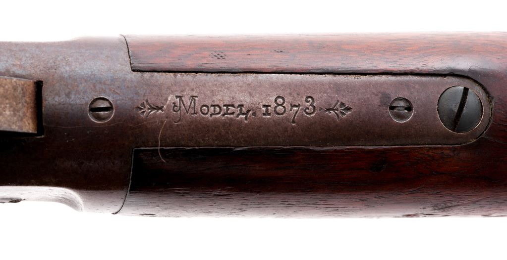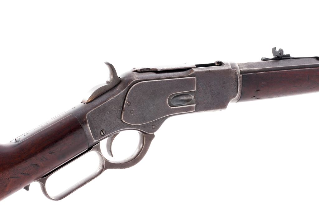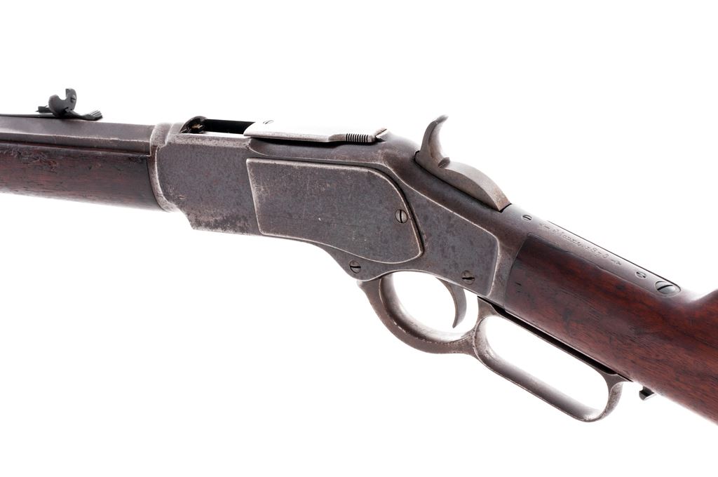 Antique Winchester Model 1873 Third Model Lever Action Rifle, #363640, .32 WCF cal., 24'' octagon barrel, straight grip walnut stock, crescent steel buttplate, dovetailed front sight with silver blade and semi-buckhorn rear sight, and standard two-line ''King's Improvement'' address. Upper tang is marked ''Model 1873'' with foliate design on each side. Mfg'd 1891. Condition is good. Metal is mostly brown with silver colored highlights; receiver and parts of the lever with a small amount of cleaned oxidation; factory lettering is clear. Buttplate with general pitting and some patches of surface rust. Wood shows age and wear consistent with the rest of the rifle and fits good at the adjoining metal surfaces; forend shows a little more age and wear; buttstock is dark around the buttplate. Good action and bore. Est.: $800-$1,200. (Antique)