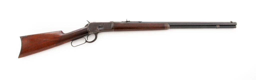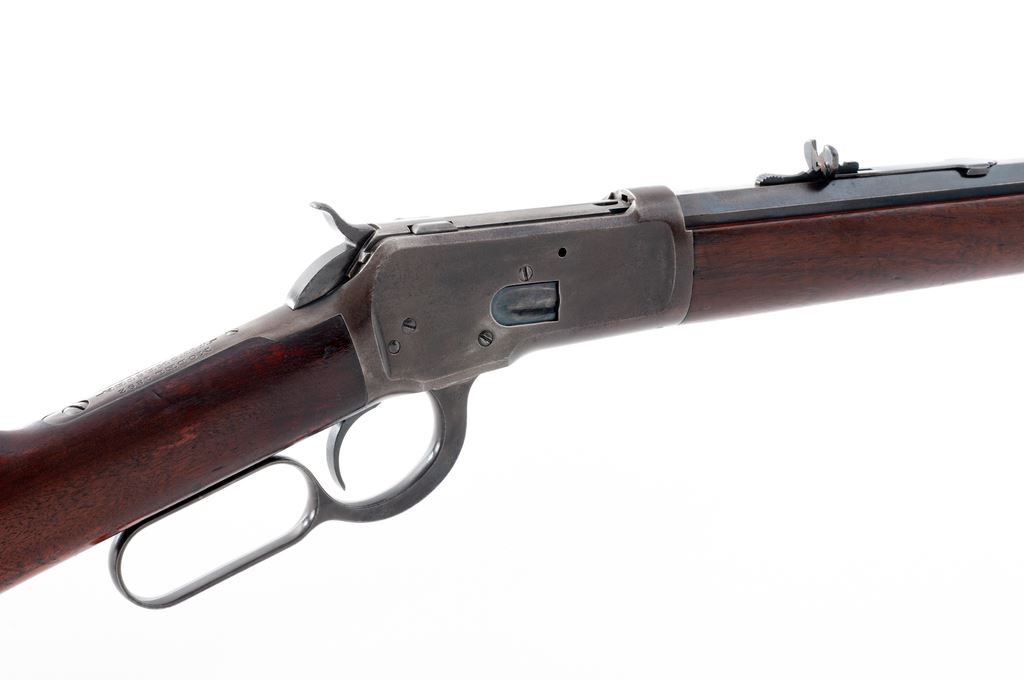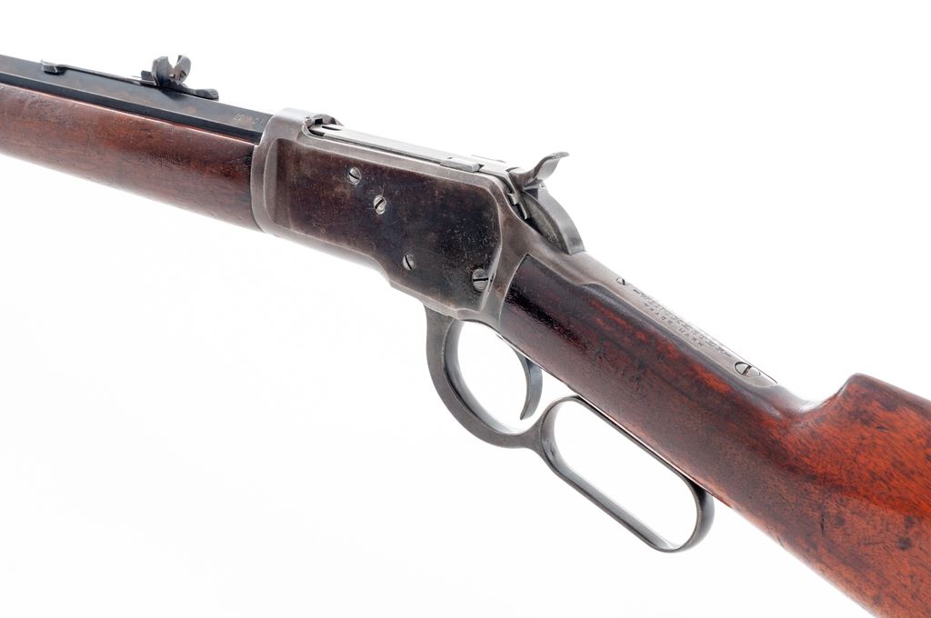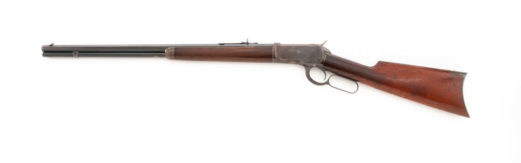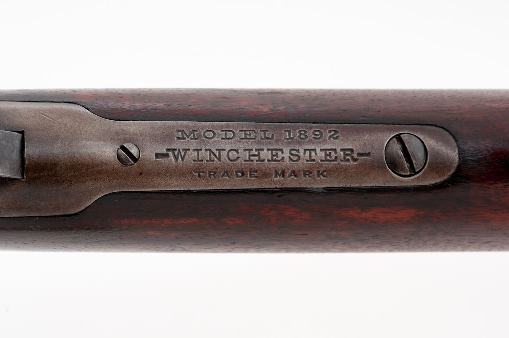 Winchester Model 1892 Lever Action Rifle, #445097, .32 WCF cal., 24'' octagonal barrel, blue finish, walnut stock and forend, with crescent steel buttplate, with standard front and rear sights. Mfg'd 1908. Condition is about fine. Barrel and magazine tube retain approx. 85% thinning blue; forend cap about 25%. Frame, lever, and hammer show approx. 80% thinning and toning blue. Screw slots are mostly straight and true. Stock with general overall scuffs and scratches; varnish is thin at wrist and to forend. Good action and bore. Est.: $600-$800. (C&R)