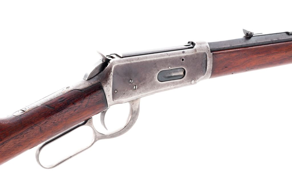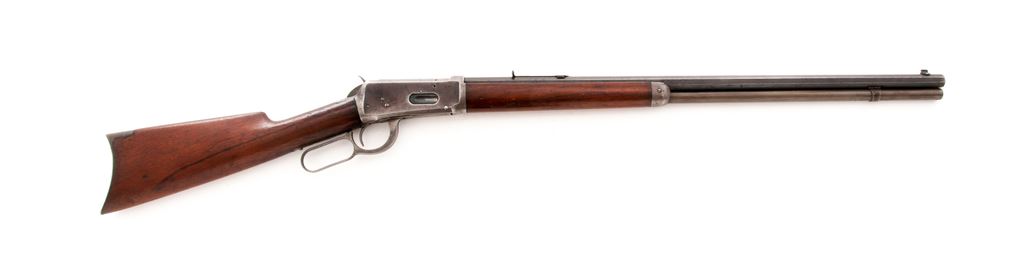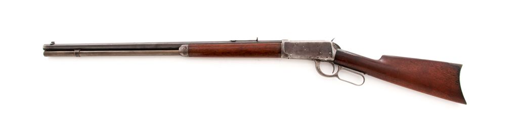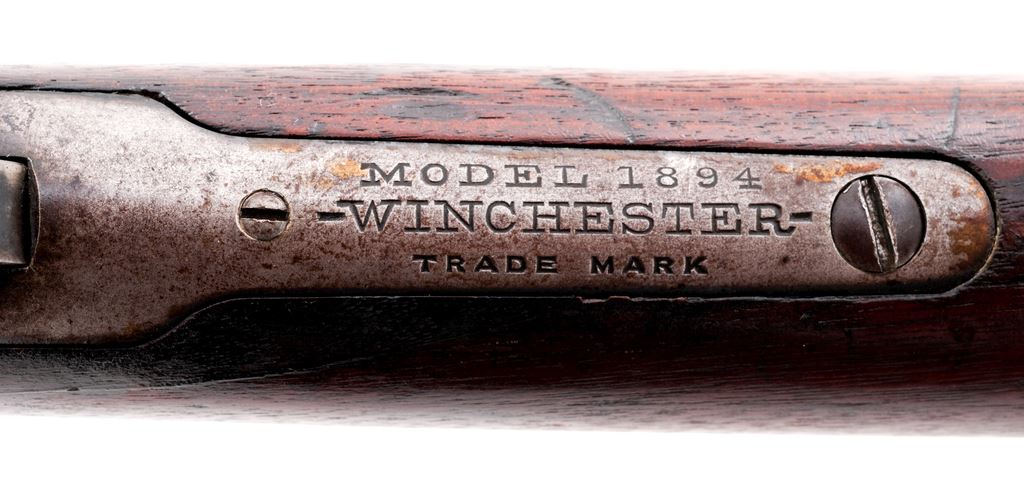 Winchester Model 1894 Lever Action Rifle, #405809, .32-40 cal., 26'' octagon barrel, blue finish, straight grip walnut stock, crescent steel buttplate, dovetailed Marble's #3 front sight, with flat-top sporting rear sight. Top barrel flat with two-line ''August 21, 1894'' patent date address and is additionally marked on the left barrel flat ''32-40''. Top of barrel and receiver are Winchester proofed. Mfg'd 1907. Condition is good overall. Barrel retains a majority of thinning blue turning brown finish; barrel address is clear. Rear sight elevator is missing. Receiver and lever are silvery gray metal with intermittent spotting and cloudy darkening to the metal. Buttplate is moderately pitted. Overall the wood shows age and wear consistent with the rest of the rifle, including scattered scratches and impressions and an older coat of added finish; forend has been lightly sanded and is lighter in color; left side of the wrist with a hairline crack but appears solid. Action is crisp with a smooth hammer and trigger. Bore is fair as moderately pitted overall. Est.: $600-$800. (C&R)