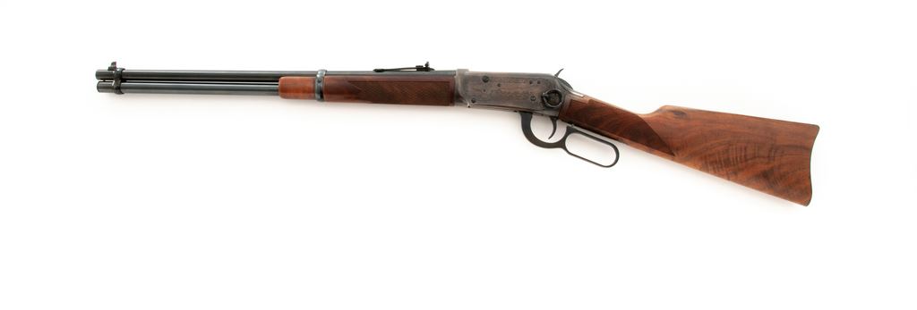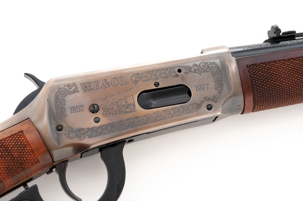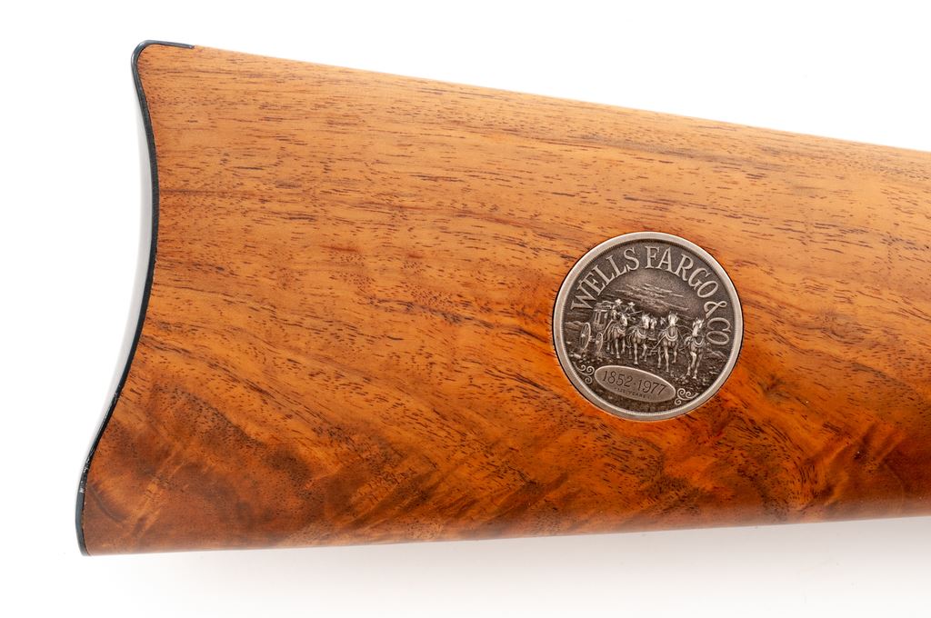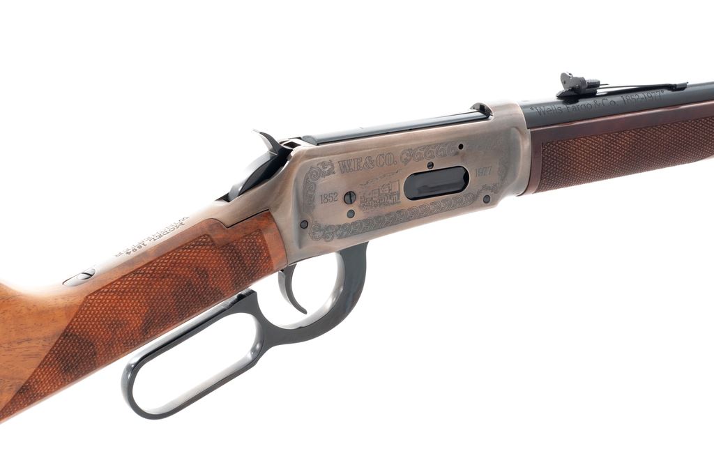 Winchester Model 94 Wells Fargo Commemorative Lever Action Carbine, #WFC05900, .30-30 cal., 20'' round blued steel barrel with standard sights; right side is marked ''Wells Fargo & Co. 1852-1977''. Receiver with an antique type silver finish with case colored highlights and commemorative engraving to both sides. Straight grip checkered walnut stock and forend with blued steel buttplate; right side of buttstock with inlaid commemorative medallion. In original box with matching end label, hang tag, owner's manual, and other misc. factory paperwork. Rifle is in fine overall condition and appears unfired. Approx. 99% original blue finish remains with a spot of light pitting to the magazine tube. Rear portion of receiver with a thin and shallow vertical scratch on right side. Wood is excellent with sharp checkering; right side of buttstock is just a little faded from being used as a display in the casino. Bore is like new. Polychrome slipcover shows moderate storage wear and is a little tattered around some of the edges but rates as very good overall; one of the end pieces on the lower styrofoam carton is missing. Approx. 20,000 of these rifles were mfg'd in 1977. Est.: $400-$600. (C&R)(Sierra Sid's Casino, Sparks, NV.)