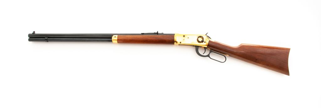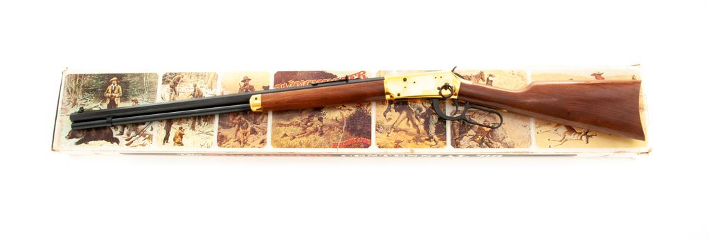 Winchester Centennial '66 Commemorative Lever Action Rifle, #81348, .30-30 cal., 26'' blued steel octagon barrel with standard sights; gold-colored receiver, crescent buttplate, and forend cap. Rifle also features a gloss-finished straight grip walnut stock and saddle ring. In original box with matching end label, hang tag, and warranty card. Rifle appears unfired and is in excellent overall condition. All of the original blue finish remains. Gold-colored receiver with some slight micro-scratching. Wood is also excellent with a few shallow handling marks at the forend and wrist. Bore is like new. Polychrome slipcover shows moderate age and wear. Est.: $450-$650. (C&R)(Sierra Sid's Casino, Sparks, NV.)