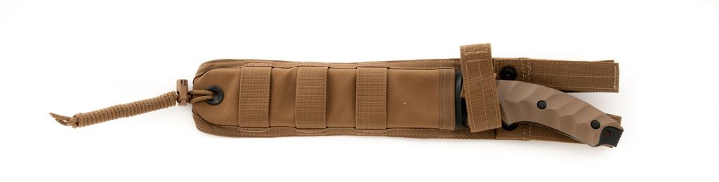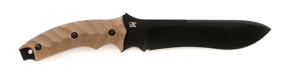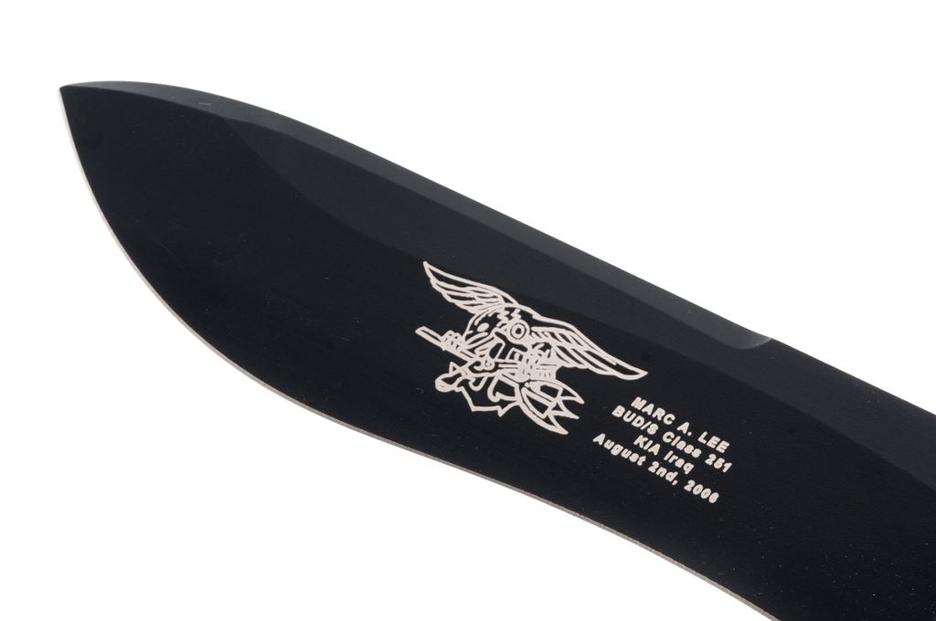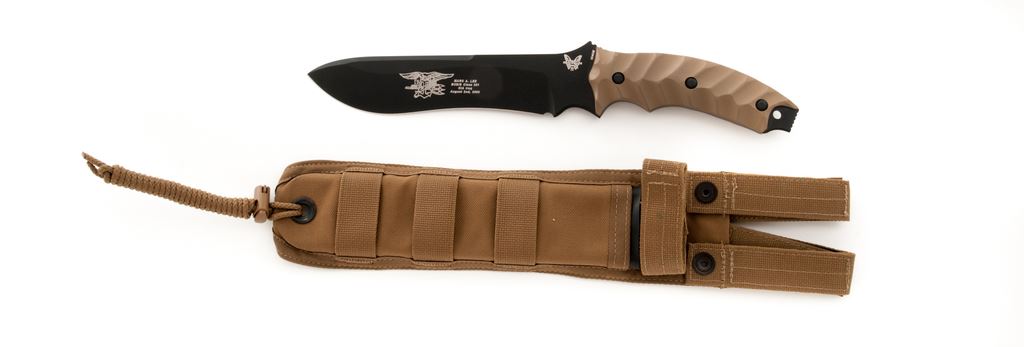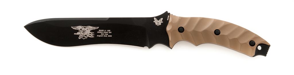 Bench-made Marc Lee Tribute Fixed Blade Tactical Knife, with sheath, 7-1/4'' drop-point re-curve blade with matte black finish. Designed by Eddie Killian to honor Marc. A. Lee, who was the first Navy Seal killed in Iraq since the beginning of combat in 2003. One side of blade with the Navy Seal logo and lettering commemorating Marc. Lee. Features grooved coyote brown G10 handles with a tan nylon Molle compatible sheath. Overall condition is excellent, never carried or sharpened. Right grip with a few spots of minor high edgewear from being stored in the sheath. Est.: $200-$300.