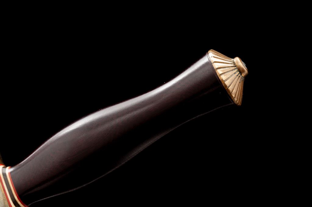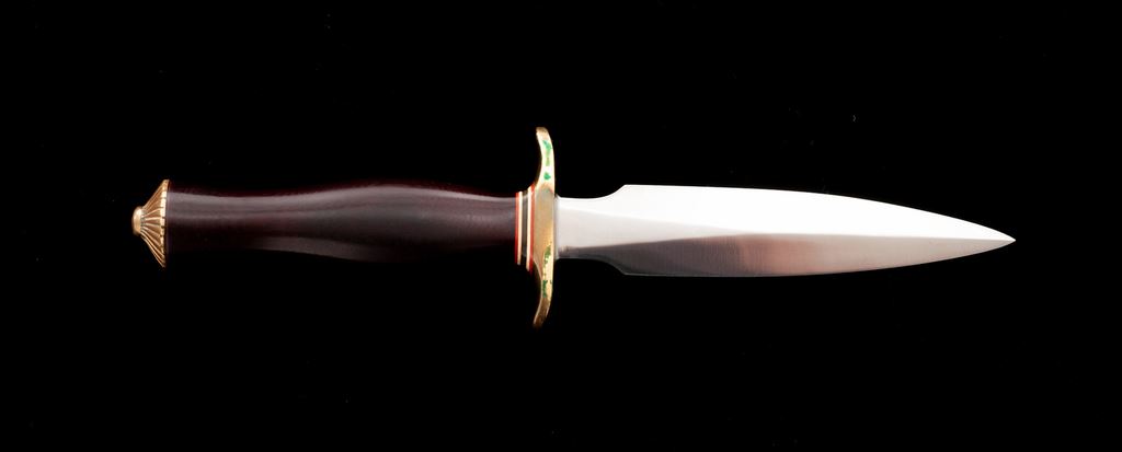 Randall Model 2-5 ''Fighting Stiletto'', with sheath, 5'' blade with standard Randall logo, 9-5/8'' overall, commando shaped maroon micarta handle, double brass hilt with red, white, and thicker dark spacer, and scalloped brass ''coolie'' pommel cap. In rough-back leather Randall sheath with smooth nickel snap, and marked on back with Randall logo, as well as ''2 5''. Knife rates as very good+ overall. Blade appears to have been professionally reconditioned leaving the Randall logo a little soft; cutting edge with a few very shallow spots of cleaned pitting; backside with some faint vertical scratching. Brass shows normal moderate toning and spots of verdigris from being stored in the leather sheath. Micarta with a few light scratches and small handling marks. Sheath is also very good and shows moderate age and storage wear; keeper strap with some surface cracking; stitching and seams are excellent. Est.: $300-$400.