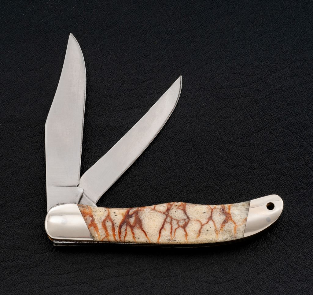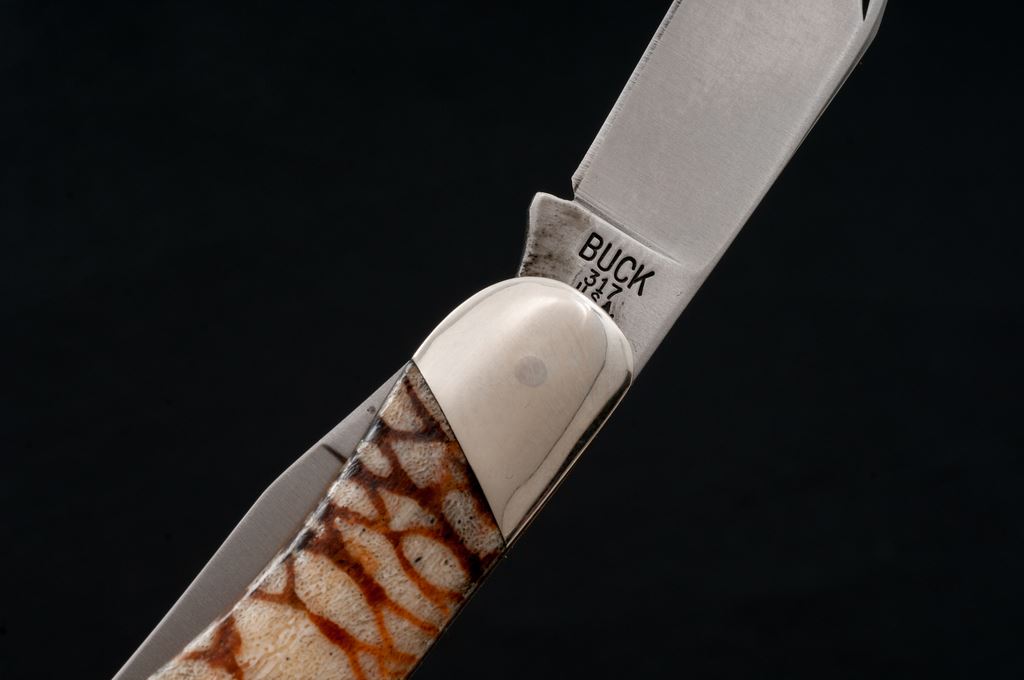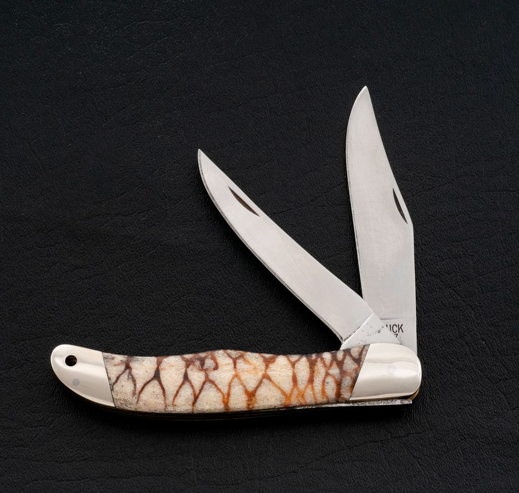 Buck 317 Trailblazer with Tiger Coral Handles, nickel silver bolsters, 4'' blades, one with three-line stamp (no date symbol), 5-1/4'' overall closed length. Condition is excellent, blades appear unused, bolsters with slight micro-scratching, handles with no chips or cracks. Est.: $200-$300.