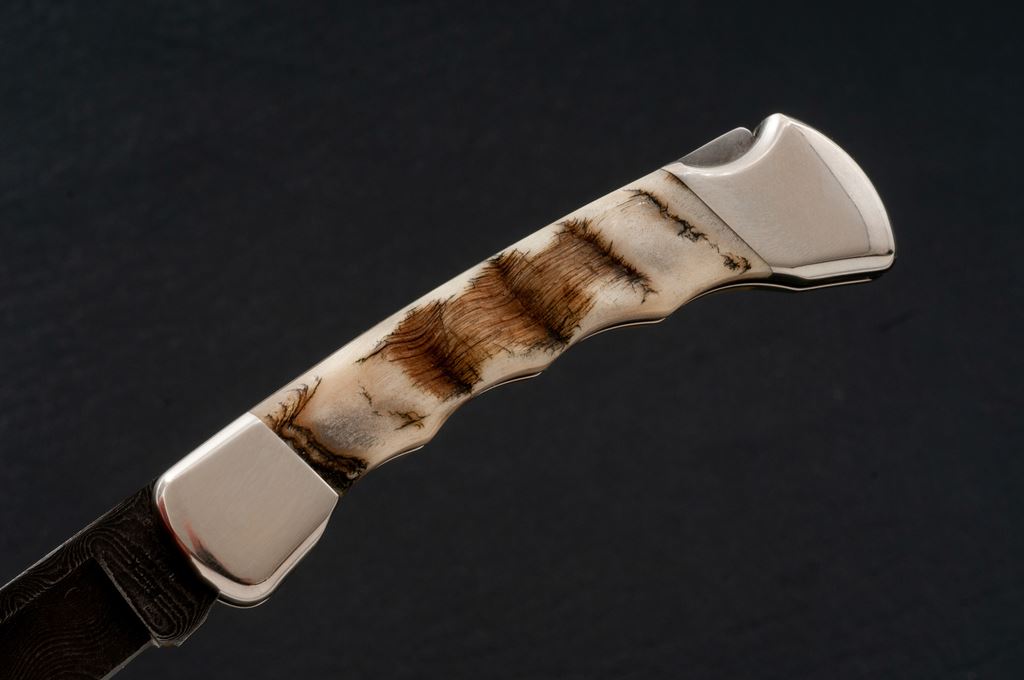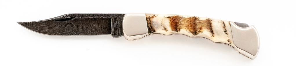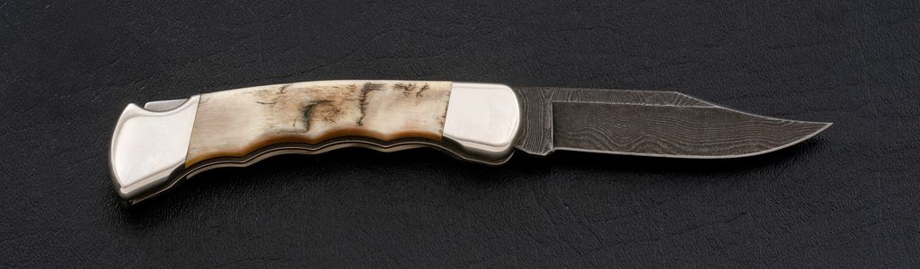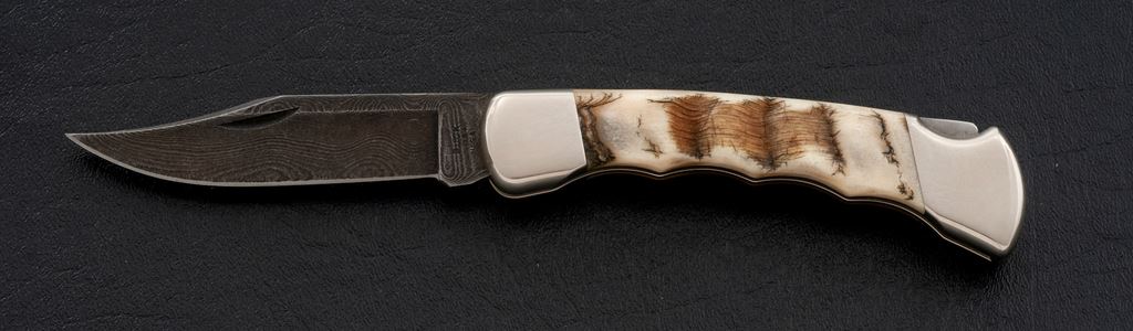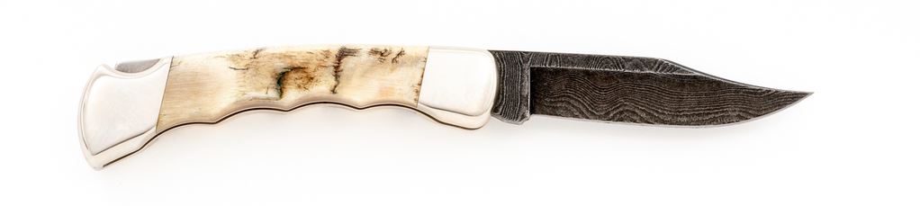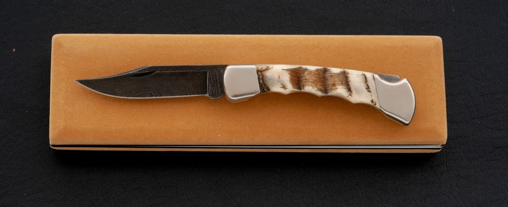 Custom Buck Model 110 Folding Knife, with Damascus blade and finger-groove ram's horn handle, nickel silver bolsters, 3-3/4'' blade with three-line stamp, mfg'd in 1991. In tan velvet clamshell case with plain white cardboard slipcover. In excellent as new condition, blade is mint, bolsters with light handling marks. Est.: $150-$250.