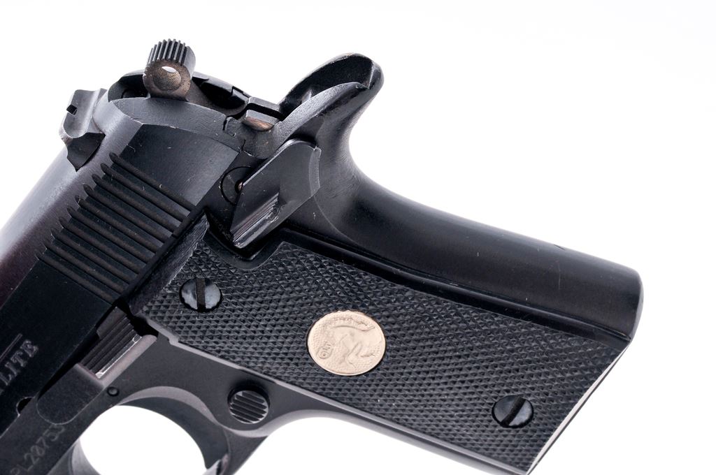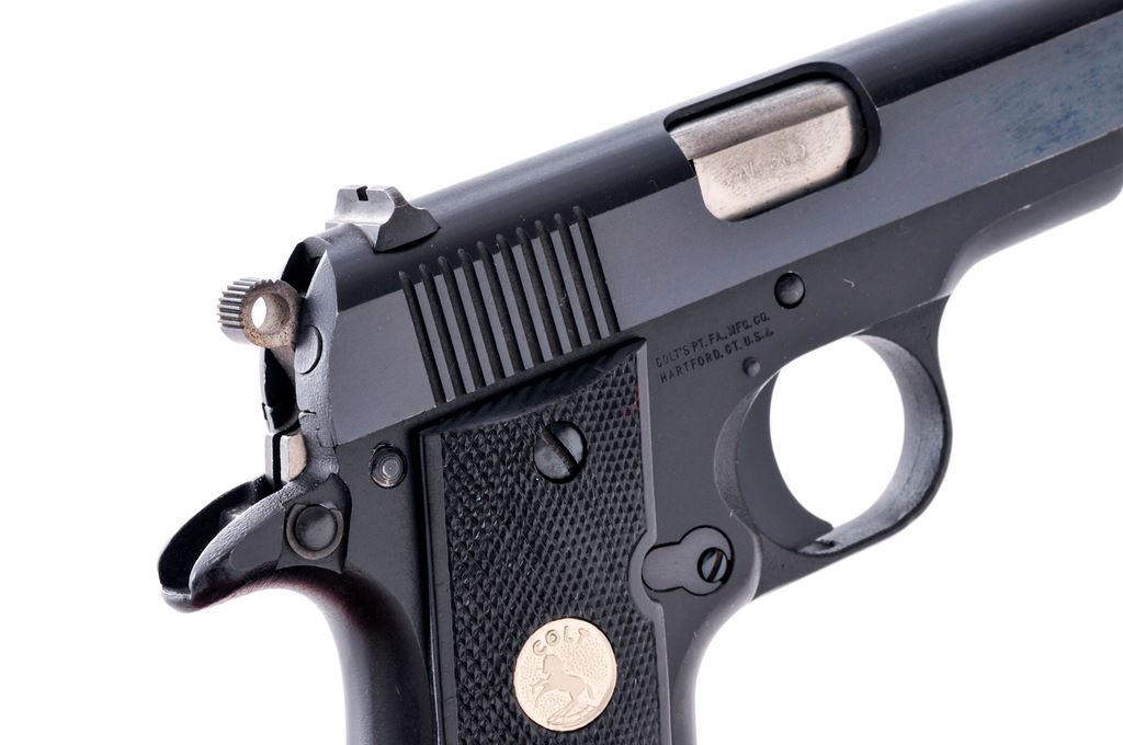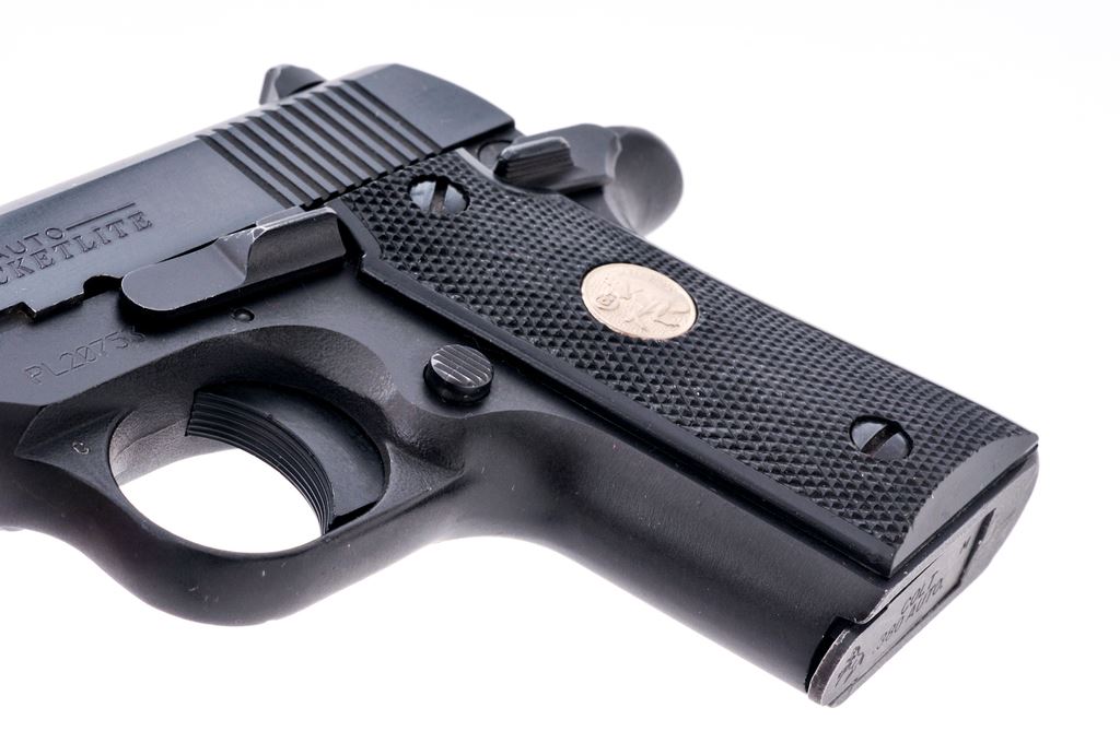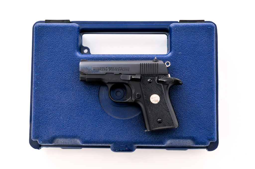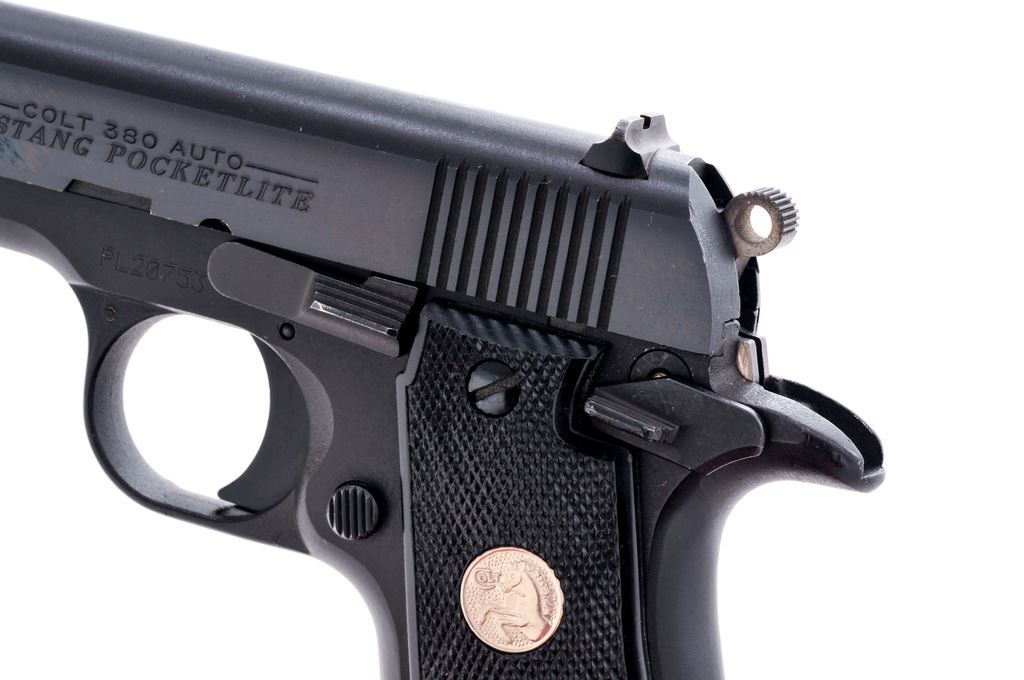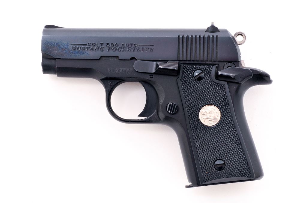 Colt Mustang Pocketlite Semi-Automatic Pistol, #PL20753, .380 ACP cal., 2.75'' barrel, blued steel slide, dark blue/black aluminum alloy receiver, factory checkered black composite grips with silver Colt medallions, standard fixed sights, and one factory magazine. In an original blue plastic Colt case that is missing the end label but is correct for this pistol. Condition is near excellent with approx. 99% factory finishes; edgewear accounts for any finish loss. Grips are excellent with sharp checkering and bright medallions. Right edge of the triggerguard with a small impression; right side of grip frame with a few small spots of slight peppering to the finish. Slide shows some very fine micro-scratching. Good tight and smooth action with a near excellent bore. Est.: $500-$700. (Modern) (Not available to Calif. residents.)