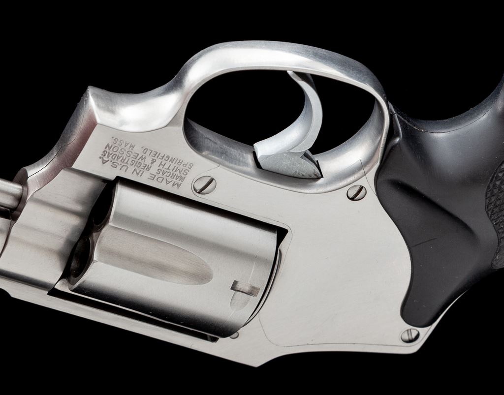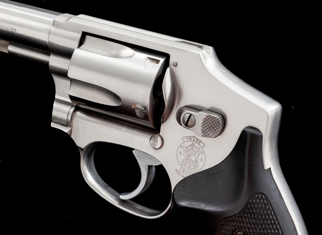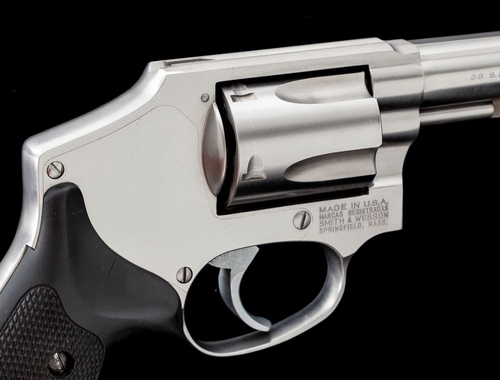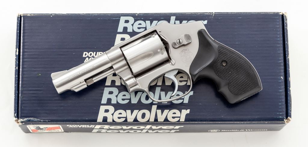 Smith & Wesson Model 640 Centennial Double Action Revolver, #BKK1097, .38 Spec. cal., 3'' barrel, satin stainless steel, hammerless, checkered finger-grooved black rubber grips, with standard fixed sights. In original one-piece S&W box with matching end label. Revolver shows normal signs of light range use and rates as fine overall. Metal with scattered light micro-scratching and small handling marks, most noticeable on the cylinder; cylinder with a thin index line. Factory lettering is crisp. Grips are excellent and show minimal wear. Action and bore are excellent. Est.: $350-$550. (Modern/PPT)