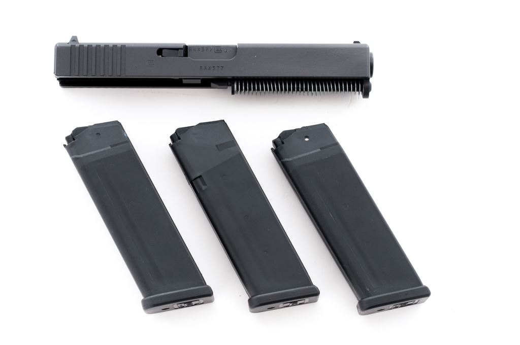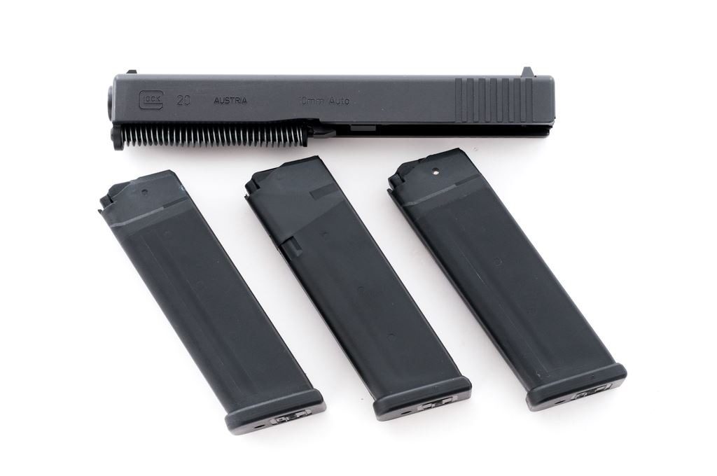 Glock Model 20 Barrel and Slide Assembly, with three (3) 10-round factory Glock magazines, 10mm cal., 4.5'' barrel, with black finish, white-dot front sight and white outline rear sight. Barrel and slide rate as excellent, appearing near new, bore is mirror bright. Magazines are very good and appear lightly used. Est.: $200-$300.