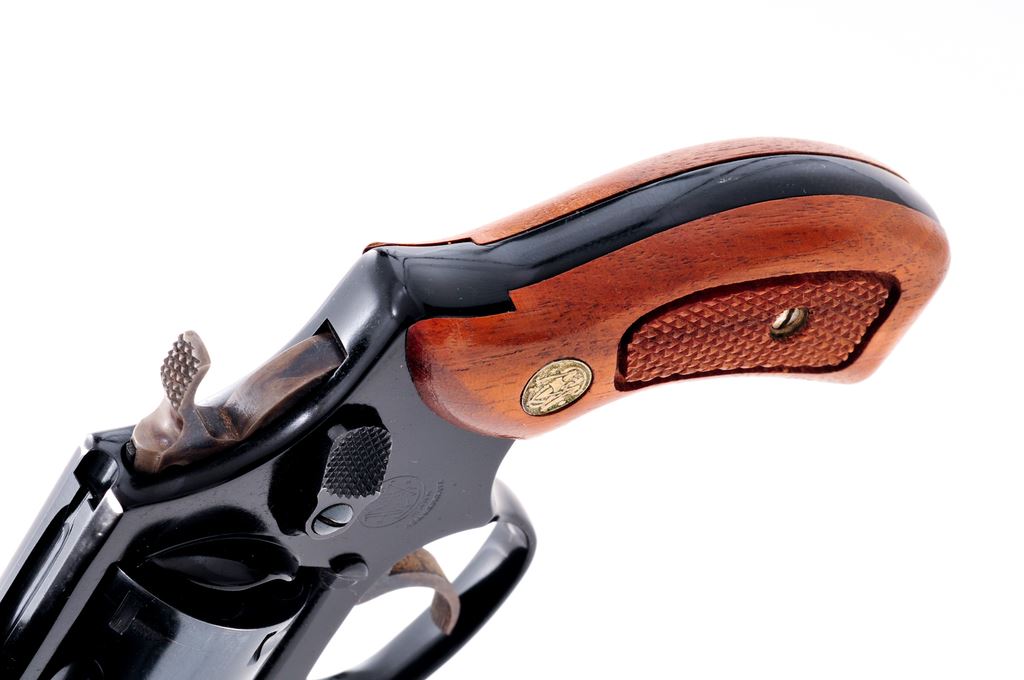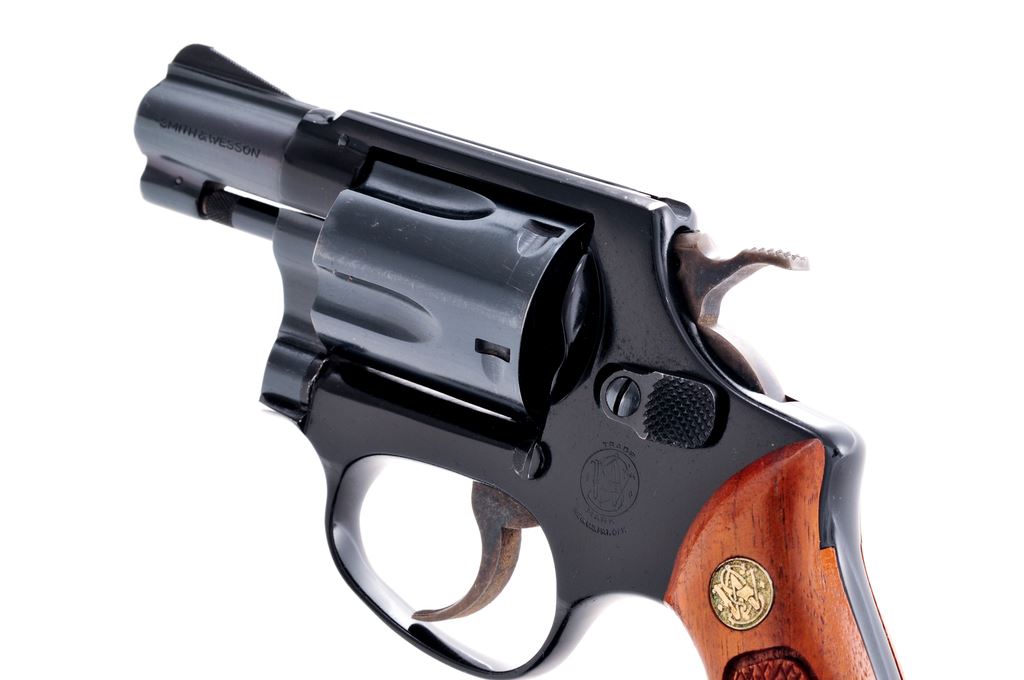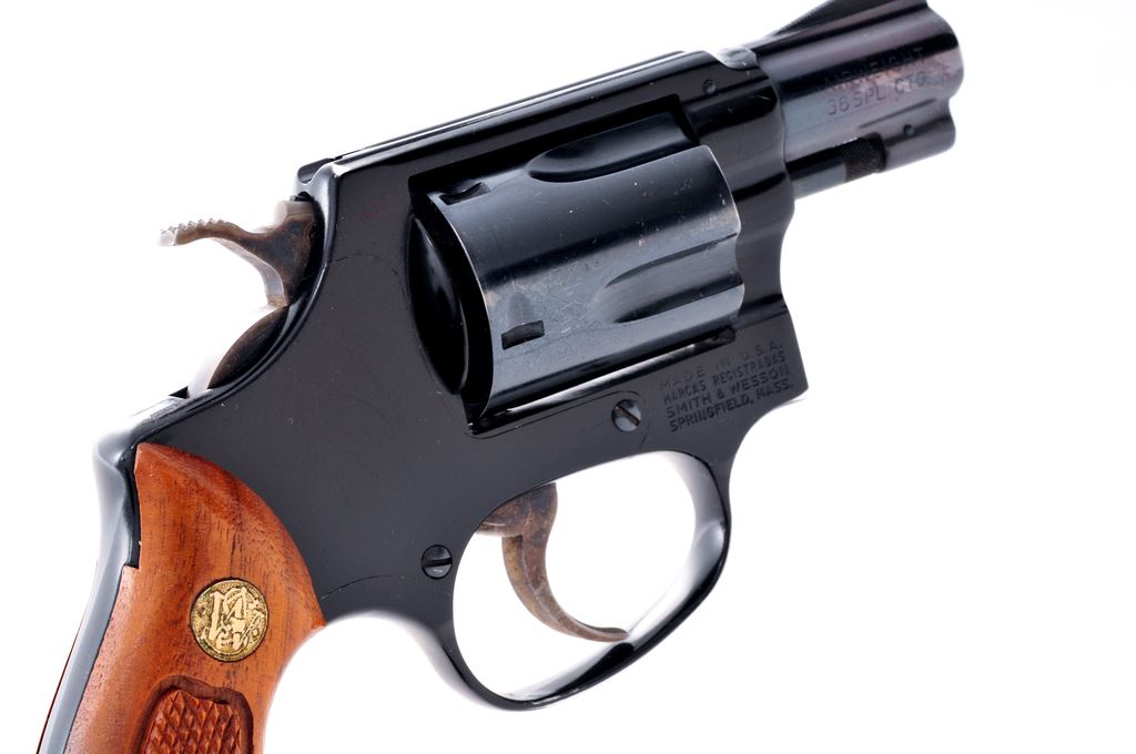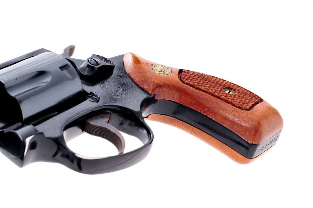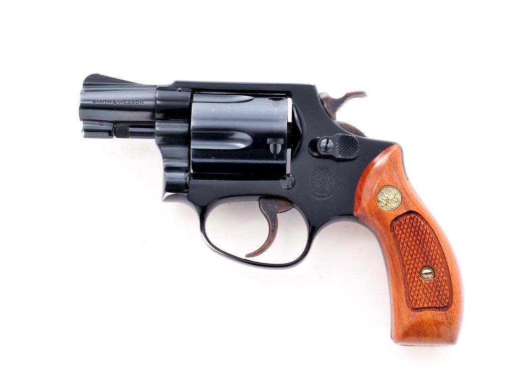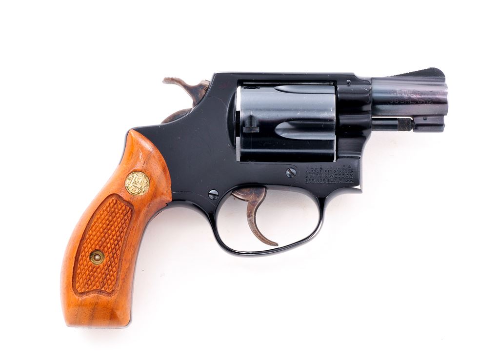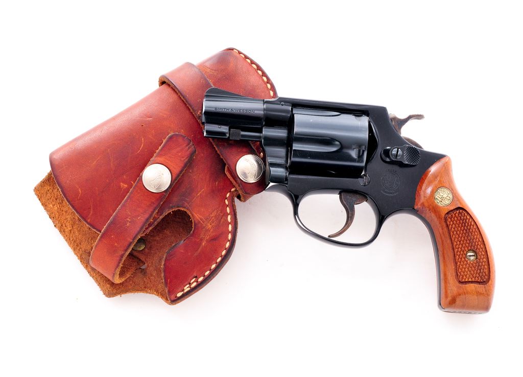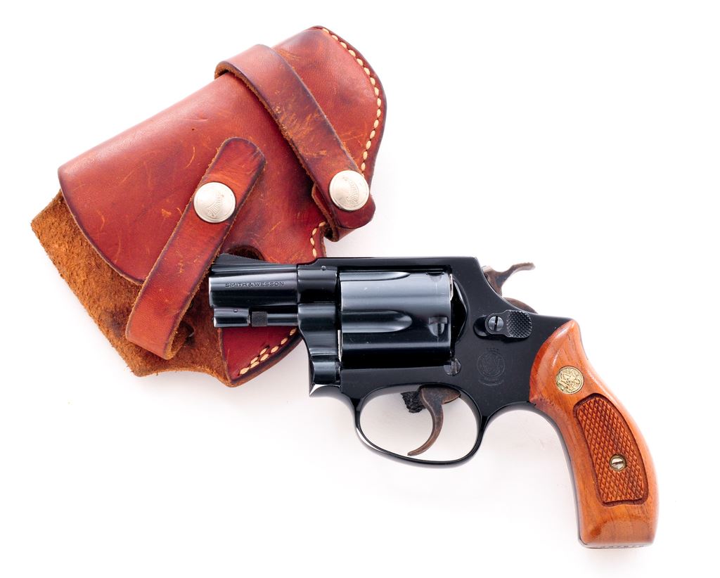 Smith & Wesson Model 37 Chief's Special Airweight Double Action Revolver, #J337872, .38 Spec. cal., 1-7/8'' pinned barrel, blue finish, darker blue/black alloy frame, factory checkered round butt walnut grips with S&W medallions; grips are numbered to the gun. Also featuring standard fixed sights, case hardened hammer and trigger. In brown leather holster, by Hunter. Mfg'd approx. 1975-1976. Approx. 97% original finish remains and metal surfaces rate as fine overall. Wear to highpoints near the rear sight and lower portion of the frame in front of the triggerguard account for a majority of the finish loss. Cylinder with light scratching and a thin index line. Factory lettering is legible. Grips are near excellent showing just a few minor handling marks and toning to the medallions. Hammer and trigger with 95%+ case colors. Action is smooth and crisp with a near excellent bore. Holster shows moderate scuffs and scratches. Est.: $450-$650. (Modern/PPT)
