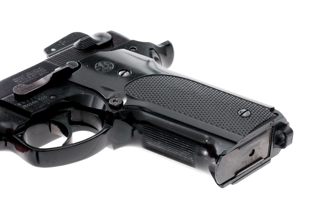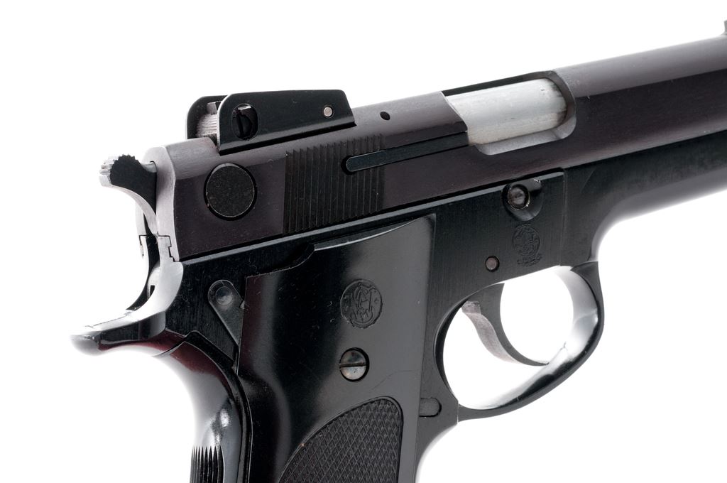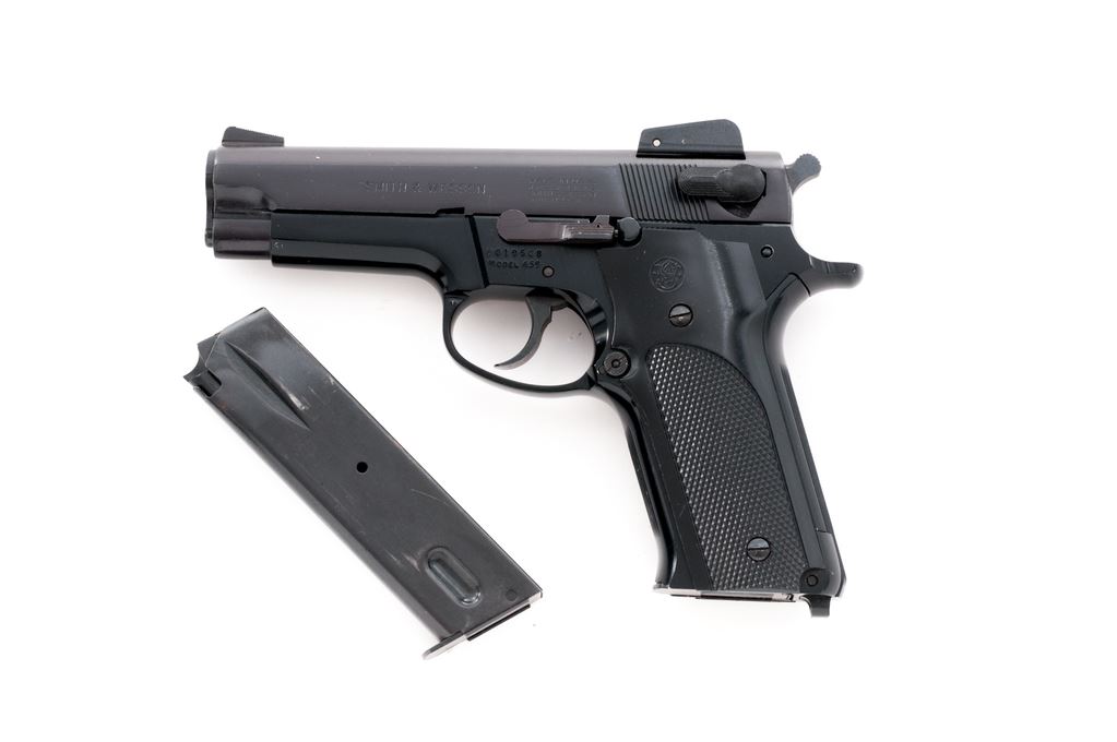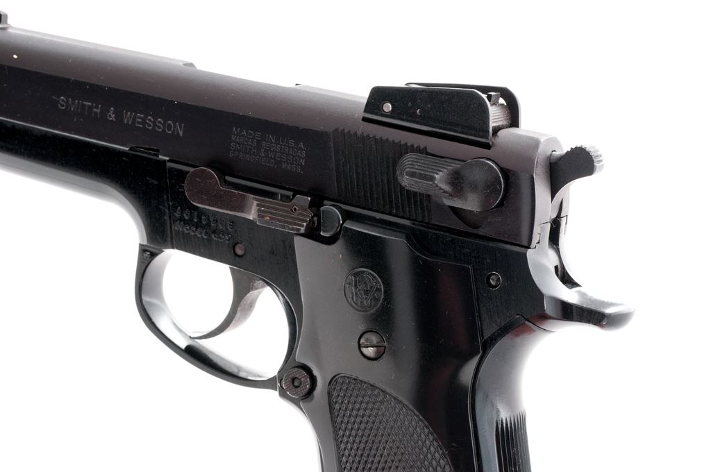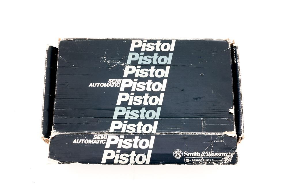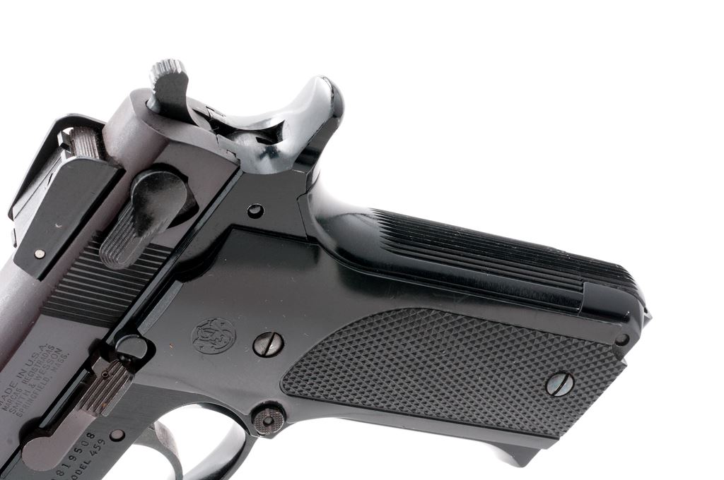 Smith & Wesson Model 459 Semi-Automatic Pistol, #A819508, 9mm cal., 4-1/8'' barrel, blued steel slide, black alloy frame, factory checkered black plastic grips, fixed blade front sight, adjustable square notched rear sight, de-cocking lever, and two (2) factory 14-round magazines. In original one-piece box with matching end label, owner's manual, and other misc. factory paperwork. Approx. 98%+ factory finishes remain and pistol rates as fine overall, showing normal slight handling marks to the grips and metal. Slight wear to the front and back strap accounts for a majority of the finish loss. Factory lettering is crisp. Grips with sharp checkering and scattered surface scratches to the smooth plastic. Action is tight with a smooth hammer and trigger; near excellent bore. Box shows considerable age and wear. Est.: $300-$500. (Modern/PPT)(High-cap mags not available to Calif. residents.)
