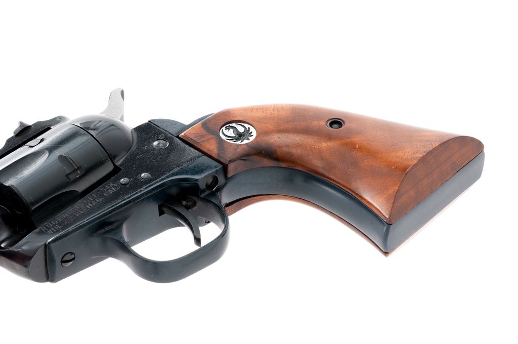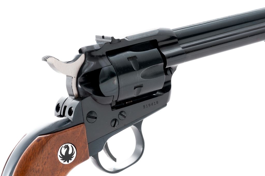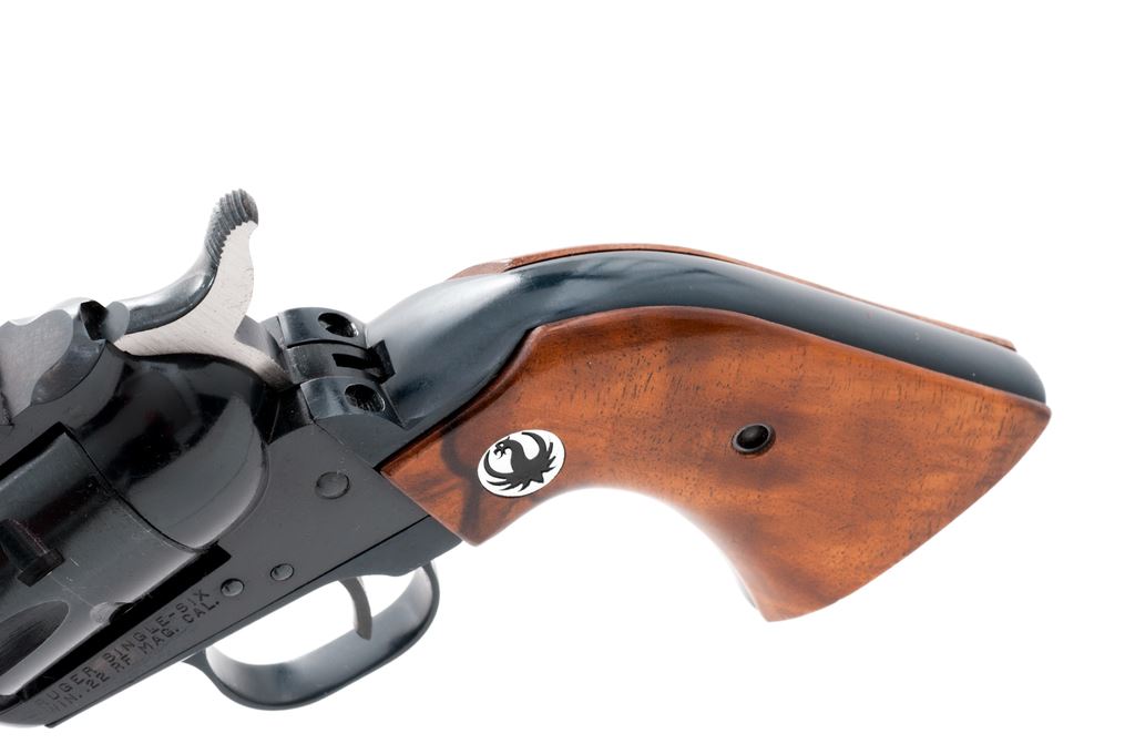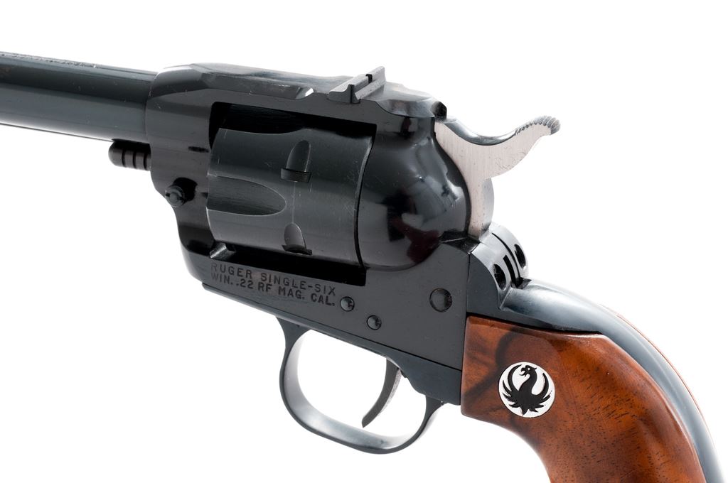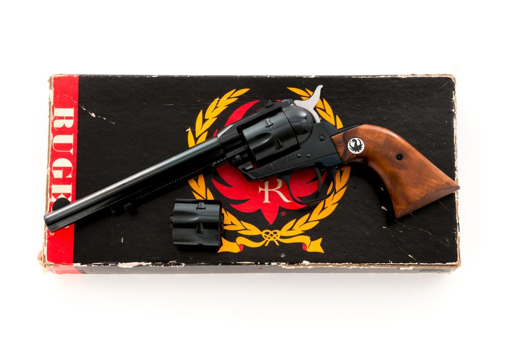 Ruger ''Old Model'' Single Six Magnum Convertible Single Action Revolver, #319418, .22 mag. with additional .22 LR cylinder, 6.5'' barrel, blue finish, walnut grips with Ruger black eagle medallions, and standard fixed sights. Left side of frame is marked ''RUGER SINGLE SIX / WIN. .22 RF MAG. CAL.'' In two-piece red/black Ruger box that is not numbered, with owner's manual, warranty card, and some additional small parts including a hammer, base pin, etc. Mfg'd 1961. Condition is excellent with approx. 97%-98% remaining factory blue finish. Metal with intermittent small marks from handling and use, factory lettering is clear, cylinder with a slight index line. Grips with a few normal small handling marks. Hammer is bright. Excellent crisp action and bore. Additional cylinder appears to have been turned very little with only a faint index line. Box shows considerable edge wear; corners of lid are held together by household tape. Est.: $450-$650. (C&R/PPT)