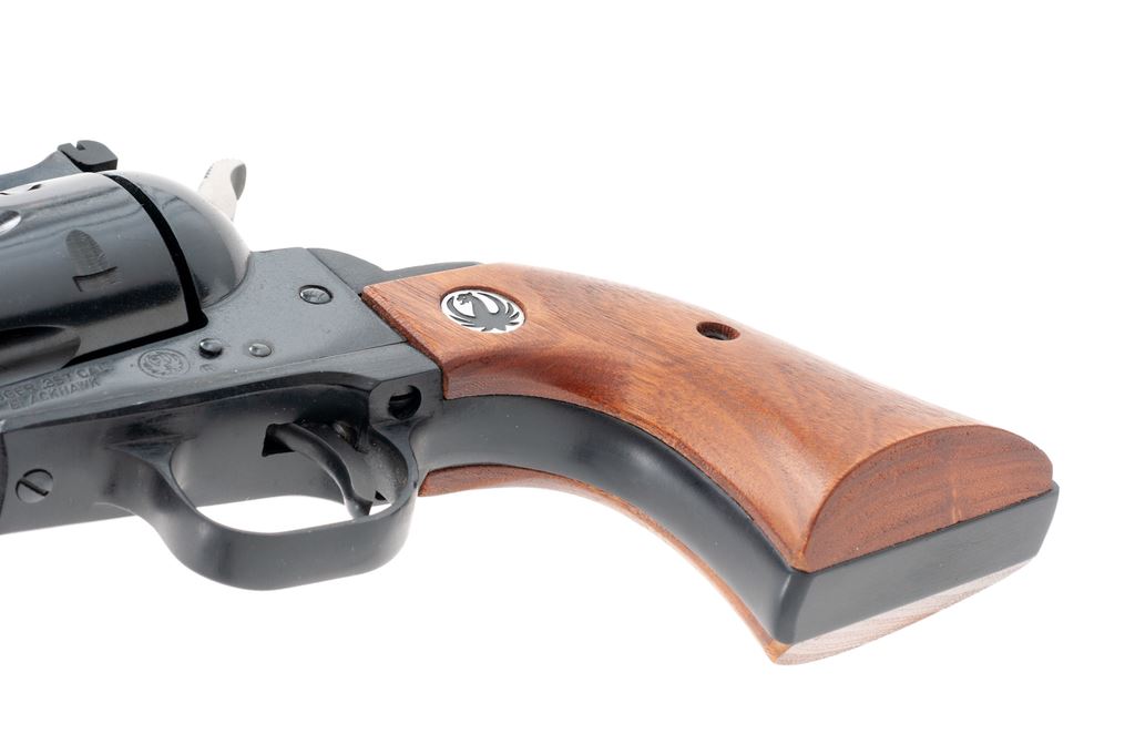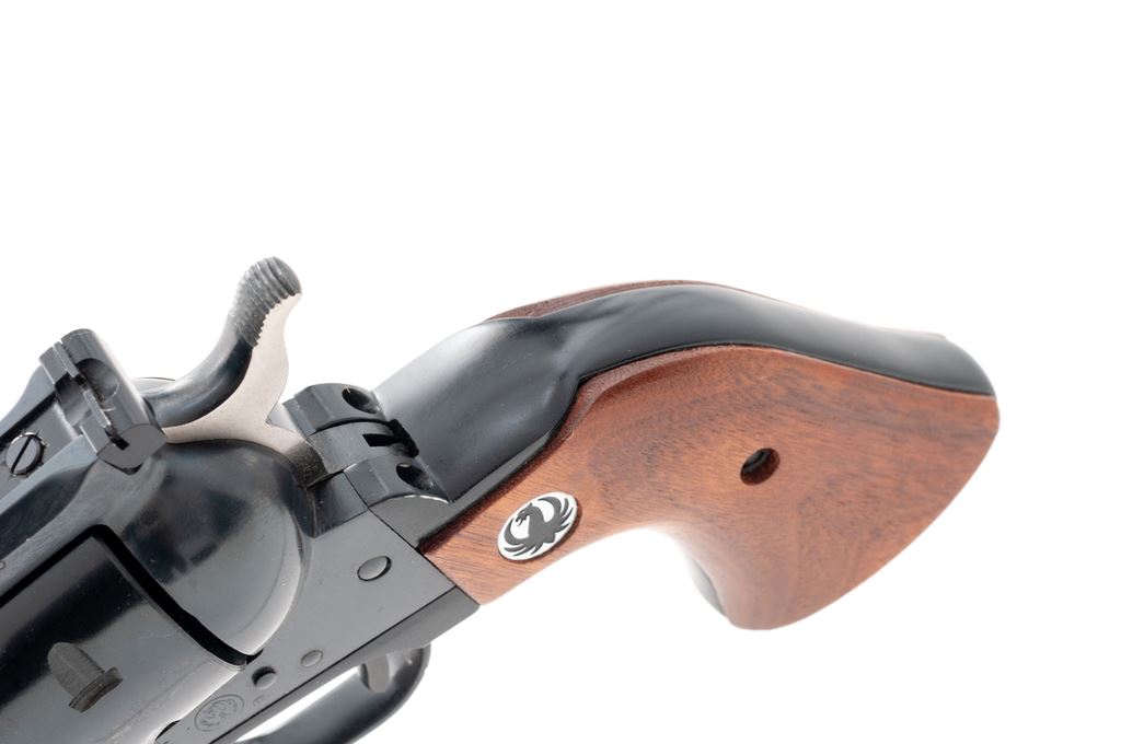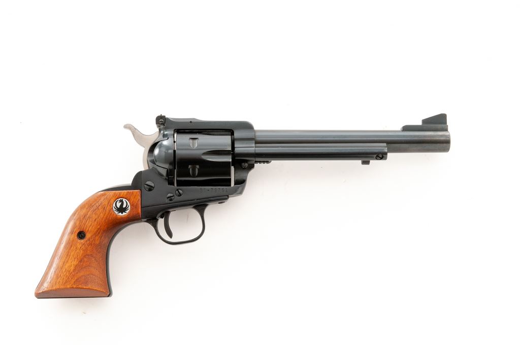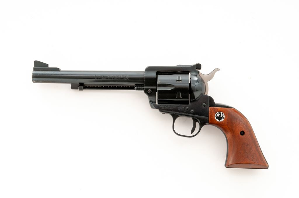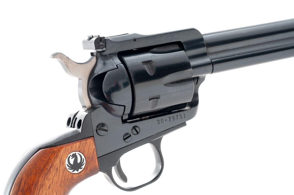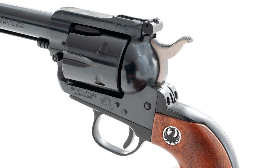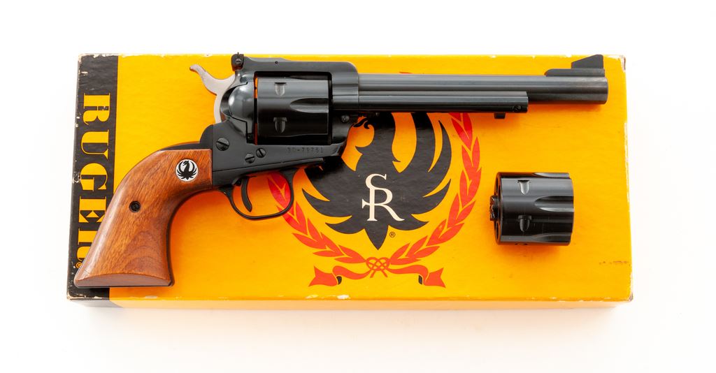 Ruger ''Old Model'' Blackhawk Convertible Single Action Revolver, #30-79751, .357 mag. with additional 9mm cylinder, 6.5'' barrel, blue finish, walnut grips with Ruger ''black eagle'' medallions, blade front sight, with a fully adjustable rear sight. In two-piece red/black/yellow box that is not numbered, with owner's manual and an additional ejector rod housing. Mfg'd 1970. Condition is fine with approx. 96% remaining original blue finish; right side of muzzle shows light wear, top of barrel near the frame with a few slight scratches, cylinder with a light index line. Grips with a few normal shallow handling marks, right grip is a little lighter in color. Factory lettering is crisp and clear. Action is smooth, bore is bright with excellent rifling. Additional 9mm cylinder with a light index line and fine micro-scratching. Box shows moderate storage wear; one of the corners on the lower portion is split; end label is clear. Est.: $400-$600. (Modern/PPT)
