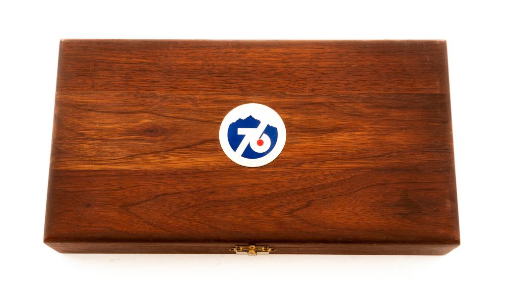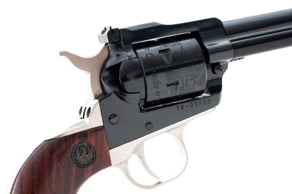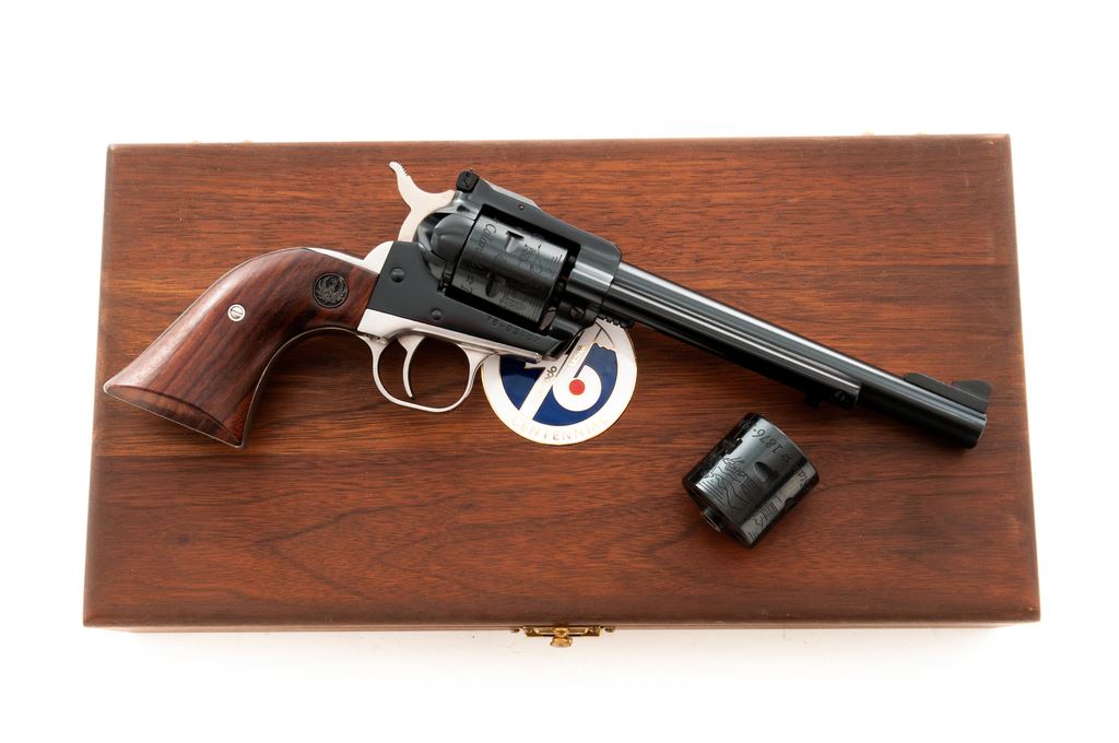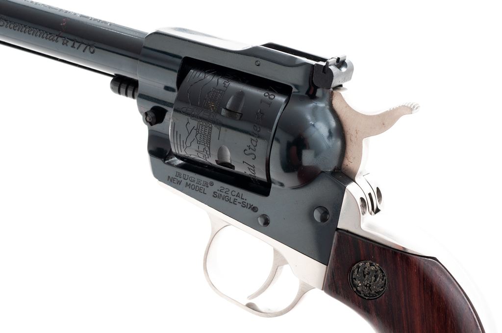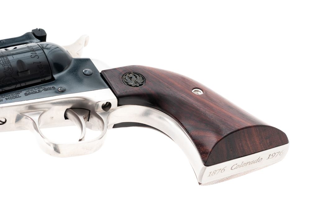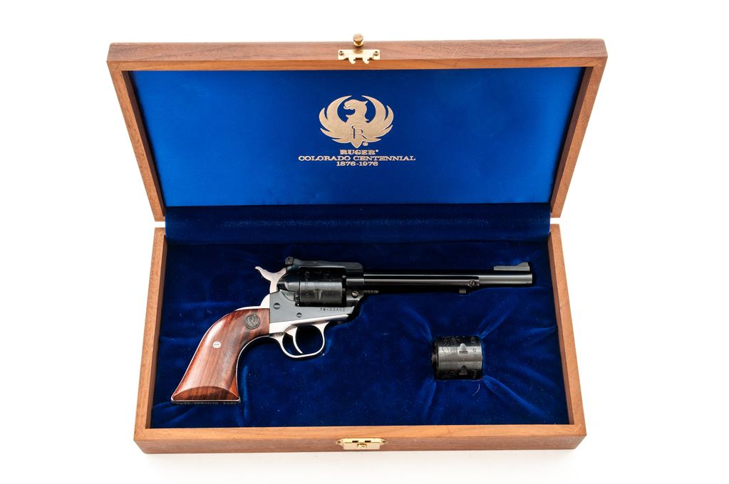 Ruger Colorado Centennial New Model Single Six Revolver, #76-03402, .22 LR cal., with additional .22 mag. cylinder, 6.5'' barrel, blue finish, polished stainless steel backstrap and triggerguard, walnut grips with inlaid Ruger medallions. In original 1976 Colorado Centennial wood case with medallion on lid and includes instruction/parts list. Both cylinders with commemorative engraving. Left side of barrel is marked ''1876 * Colorado Centennial * U.S. Bicentennial * 1776''. Condition is excellent retaining approx. 99% factory blue; cylinder with a slight index line. Grips show minimal handling marks, Ruger medallions with wear to the silver finish. Bore is bright. Case interior is excellent; exterior shows light storage wear. Est.: $350-$500. (Modern/PPT)