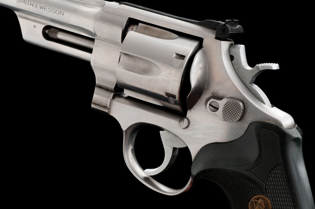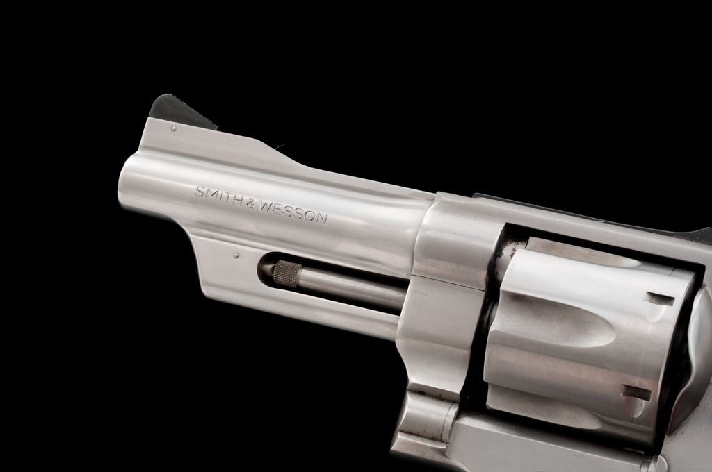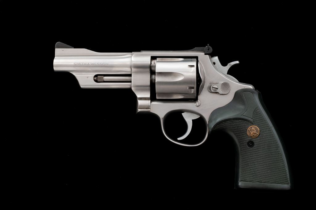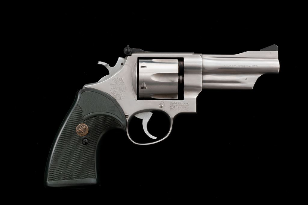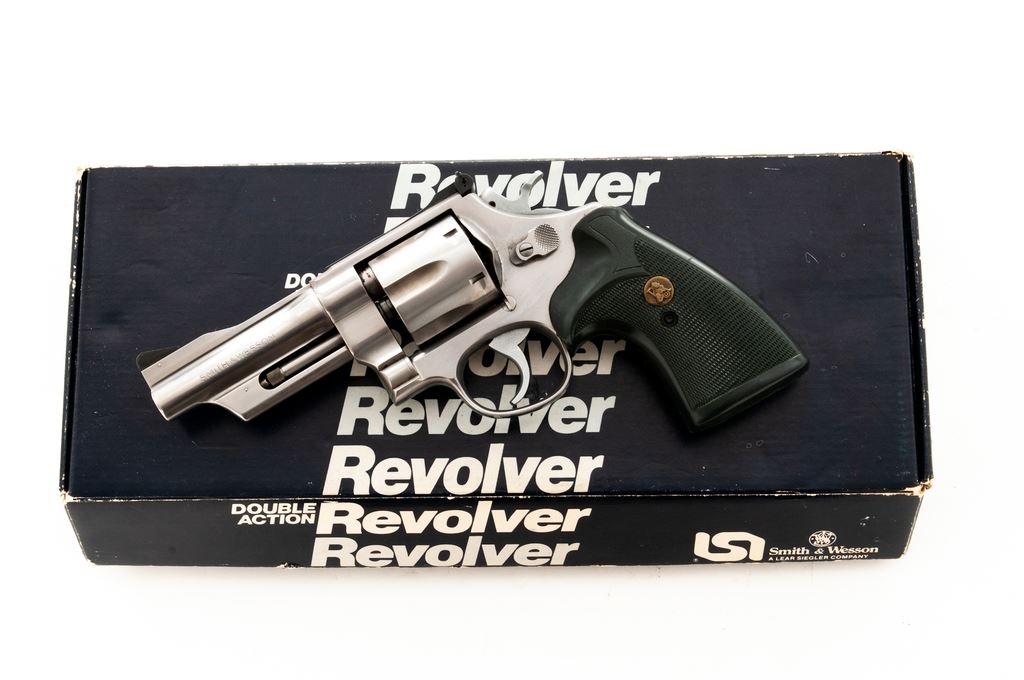 Smith & Wesson Model 624 .44 Target Double Action Revolver, #AHB0412, .44 S&W Spec. cal., 4'' barrel, satin stainless finish, checkered black rubber Pachmayr ''Presentation'' grips, ramped front sight, with a fully adjustable rear sight. In original one-piece box that is numbered to the gun, with owner's manual and sealed cleaning kit. Condition is about fine showing normal signs of moderate range use. Metal with scattered micro-scratching and small handling marks, factory lettering is crisp and clear, edge of barrel rib shows some light wear, cylinder with a moderate index line. Grips show nicks and wear along the front edges with a light green residue overall that should improve with a thorough cleaning; checkering is excellent. Action is smooth and crisp with a near excellent bore. Est.: $600-$800. (Modern/PPT)