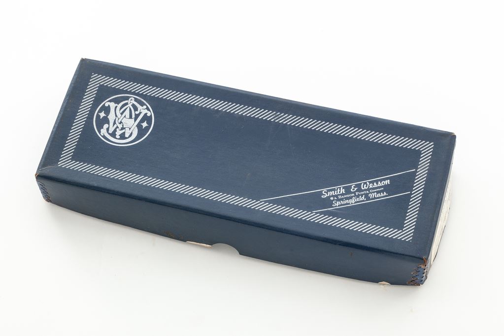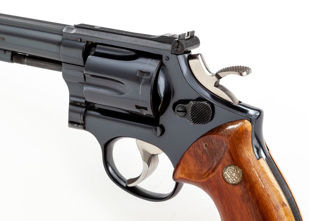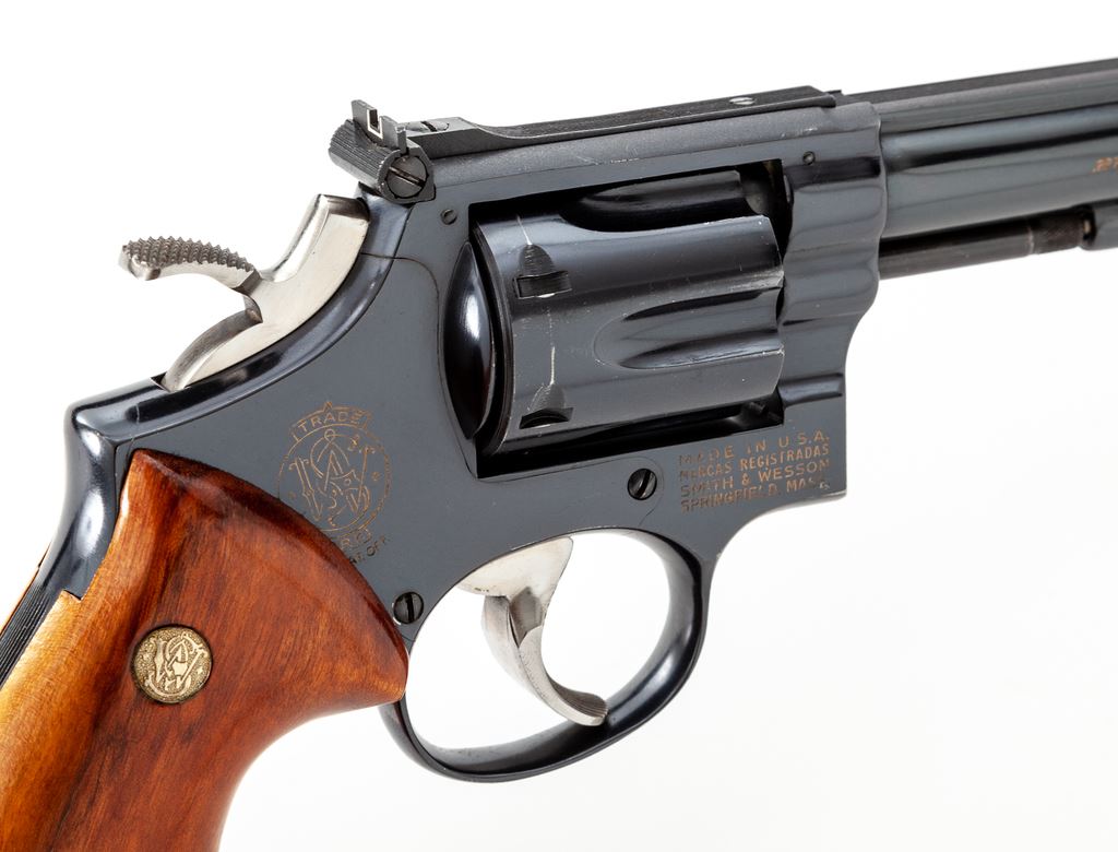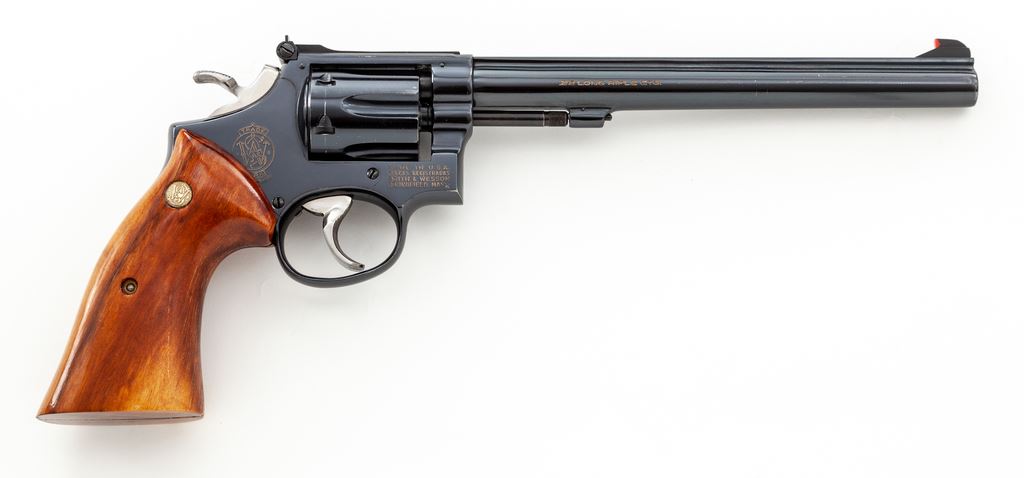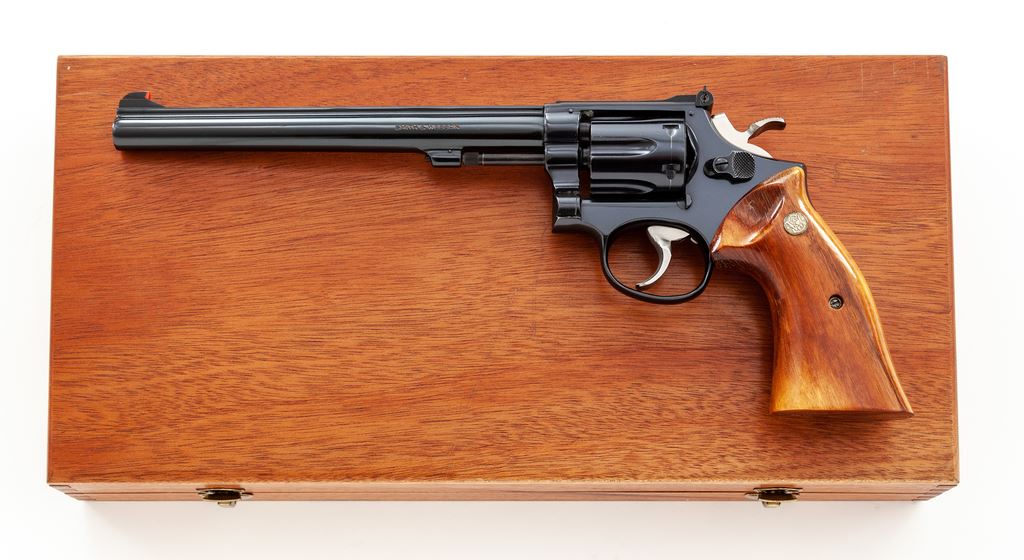 Smith & Wesson Model 17-3 K-22 Masterpiece Double Action Revolver, #3K86608, 8-3/8'' pinned barrel, blue finish, polished bright wide target hammer and trigger, smooth Goncalo alves target grips with S&W medallions, Patridge type front sight with red insert, and micrometer click adjustable rear sight. All of the factory lettering has been highlighted in gold. Mfg'd 1971-1972. In S&W wood display box with blue interior and cleaning accessories. Approx. 97%-98% original blue finish remains, and metal surfaces rate as fine overall showing scattered light micro-scratching; cylinder with a thin index line. Factory lettering is clear and well defined; gold highlights on left side of barrel are barely visible. Grips are good showing moderate handling marks and an added coat of varnish; color of both has faded as this revolver was on display in the casino. Action is smooth with an excellent bore. Exterior of wood case shows moderate storage wear and shallow scratches; interior is excellent. Est.: $450-$650. (Modern) (Not available to Calif. residents.)(Sierra Sid's Casino, Sparks, NV.)