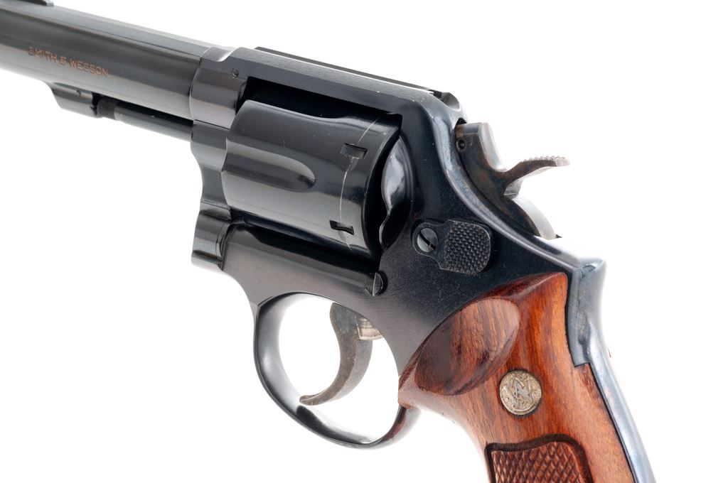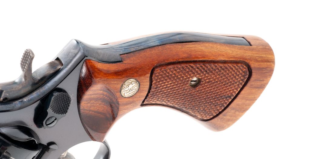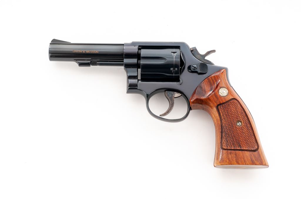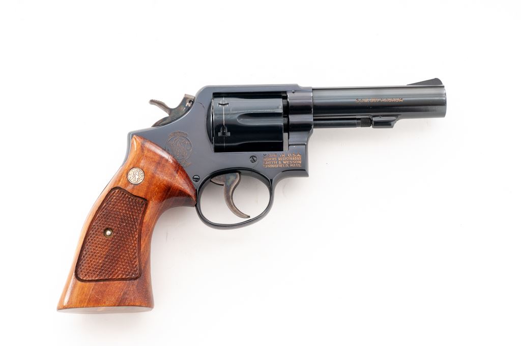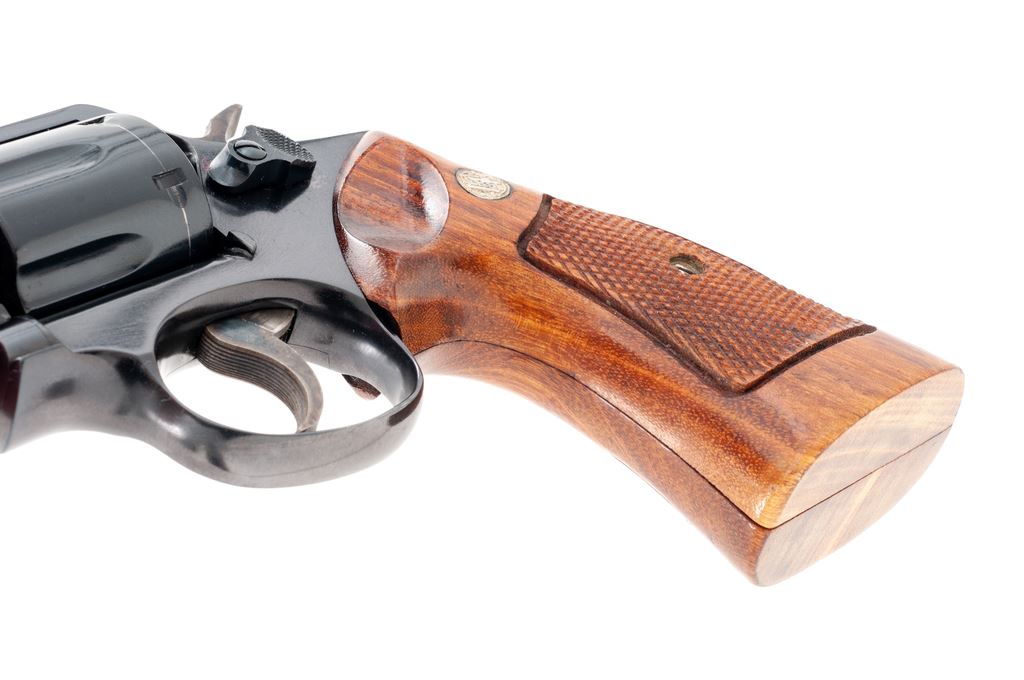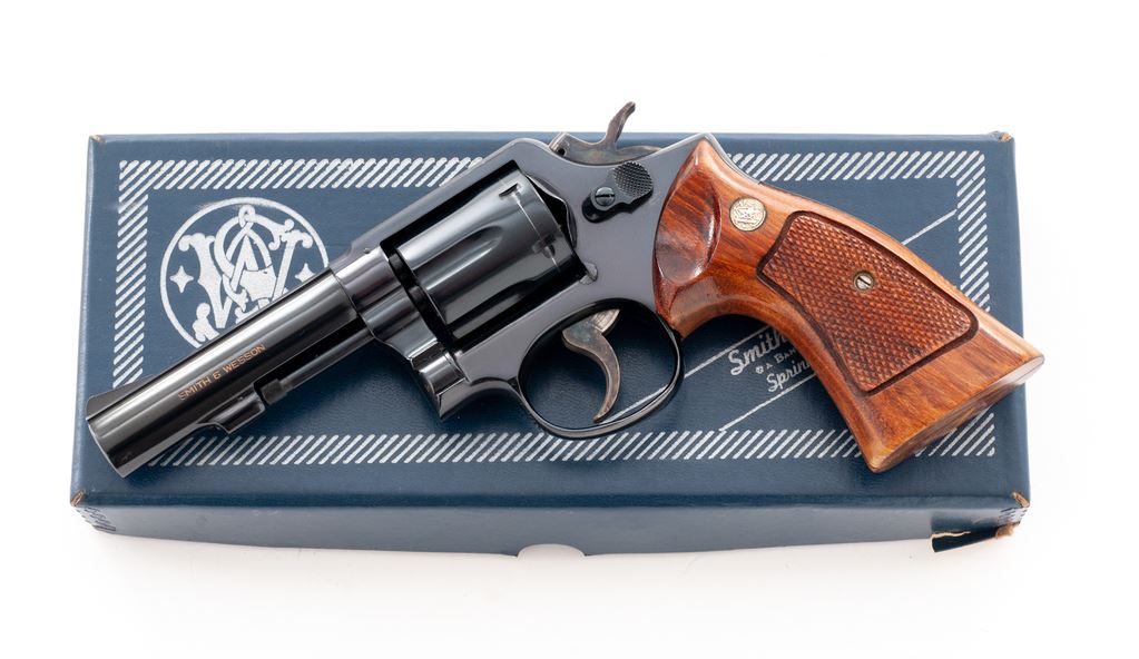 Smith & Wesson Model 13-1 .357 Magnum M&P Double Action Revolver, #D816834, 4'' pinned heavy barrel, blue finish, case hardened hammer and trigger, factory checkered square butt Goncalo alves target grips with S&W medallions, ramped front sight, and standard frame notched rear sight. All of the factory lettering has been highlighted in gold. In original blue two-piece S&W factory box numbered to the gun. Mfg'd 1975-1976. Because of the replacement S&W target grips, this revolver no longer properly fits in the box. Metal surfaces show signs of moderate range use and rate as fine overall with approx. 97% factory blue. Minor wear to upper edges of frame and a thin index line to the cylinder account for a majority of the finish loss. Grips are very good with moderate handling marks; checkering is mostly clean and sharp; smooth edges with some thinning to the finish and are a little lighter in color from being on display in the casino. Majority of the bright case colors remain. Action is crisp, bright bore rates near excellent. Bottom portion of box with what looks like mildew discoloration and some peeling at the edges of the blue finish. Est.: $350-$550. (Modern)(Not available to Calif. residents.)(Sierra Sid's Casino, Sparks, NV.)