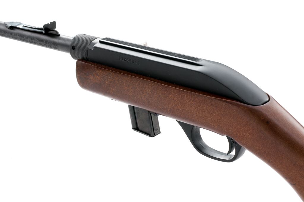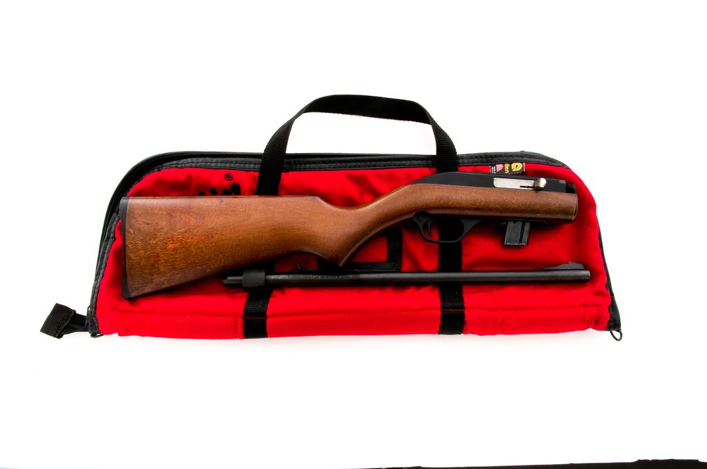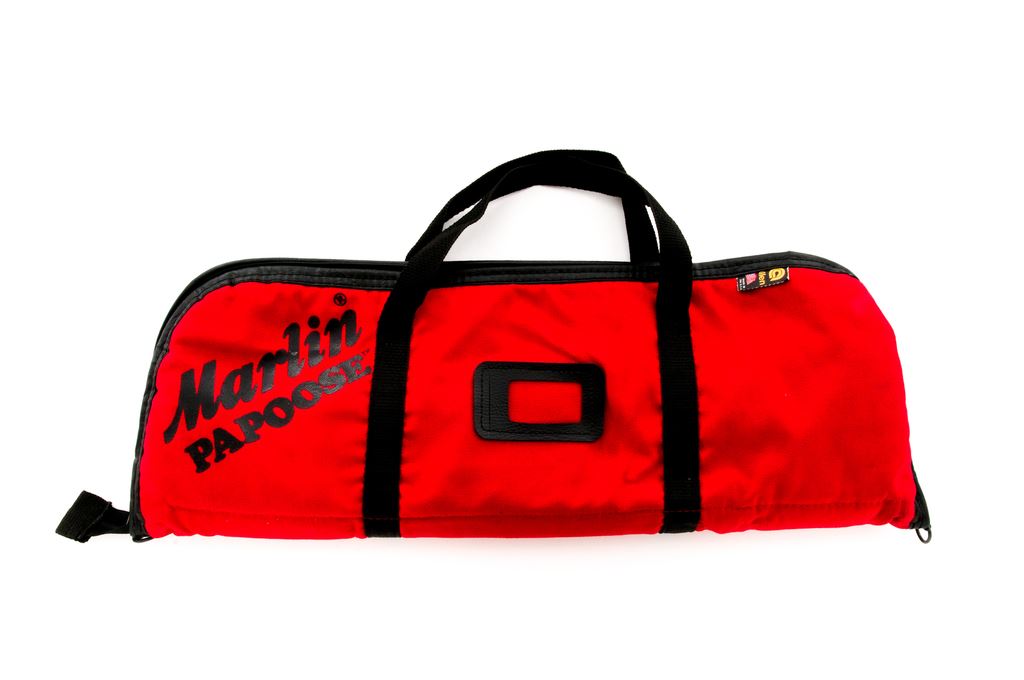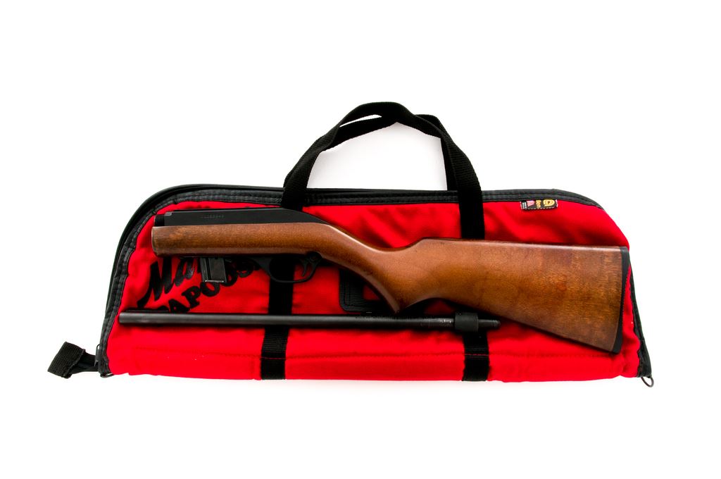 Marlin Model 70P ''Papoose'' Takedown Semi-Automatic Rifle, #11259940, .22 LR cal., 16.25'' micro-groove barrel, blue/black finish, pistol-grip wood stock, black plastic Marlin buttplate, fixed blade front sight, notched elevator rear sight, stainless bolt, and one magazine. Included is the original red nylon carrying case and owner's manual. Approx. 98% original finish remains and rifle rates as excellent overall. Barrel with light surface scuffs and scratches near the takedown ring. Stock with a few light handling marks at the pistol grip; front edge where the rifle is taken down shows moderate wear to the finish. Action is smooth with an excellent bore. Est.: $150-$250. (Modern)