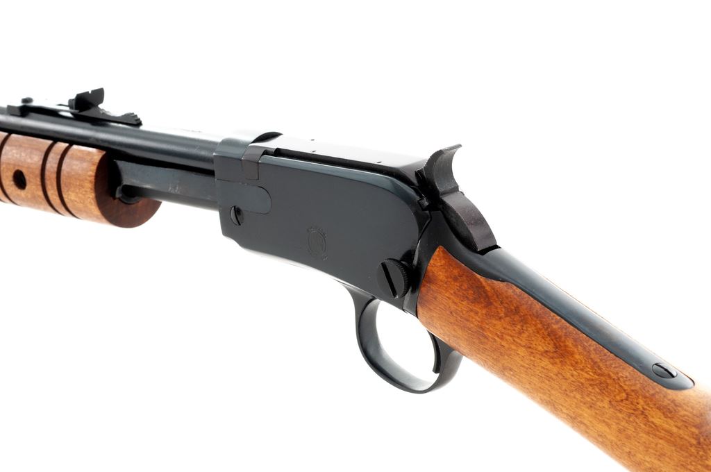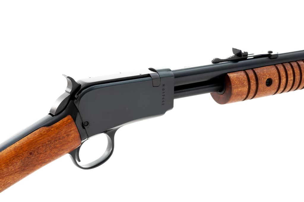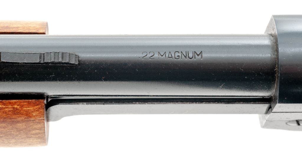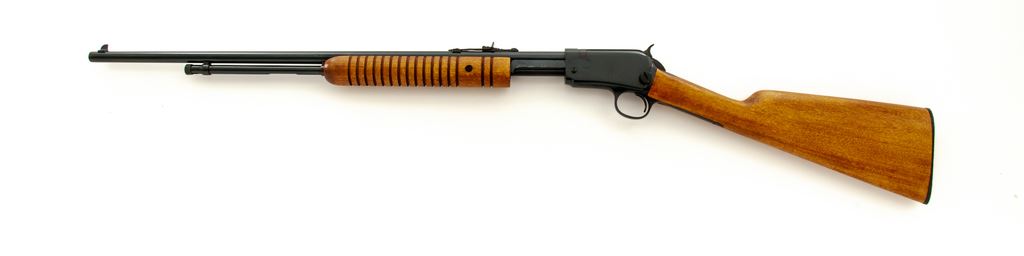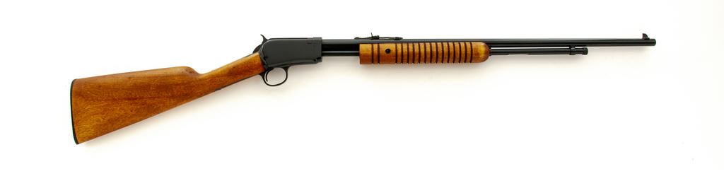 Rossi Model M59 Pump Action Rifle, #H017442, .22 mag. cal., 23'' round barrel, blue finish, straight grip hardwood stock with grooved forend, black plastic Rossi buttplate, dovetailed blade front sight and standard elevator rear sight. Condition is excellent showing little use, with approx. 99% original blue. Metal and wood shows only a few slight handling marks. Action is crisp with an excellent bore. Est.: $250-$400. (Modern)
