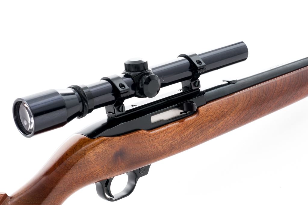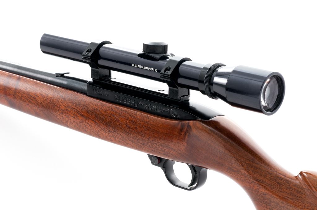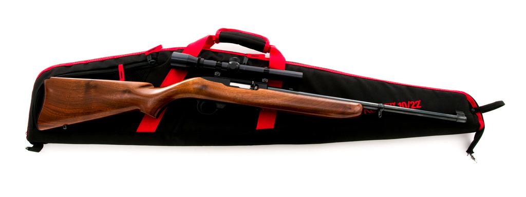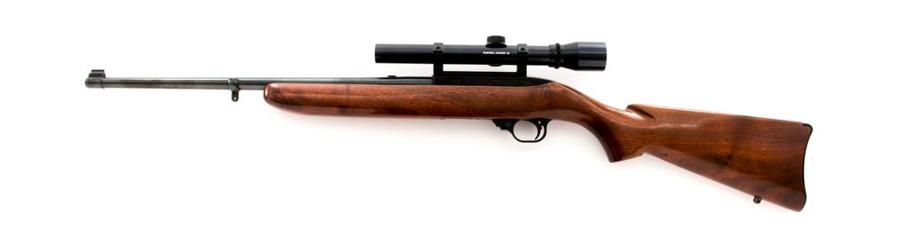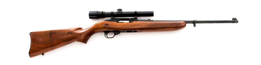 Late 70's Ruger 10/22 Semi-Automatic Carbine, #116-61489, .22 LR cal., 18.5'' barrel, blue finish, pistol-grip walnut stock with fluted comb, smooth black plastic buttplate, sling swivel studs, brass bead front sight, rear sight has been removed and filled with a dovetailed blank, with one factory 10-round magazine and red and black Ruger 10/22 soft case. Topped with a Bushnell Banner .22 4x20mm scope with duplex reticle. Mfg'd 1977. Metal rates as excellent with approx. 98% original finish. Wood has been re-oiled and is fine overall with mostly very minor handling marks; right side and bottom edge of buttstock with a few more noticeable but still small to moderate surface scratches and shallow impressions. Action is smooth with an excellent bore. Scope exterior with a few small scratches; optics are clear. Est.: $150-$250. (Modern)