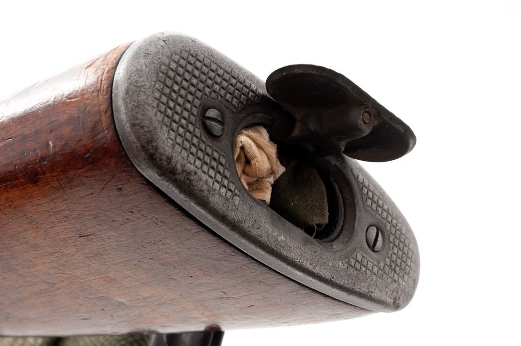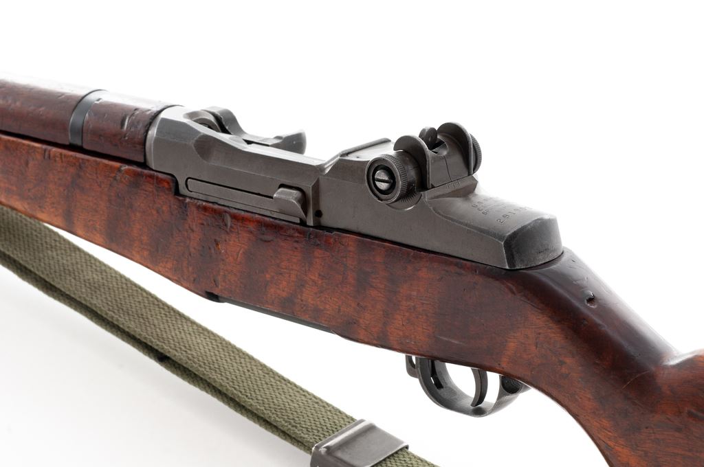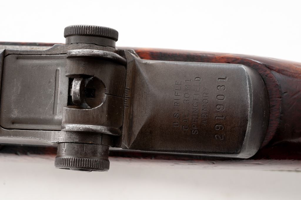 Springfield M1 Garand Semi-Automatic Rifle, #2919031, .30-06 cal., 24'' barrel, parkerized finish, walnut stock, blade front sight with protecting ears and adjustable aperture rear sight. Marked on receiver tang ''U.S.RIFLE CAL..30 M1 SPRINGFIELD ARMORY'', and on right side of barrel ''SA'', and ''10 63''. Stamped on underside of wrist with a ''circle P'' firing proof. ''SA'' stamped on bolt, triggerguard, hammer, and operating rod. Condition overall is very good with over 80% finish remaining on metal surfaces, with light thinning and browning on the receiver, bolt, and buttplate, and a blued refinish on the gas cylinder. Stock is in good condition with painted rack numbers removed, leaving a lighter color on the buttstock. Front handguard has been replaced and is a lighter color. Stock and rear handguard have been refinished with a gloss varnish and show overall handling marks. Action is smooth, bore is good with frosting and darkness toward the muzzle and wear to the rifling. Import stamped on right side of barrel. Includes a U.S.G.I. green cotton sling, plastic oiler and grease pots, and an M10 cleaning rod and combination tool, all in very good or better condition. Est.: $800-$1,000. (C&R)