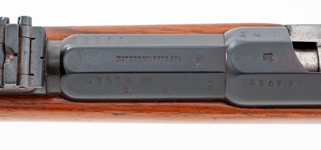 German Model 1871 Mauser Single Shot Bolt Action Rifle, by Oesterr, #4247P, 11mm Mauser cal., 34'' barrel, blue finish, bright bolt, walnut stock, and brass triggerguard. Condition is excellent as refinished, retaining approx. 98% of a later-accomplished blue. Stock has been lightly sanded. Good action, bright bore. Est.: $350-$500. (Antique)