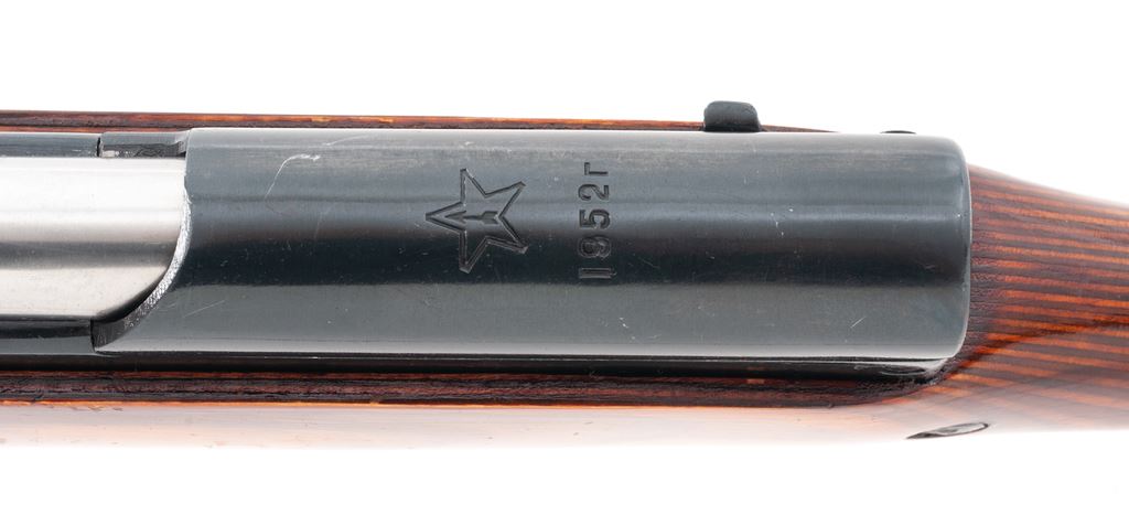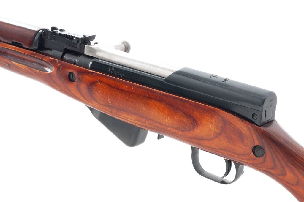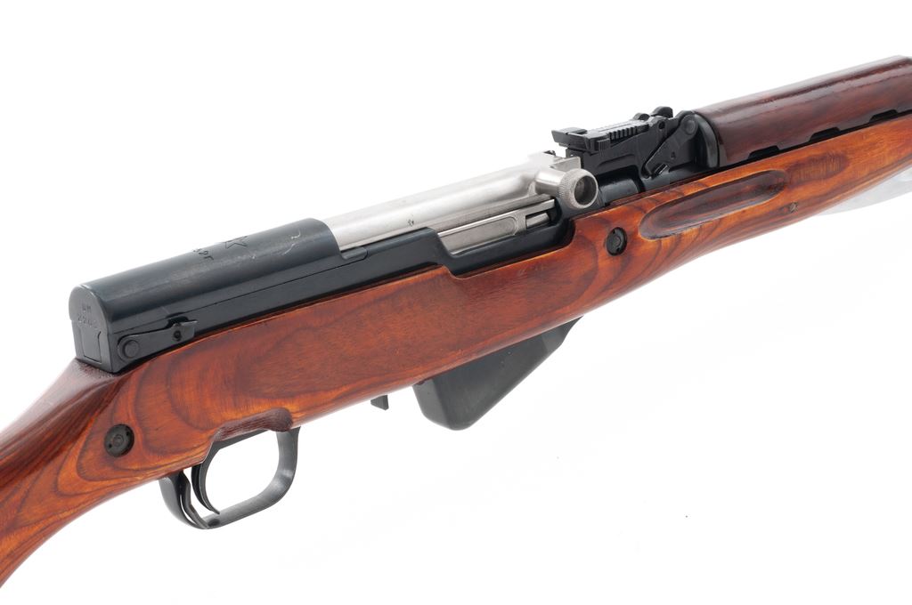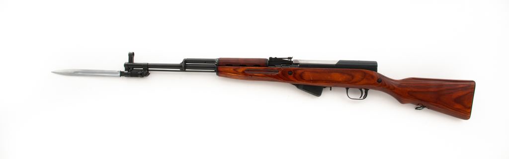 Soviet SKS Semi-Automatic Rifle, with folding bayonet, #OM2263, 7.62x 39mm cal., 20.47'' barrel, blued finish, laminated stock, hooded post front sight and adjustable tangent rear sight. Marked on receiver cover with fletched arrow inside five-pointed star of the Soviet Tula Arsenal above ''1952r''. Matching numbers. No refurbishment marks on stock or receiver. Bright bolt and bayonet blade. Includes cleaning rod but missing butt trap cleaning kit. Condition overall is very good with approx. 98% blued finish remaining on metal surfaces. Bright bolt has a small area of cleaned old pitting on top and side. Wood is very good with scratches to the varnish finish. Action is smooth, bright bore is excellent. Import stamped on right side of barrel. Bayonet is excellent and operates smoothly. Est.: $450-$650. (C&R)