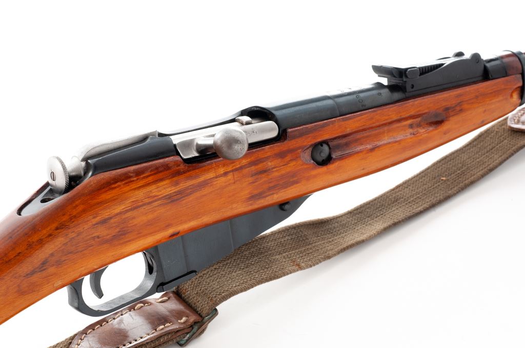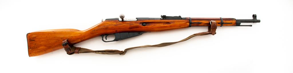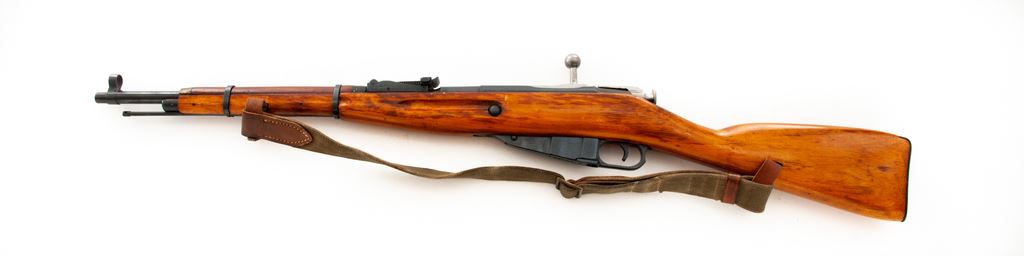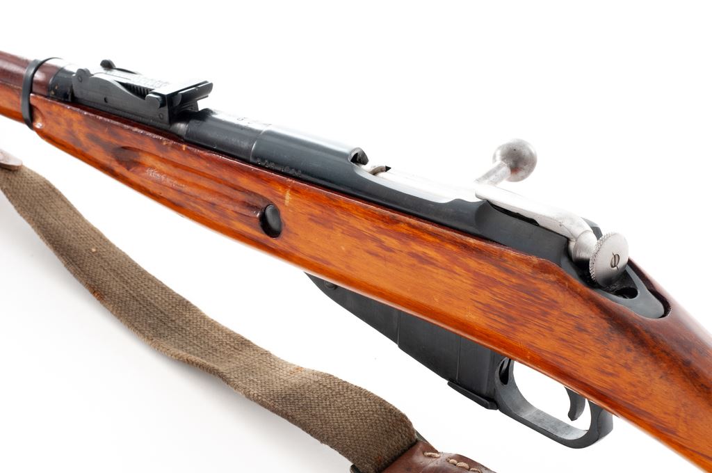 Soviet Model 1891/59 Mosin-Nagant Bolt Action Rifle, #SZH8603,7.62x54R mm cal., 20.25'' barrel, blued/bright finish, hardwood stock, hooded post front sight and adjustable tangent rear sight. Marked on barrel shank with Soviet crest over ''1943'', ''1891/59'', and fletched arrow inside triangle of the Izhevsk Arsenal. Matching original serial numbers ''9608'' on barrel shank, bolt handle, magazine release, and buttplate. Includes cleaning rod and Soviet sling. Graduations above 10 have been removed from rear sight leaf. Condition overall is very good, with metal surfaces retaining over 95% of the arsenal reblued finish showing an area of rust on the buttplate. Bright bolt is very good. Wood is very good with handling marks and scratches to the varnish finish. Action is smooth, bore is good with darkness in the grooves that may clean. Import marked on right side of barrel. Est.: $300-$450. (C&R)