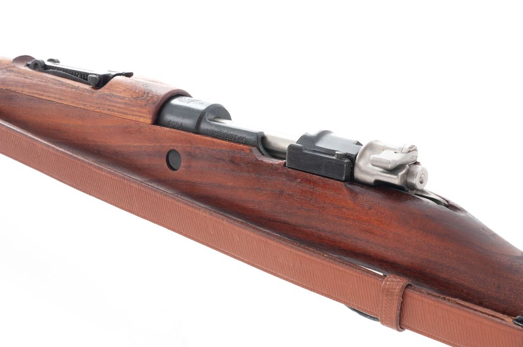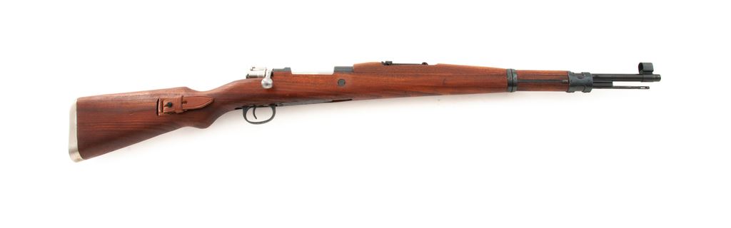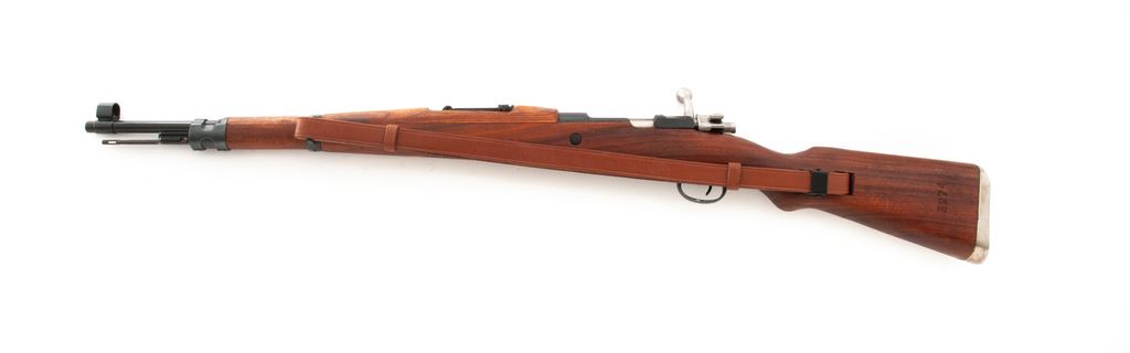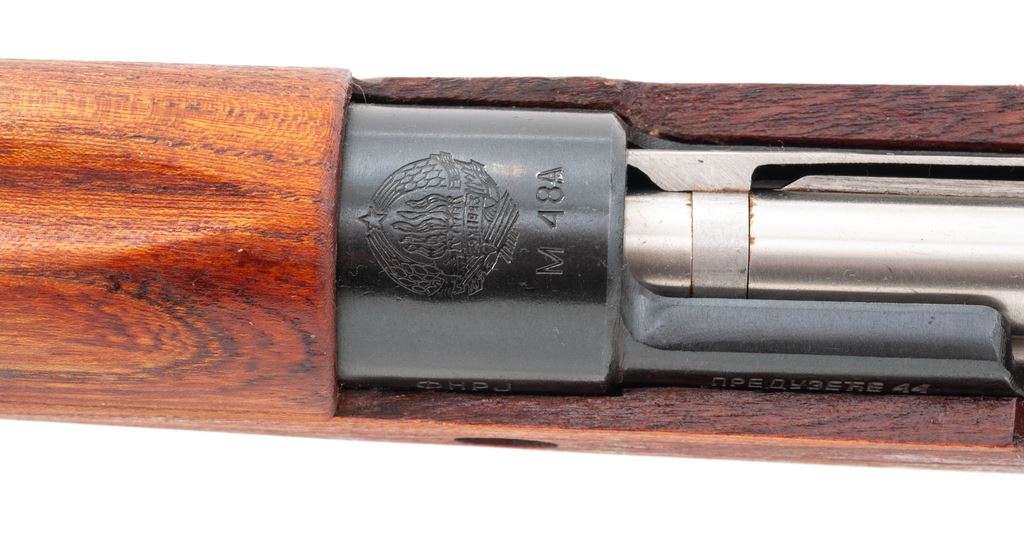 Yugoslavian M48A Bolt Action Rifle, #G3274, 8x57mm cal., 23.25'' barrel, blued finish, hardwood stock, inverted ''V'' front sight with added hood and adjustable tangent rear sight. Marked on receiver ring with ''(Yugoslavian crest)/M48A/HPJ''. Cyrillic ''NPENY3EKE 44'' marked on left side of receiver rail. Matching numbers, with cleaning rod. Condition overall is fine with almost all of the blued finish remaining on metal surfaces, with bolt assembly bright and buttplate with light patina. Wood is about fine with a couple of scratches and handling marks and an even overall finish. Action is smooth, bright bore is very good. Import stamped on right side of barrel. Includes a reproduction brown leather Kar98k style sling in excellent condition. Est.: $250-$400. (C&R)