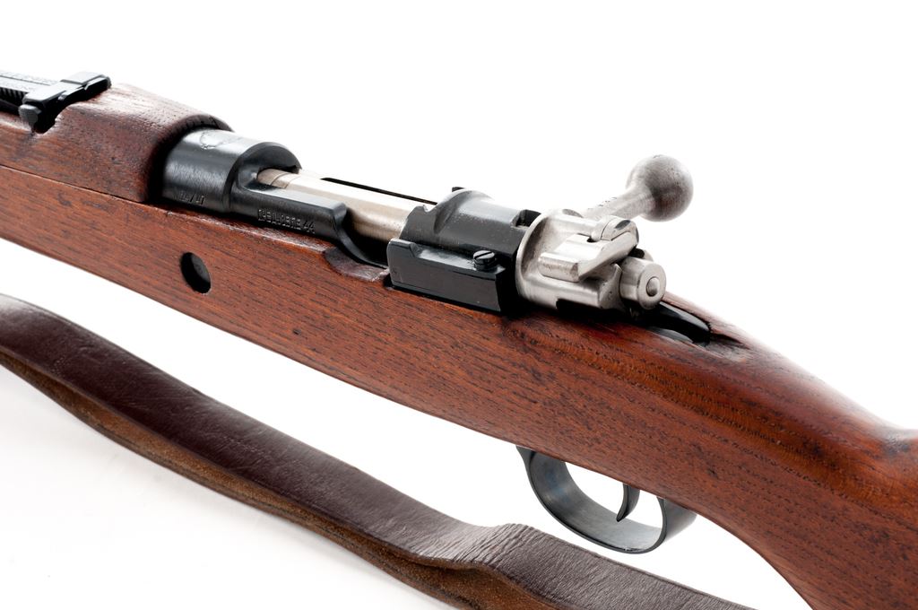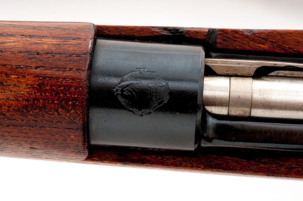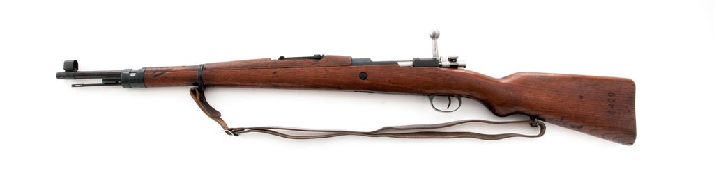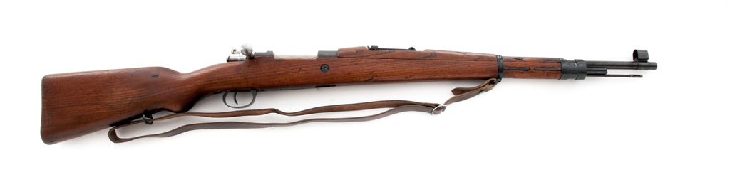 Yugoslavian M24/47 Mauser Bolt Action Rifle, #A8420, 8x57mm cal., 23.3'' barrel, blued finish, hardwood stock, Inverted ''V'' front sight with attached hood and adjustable tangent rear sight. Marked on receiver ring with Yugoslavian crest, and on left side receiver rail ''M24/47'' and Cyrillic ''NPEAY3EKE 44''. Matching numbers on bolt, stock, and floorplate, with ''58'' on underside of rear sight leaf. Cleaning rod is attached. Condition overall is about fine with almost all of the dark bluing remaining on metal surfaces, with light thinning on the cleaning rod. Bolt assembly and buttplate are bright. Wood has a light stained finish over a couple of old dents and gouges. Action is smooth, bore is excellent with sharp rifling. No visible import stamps. Includes a brown leather sling in very good condition. Est.: $250-$400. (C&R)