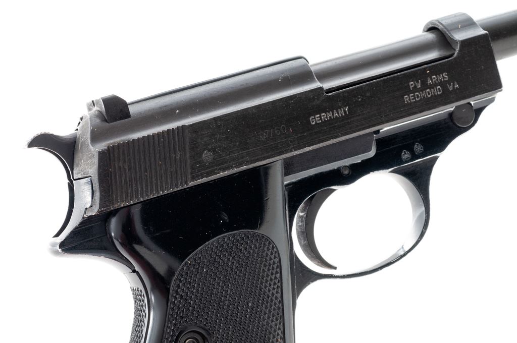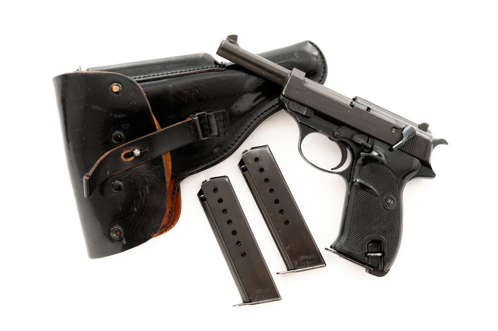 Walther P.38 Semi-Automatic Pistol, #102862, 9mm, 5'' barrel, matte blue finish, factory checkered black plastic grips, with four (4) factory magazines, in black leather police holster. Mfg'd 7/60. A West German police trade-in pistol imported by PW Arms in the early 1980s. Condition is excellent showing light use, with some scuffing to right grip panel. Good action, bright bore. Holster is excellent. Est.: $300-$500. (C&R/PPT)