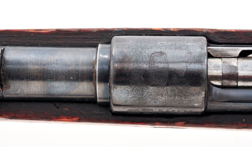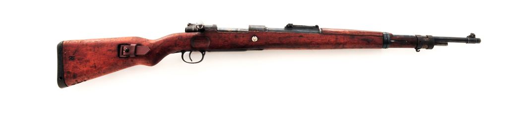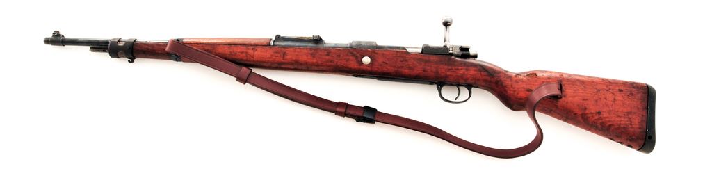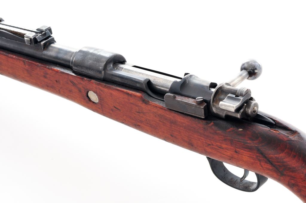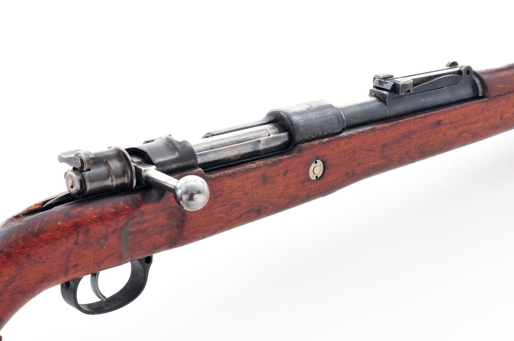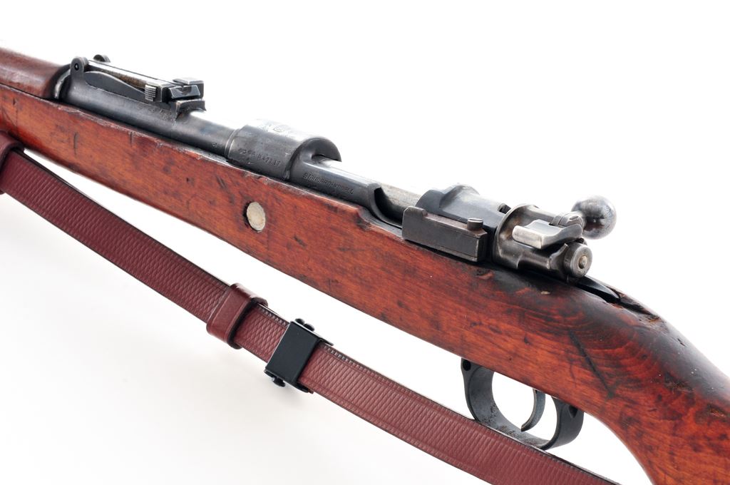 German ''Standard Modell'' Mauser Bolt Action Rifle, #B47217, 8X57mm cal., 23.62'' barrel, blued finish, hardwood stock, inverted ''V'' front sight without protector and adjustable tangent rear sight. Marked on receiver ring with ''MAUSER'' banner logo, and on left side receiver rail ''STANDARD-MODELL''. Stock appears to be a replacement as there are no grasping grooves and ''7.62'' has been burned into the toe forward of the cupped buttplate. (Rifle will chamber a 8x57mm snap cap but will not chamber a .308 Win. snap cap.) Correct short lower band retaining spring and upper band with parade hook are fitted. Straight bolt handle and other parts have mismatched numbers. Missing cleaning rod. Condition overall is very good with approx. 50% finish remaining on metal surfaces, with pitting along the wood line of the receiver, and triggerguard/floorplate refinished. There is an added ''Z'' carved into the right side of the buttstock, otherwise wood is good with a small chip at the bolt way and a gouge at the wrist. Action is smooth, bright bore is very good. Reproduction Kar 98k style leather sling in new condition is included. No visible import stamps. Est.: $300-$500. (C&R)
