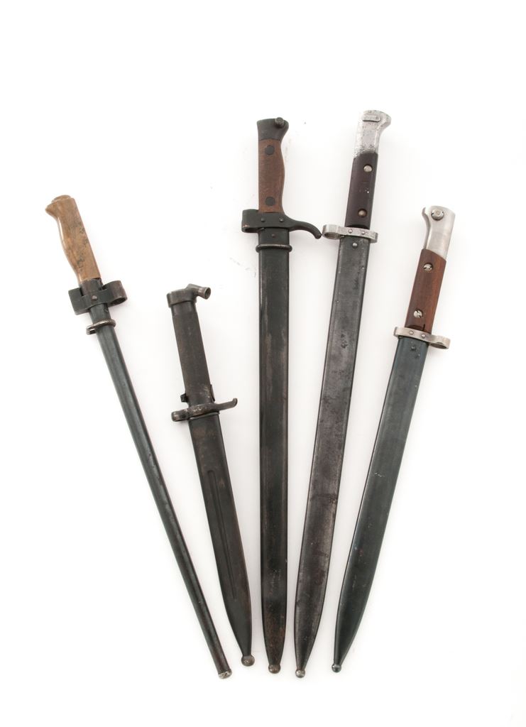 Lot of Five (5) Bayonets: 1.) Czech VZ-23 Long,15.75''conventional blade, crown and Farsi characters on pommel, painted characters on grip, with ''(circle)Z'' stamp on scabbard. Bayonet condition is very good with dark stains on bright blade and pommel, dents in wood handle. Scabbard is very good with old rust spots and fading to finish. 2.) Czech VZ-24, 11.75'' inverted blade, ''CSZ/T'' on ricasso. Bayonet condition is very good with light old patina on cleaned blade, no nicks. Grips are unfinished and could be replacements with several impressions to wood. Scabbard is arsenal blued over old dents with light use. 3.) Swedish M 1896, 8.3''blade, ''(crown)C'' on ricasso, mismatched serial numbers on scabbard, matching unit numbers on bayonet and scabbard. Bayonet condition is very good with sharpening and nicks to blade. Scabbard is very good with some browning to finish. Includes rare scabbard retainer that is stamped with a crown symbol. 4.) French M1892, 15.75'' blade, ''(circle)C'' on blued blade, third type with short lower quillion. Bayonet condition is very good with light wear to blade, cuts and darkening to wood grips. Scabbard is very good with no dents and overall finish thinning with some rust spots. 5.) Shortened French M1886 Bayonet, 13-1/4'' blade, brass handle, no quillion. Bayonet condition is very good with light nicks and patina to blade, brass handle is good. Scabbard is good with patina and rust spots. Est.: $200-$300/lot.