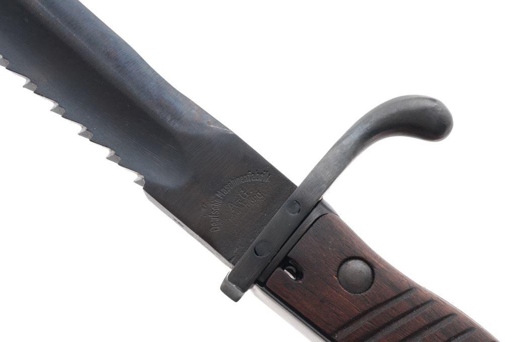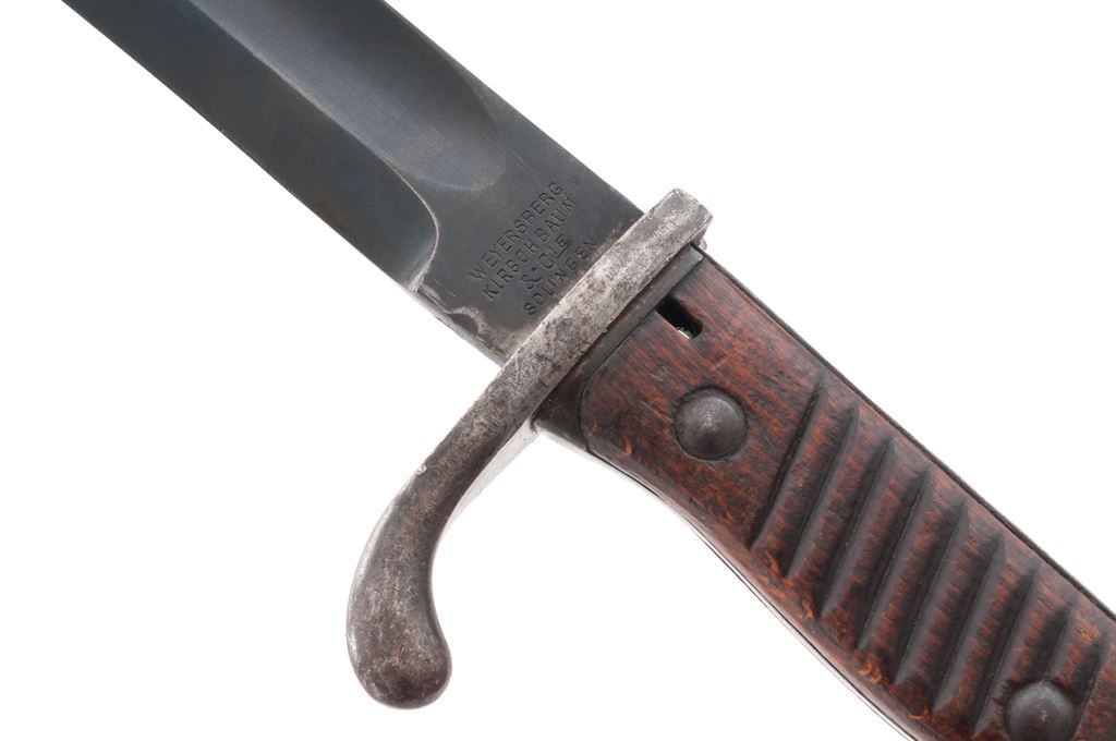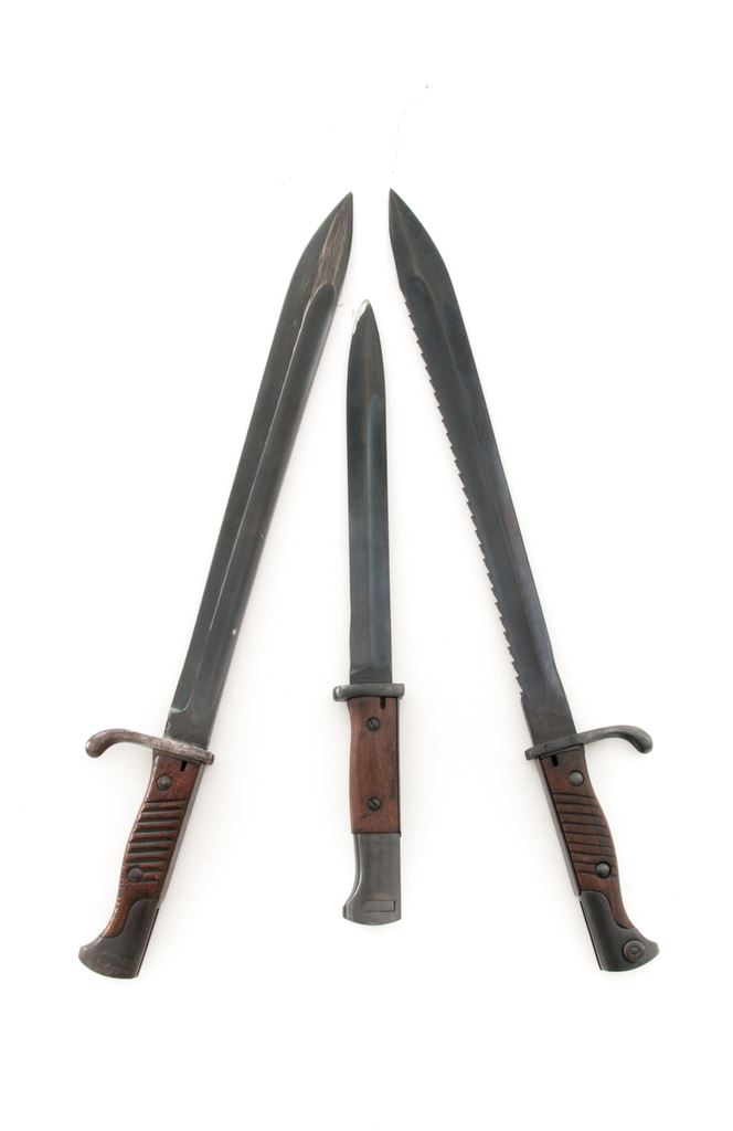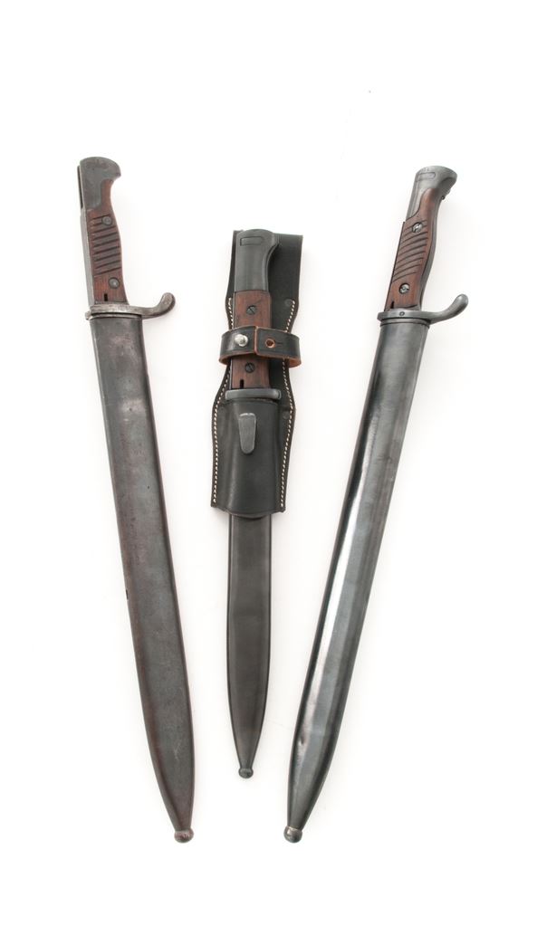 Lot of Three (3) German Bayonets: 1.) German Kar98k, 9.5'' blade, ''clc 44'' on ricasso, wooden grips. Bayonet condition is good as completely reblued, tip shows grinder marks, wooden grips sanded. Scabbard is reblued with dent on front, and new condition reproduction leather frog. 2.) German Model 1898/05, 14.5'' blade, ''Deutsche Maschinenfabrik A-G'' with other markings faint on ricasso, sawback blade. Bayonet condition is very good as completely reblued, with old blade sharpening, grips sanded and refinished. Scabbard has original finish that is browning, and patina and dents overall. 3.) German Model 1898/05, 14.5'' blade, ''WEYERSBERG KIRSCHBAUM & CLE SOLINGEN'' on ricasso, flat back blade, Bayonet condition is very good with no nicks to the reblued blade, light patina to crossguard, light handling marks to grips. Scabbard is reblued with small dents. Est.: $200-$300/lot.