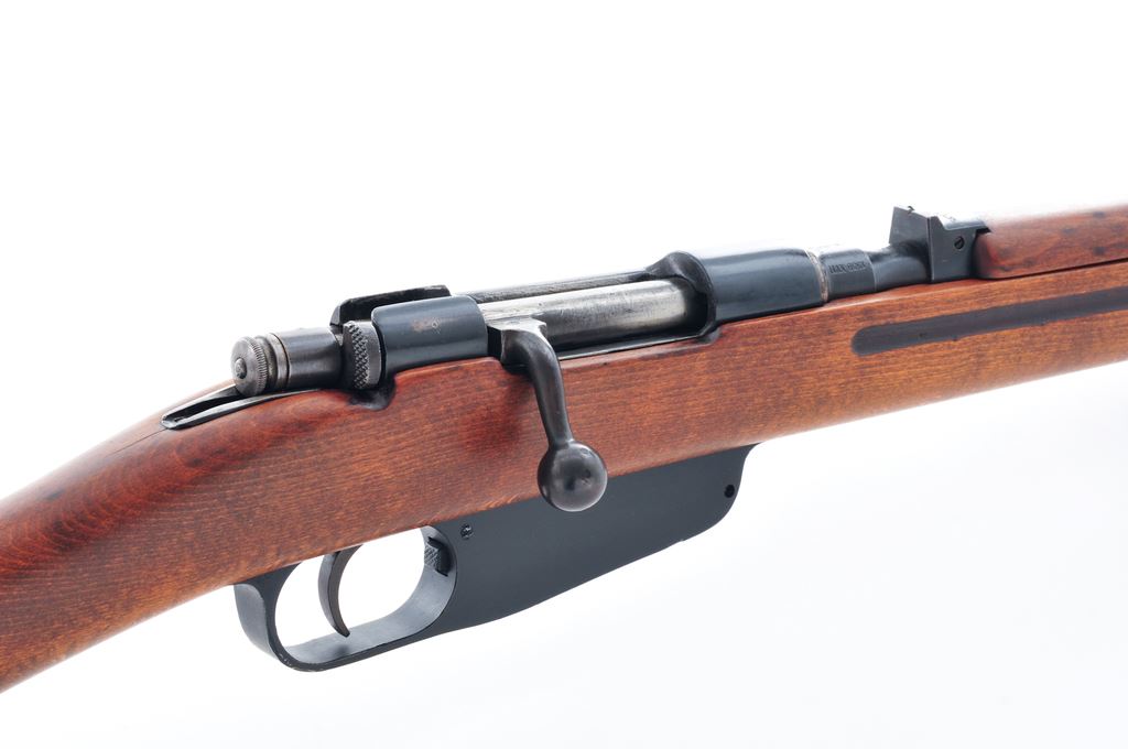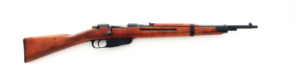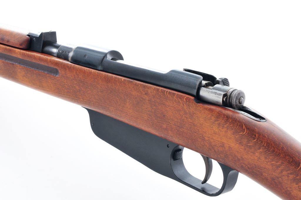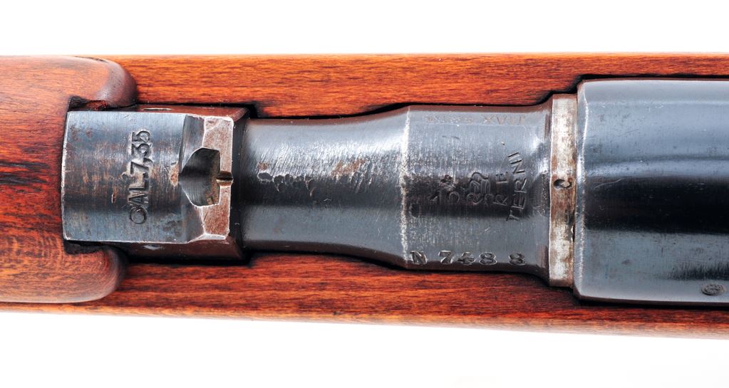 Italian Model 1938 Mannlicher Carcano Bolt Action Rifle, #N7488, 7.35mm Italian cal., 20.9'' barrel, blued/painted finish, hardwood stock, blade front sight and fixed rear sight with ''V'' notch. Marked on top of barrel ''(crown)/RE TERNI'', and on right side ''1939 XVII''. ''Top of rear sight is stamped ''CAL7,35''. Faint cartouche stamped on left side of buttstock. Forend is slotted for bayonet blade but no bayonet is included. No serial number on bolt handle, mismatched numbers on buttstock. Condition overall is very good with metal surfaces retaining approx. 80% reblued finish, with thinning on the bolt and buttplate. Black-painted magazine/triggerguard retains almost all of its applied painted finish. Wood has been sanded and an oil finish applied, showing a few light scratches and a small crack behind the tang, otherwise very good. Action is smooth, bore is very good. Est.: $200-$300. (C&R)