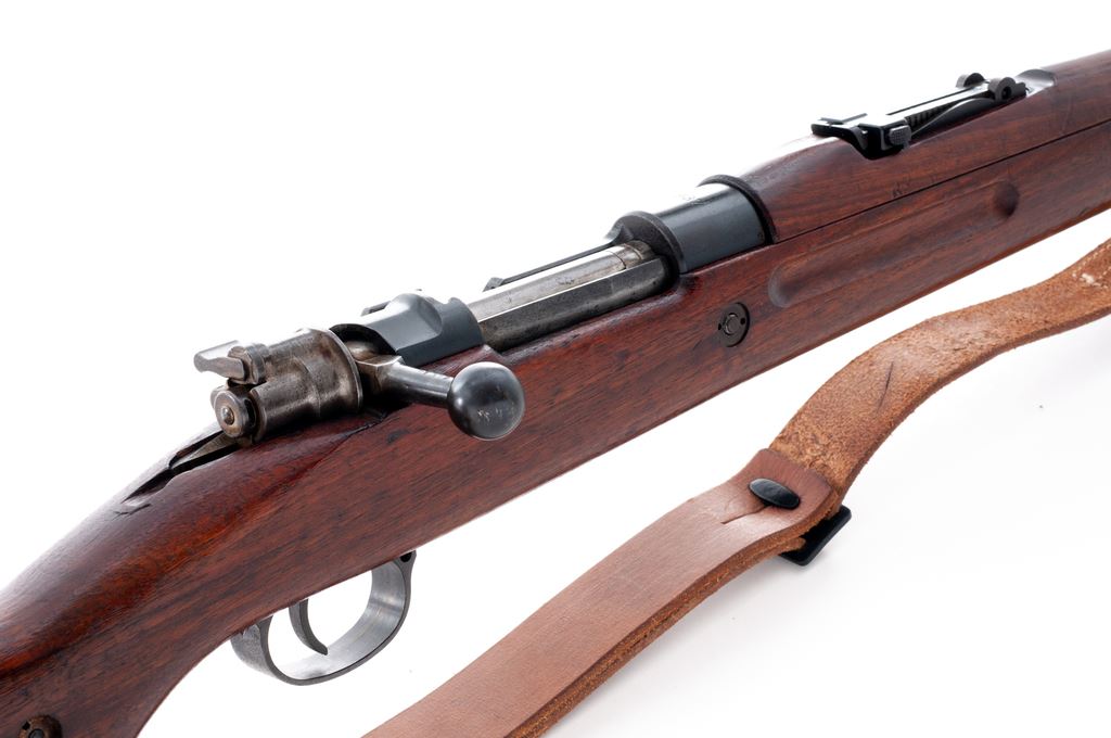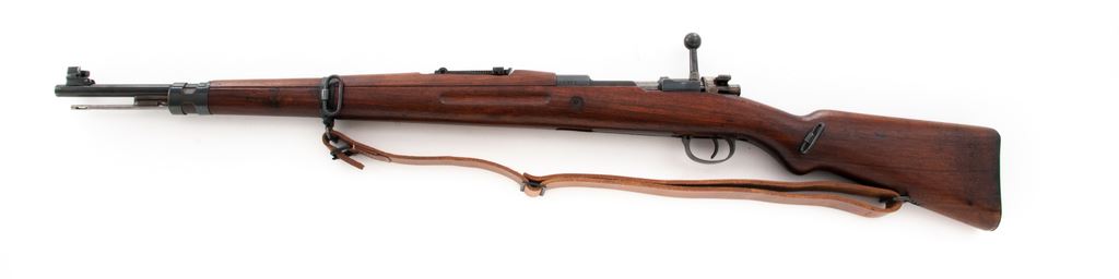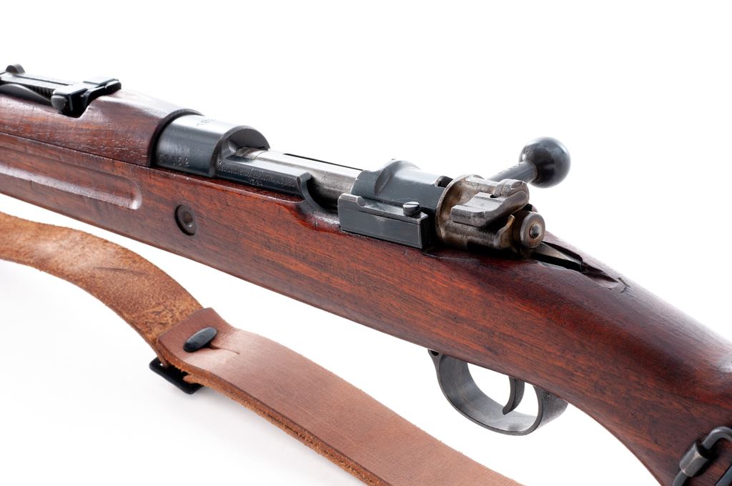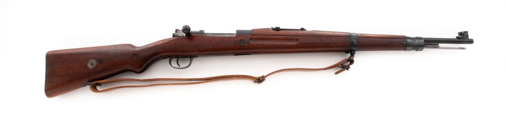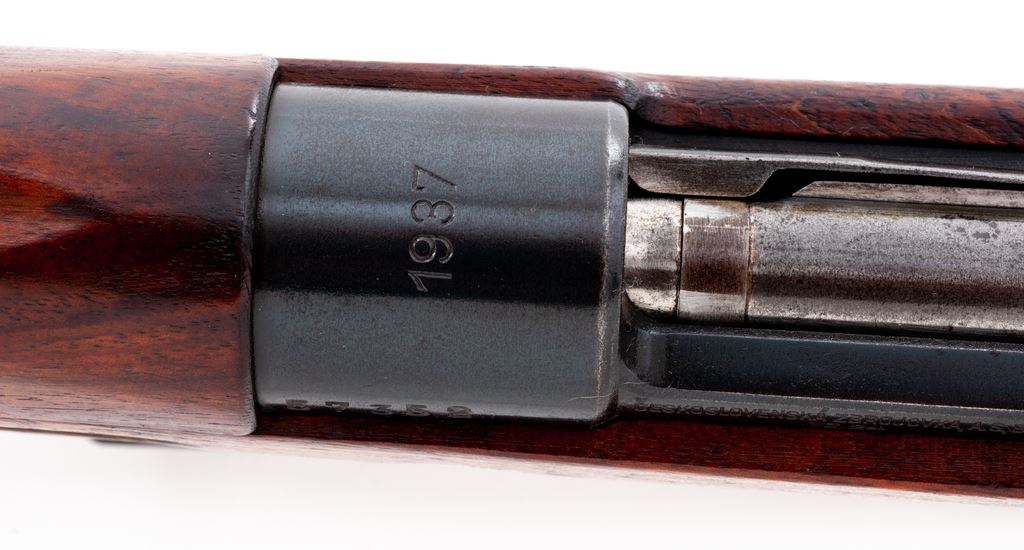 Japanese Contract VZ 24 Bolt Action Rifle, #C57352, 8x57mm cal., 23.2'' barrel, blued finish, hardwood stock, inverted ''V'' front sight with protectors and adjustable tangent rear sight. Marked ''1937''on top of receiver, and ''CESKOSLOVENSKA ZBROJOVKA,A.S,BRNO VZ.24'' on left side receiver rail. Czech lion stamp without letter on top of bolt handle knob, right side of receiver ring, and (faintly) on underside of pistol grip. Cleaning rod included. Matching numbers. ''C'' serial number prefix stamped on left side of buttstock identifying this rifle as made on contract for the Japanese military prior to WWII in the Pacific. Condition overall is fine with over 95% of the blued finish remaining on the metal, with bright bolt assembly toning to a lightly speckled patina and buttplate dark with patina. Wood has an old small repair to left side of forend and has had added varnish applied, showing mostly light handling marks. Action is smooth, bore is excellent with sharp rifling. No visible import stamps. Includes a reproduction Japanese leather sling in excellent condition. Est.: $600-$800. (C&R)