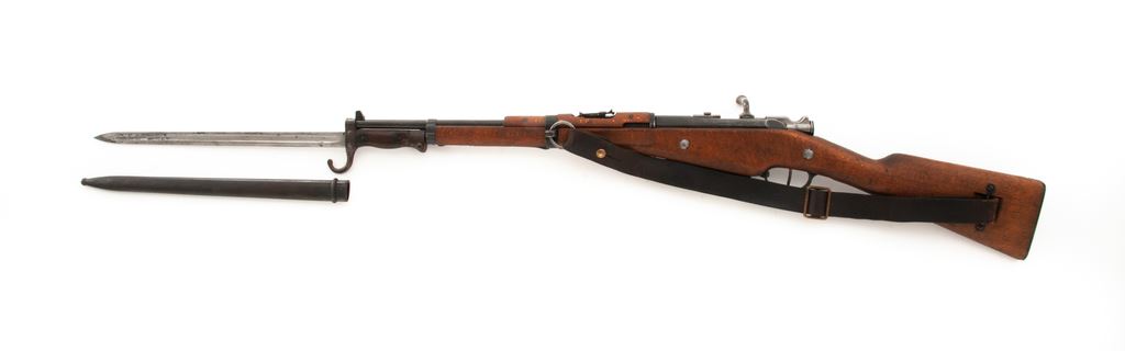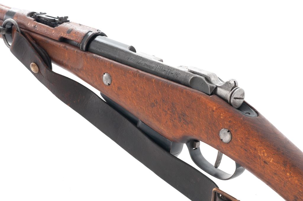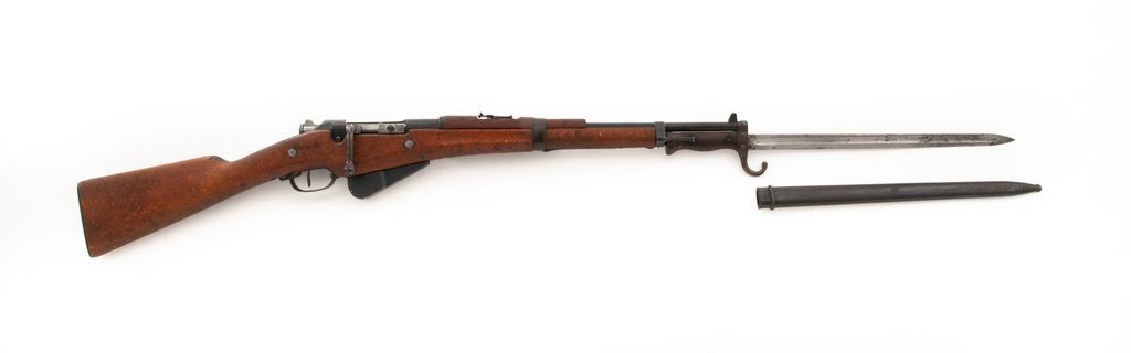 French M1916 Berthier Bolt Action Rifle, with bayonet and scabbard, #6924, 8x50Rmm cal., 17.7'' barrel, blued/painted finish with bright bolt, hardwood stock, blade front sight and adjustable folding leaf rear sight. Marked on left side of receiver ''ETTS CONTINSOUZA MLE-M-16''. Hand stamped ''PK'' on left side of cocking piece. ''N'' stamped on top of chamber. Faint roundel stamp on right side of buttstock. Matching numbers. Carbine has had 1927 modification where cleaning rod was removed and stacking swivel attached. Most of the painted finish has worn off receiver and barrel now turning to a brown patina. Condition overall is very good with approx. 60% of the blued finish remaining on the balance of the small parts; bright bolt handle turned dark. Wood has been arsenal refinished with a flat matte stain. Muzzle has a significant damaged area on left side of crown. Action is smooth, bore itself is excellent with sharp rifling. No visible import stamps. Includes a black leather French sling in good condition. French M1892 bayonet has a 15.75'' blade and is 20.25'' overall. Marked on blade ricasso with a small ''B'' inside of a diamond and has #13747 stamped on the quillion; steel scabbard is unmarked. Condition overall is fair with patina on the blade and old rust on the crossguard. Grip shows discoloration, chips and flaking; scabbard is good with one small dent and overall rust spots. Est.: $250-$350. (C&R)