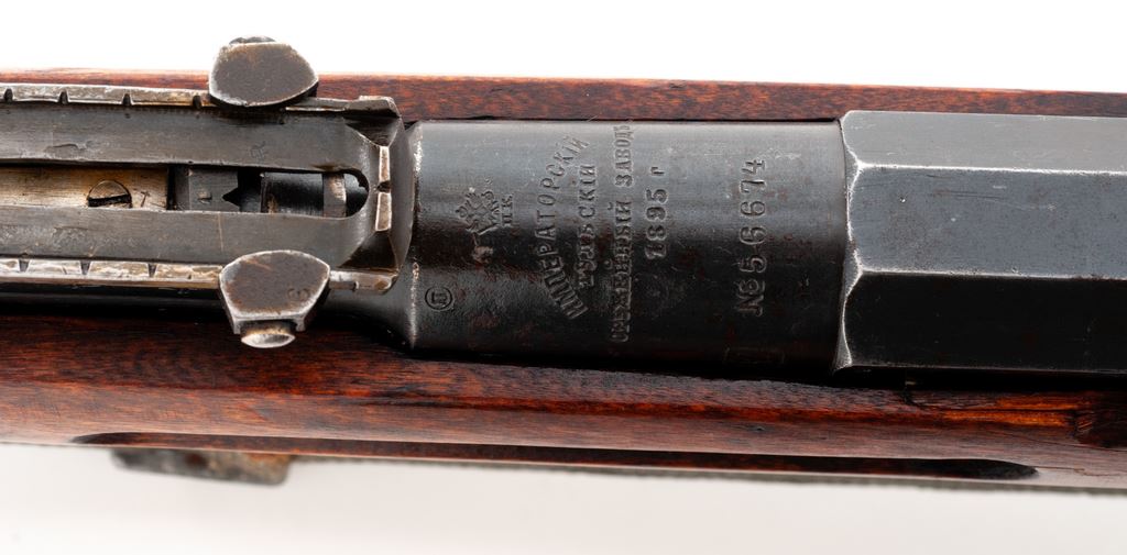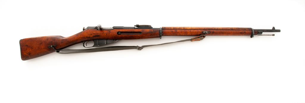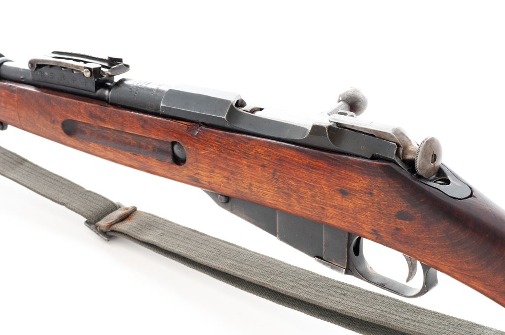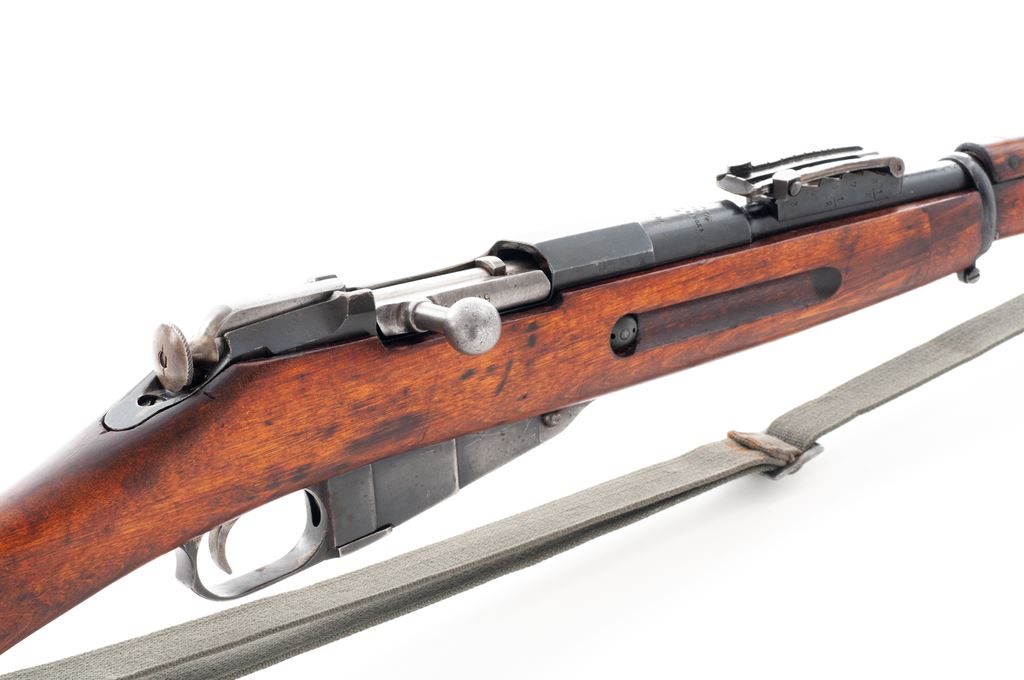 Finnish Issue Russian M91 Mosin-Nagant Bolt Action Rifle, #56674, 7.62x54Rmm cal., 31.6'' barrel, blued finish, hardwood stock, blade front sight with folding leaf rear sight. Marked on barrel shank with Czarist Imperial eagle over Cyrillic ''II K'' over Tula Arsenal Imperial ''NMnEPATOPCKIN TYnbCKIH OPYXEHHbIH 3ABOHb 1895r''. Finnish ''SA'' stamped on left side of barrel shank. Konovalov sight leaf has been added to rear sight base. Original arshin numbers are barred out and metric scale numbers added to right side of sight base along with a stamped ''D''. Base is also cut for a ''2'' notch. Rifle has sling swivels, bolt assembly is bright. Condition overall is very good with approx. 75% finish remaining on the metal, with thinning and scratches on the barrel, patina on the magazine, and buttplate worn bright. There is a slight bow to the handguard and a couple of dents to the forend, otherwise wood is very good with overall light handling marks. Muzzle has been counter bored and the bore is slightly dark with very good rifling. Action is slightly stiff but functional. No visible import stamps. Includes a Finnish blue/green cotton sling stamped ''SA'' in very good condition. Est.: $300-$500. (C&R)