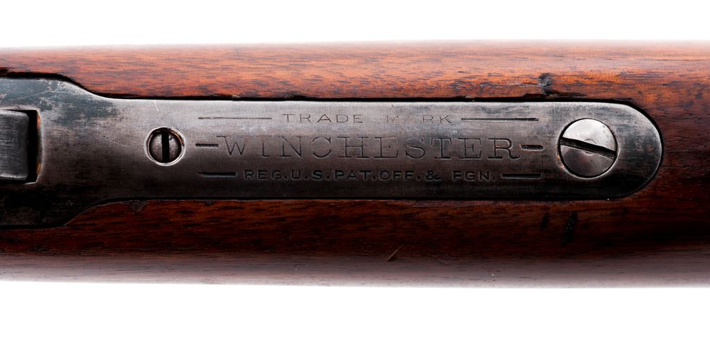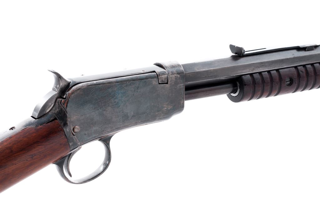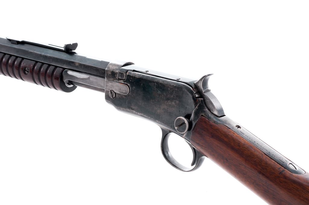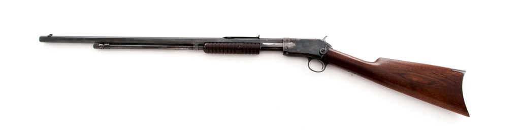 Winchester Model 1890 Pump Action Rifle, #628544, .22 Short cal., 24'' octagonal barrel, blue finish, straight grain walnut stock, 12-groove small forend, with standard sights and steel crescent buttplate. Mfg'd 1919. Condition is good as refinished, with some replaced screws. Approx. 85% blue remains with some pitting beneath. Stock has been sanded, with fissure emanating from buttplate to end of comb on left side. Action and bore are good. Est.: $250-$450. (C&R)