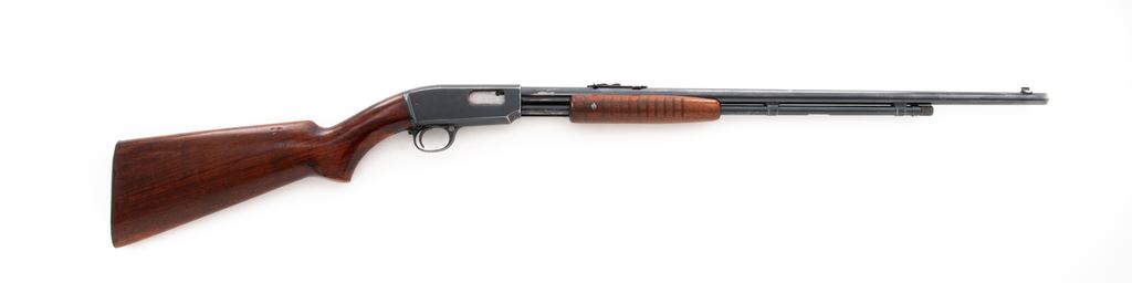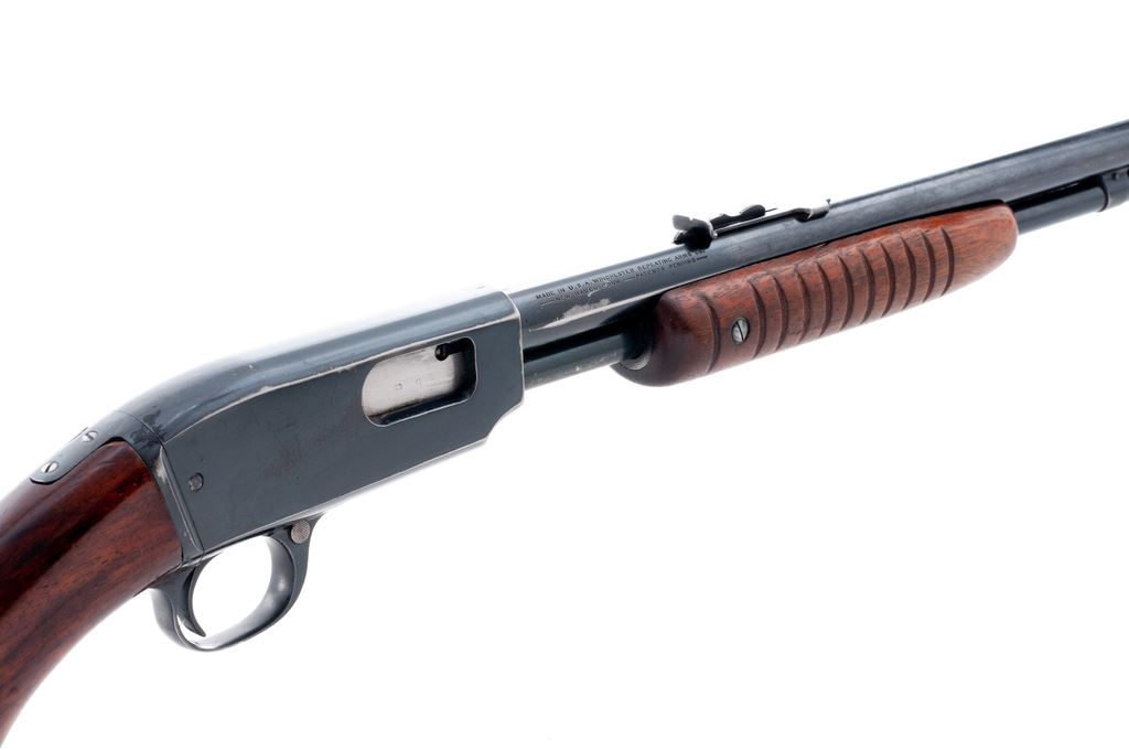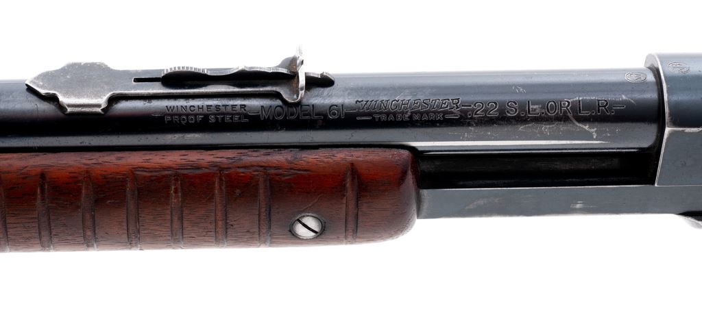 Winchester Model 61 Pump Action Rifle, #5018, .22 S-L-R cal., 24'' round barrel, blue finish, walnut stock with small 11-groove forend, with standard sights. Mfg'd 1933. Condition is fine retaining approx. 85%-90% thinning blue. Stock with light to just moderate pressure dings and scratches; additional coat of finish has been added to wood. Crisp action, mirror bright bore. Est.: $450-$650. (C&R)