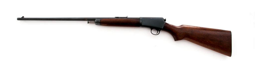 Pre-War Winchester Model 63 Semi-Automatic Rifle, #133369A, .22 LR cal., 23'' barrel, blue finish, pistol-grip walnut stock. Mfg'd 1955. Condition is very good as refinished, retaining approx. 92% of a later salt blue over very mild pitting. Several additional holes have been drilled and tapped at top of frame. Rear sight elevator is missing. Buttstock with mild impressions; left side of forend with more pronounced damage. Bore is fine. Est.: $250-$400. (C&R)