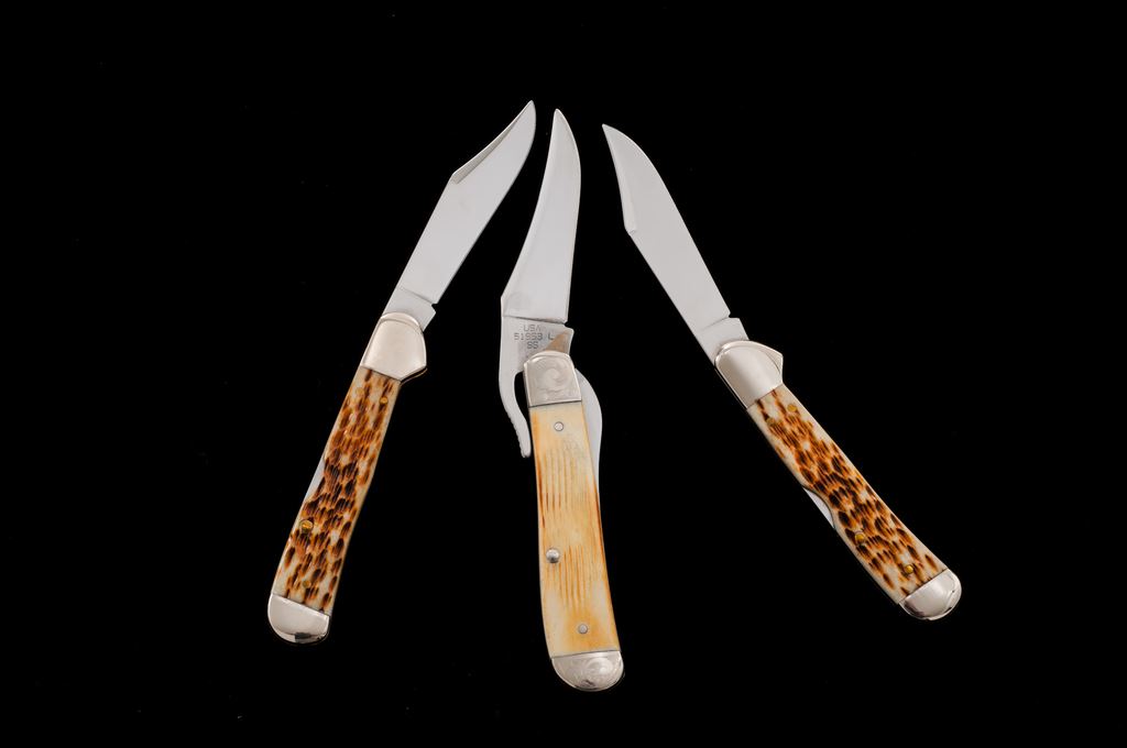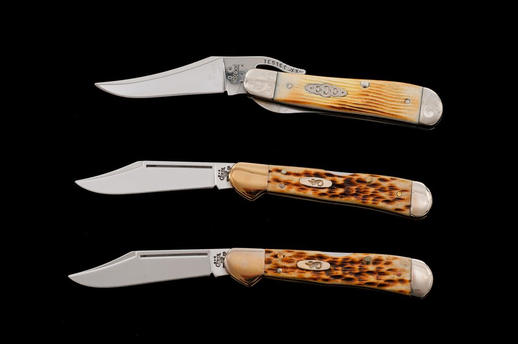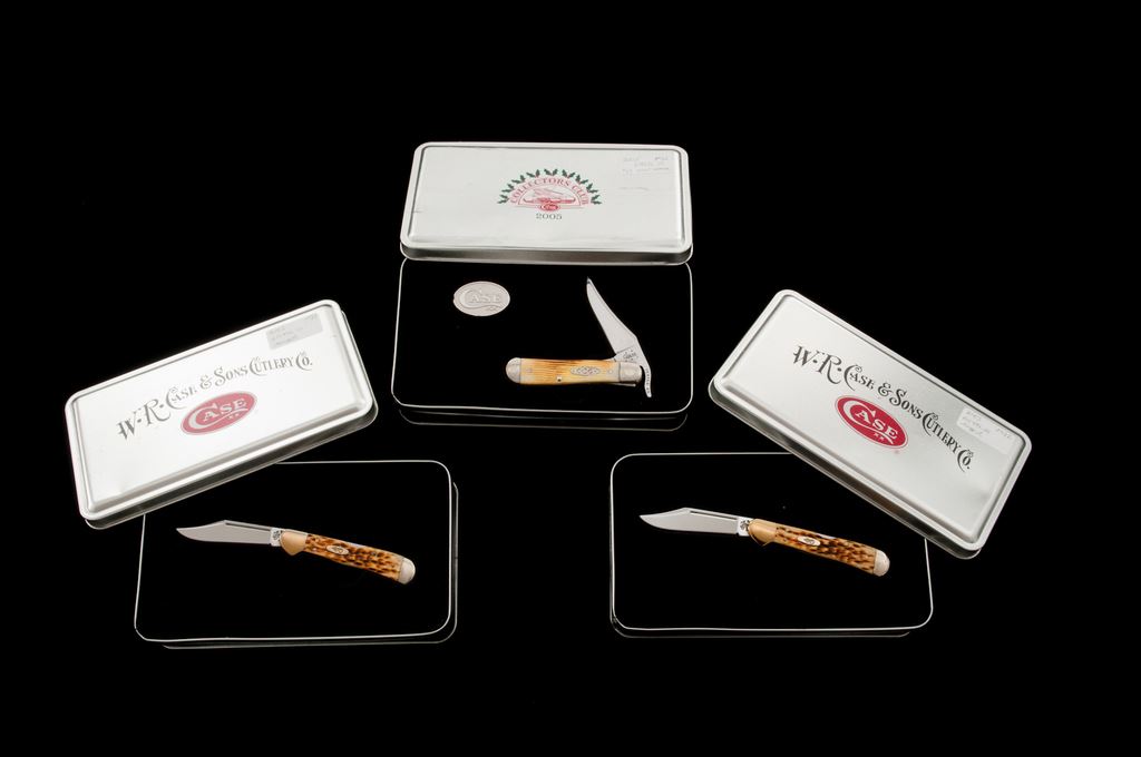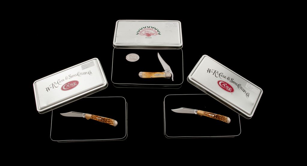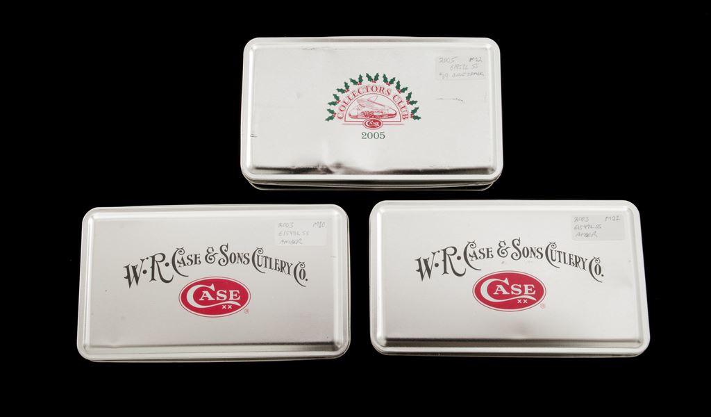 Lot of Three (3) Case Knives in the Original Case XX Display Tins: 1.) 2005 Case Collector's Club ''Russlock'' pattern, #61953L SS, Barn Board jigged ''oatmeal'' bone handles, CCC shield, and engraved bolsters; blade is numbered ''089''. In collector's tin with COA. Only 400 of these knives were produced. In excellent as new condition, never carried or sharpened. Tin with a moderate dent to the lid. 2.) Copperlock pattern, #61749L SS, mid-lock folding knife, with amber bone handles. In a W.R. Case & Sons Cutlery Co. collector's tin. Condition is excellent, never carried or sharpened. Bolsters with some light micro-scratching. Mfg'd 2003. 3.) Copperlock pattern, #61749L SS, mid-lock folding knife, with amber bone handles. In a W.R. Case & Sons Cutlery Co. collector's tin. Condition is excellent, never carried or sharpened. Bolsters with some slight micro-scratching. Mfg'd 2003. Est.: $200-$300/lot.
