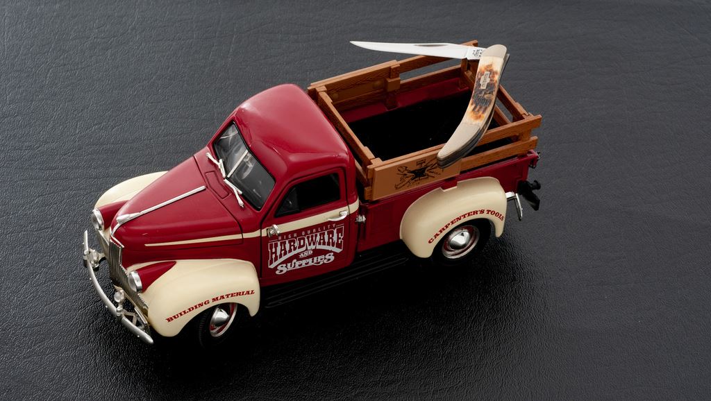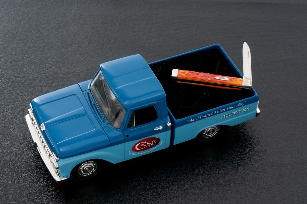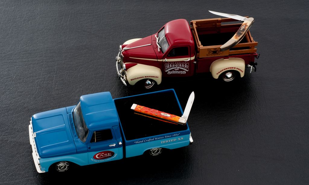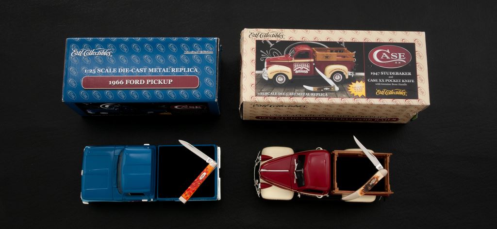 Lot of Two (2) Limited Edition Case Collectible Sets, each including one Case knife and diecast Ertl Collectible 1:25 scale replica truck: 1.) 1966 Ford pickup with Case XX logo, and includes a Case ''baby doctor's'' knife with orange bone handles. 2.) 1947 Studebaker Pickup Truck decorated with High Quality Hardware & Supplies logo, and includes a Case small ''Texas Toothpick'' knife with genuine bone handles. Both are as new, in their original boxes. Ford comes with a COA. Est.: $100-$200/lot.