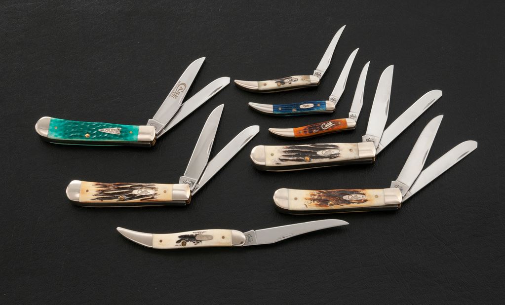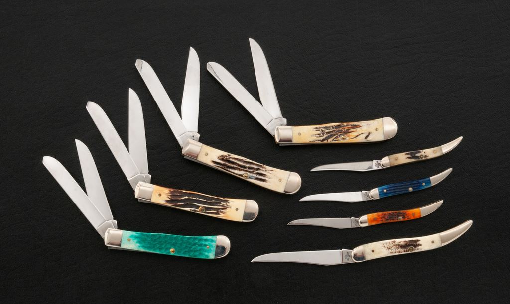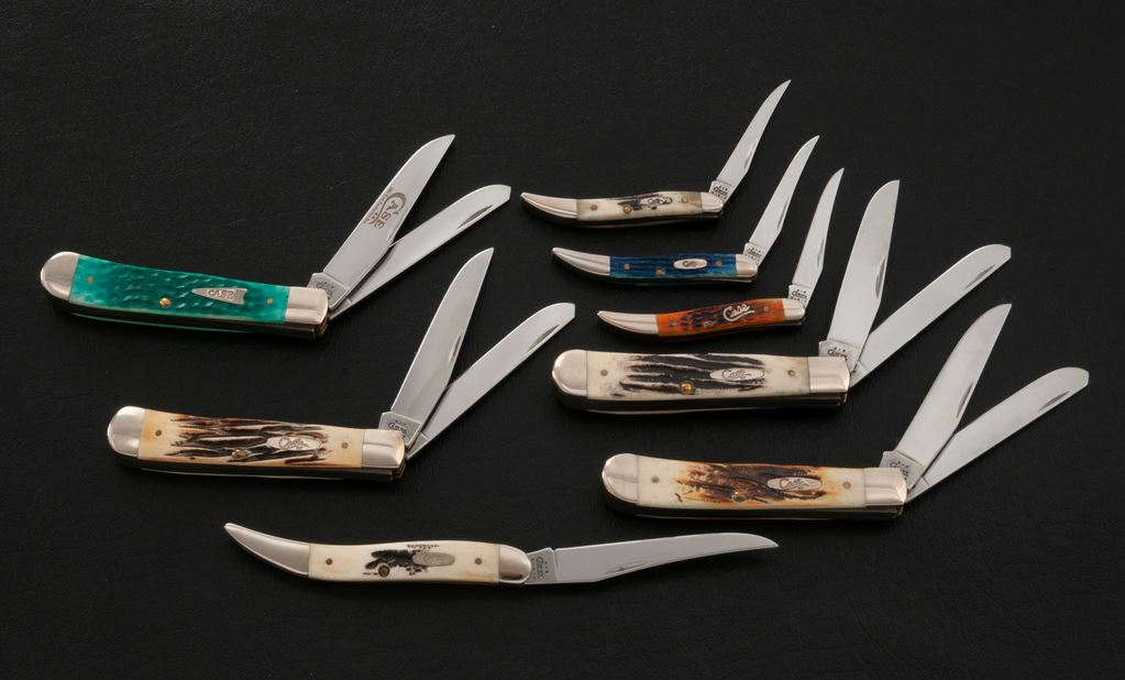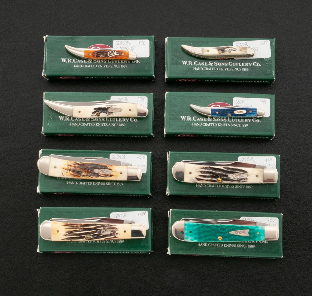 Lot of Eight (8) New-in-the-Box Case Folding Knives, Four (4) ''Trapper'' & Four (4) ''Texas Toothpick'', including the following pattern, model, and handle material: Trapper, #6.5254 SS, bonestag; Trapper, #6.5254 SS, bonestag; Trapper, #V6254 SS, vintage bone; First Production Run Trapper, #6254 SS, jade bone; Texas Toothpick, #V610094 SS, vintage bone; Texas Toothpick, #610096 SS, blue bone; Texas Toothpick, #610096 SS, autumn bone; Texas Toothpick, #V610096 SS, vintage bone. Six (6) of the knives come in their original box with folding pamphlet and brown tissue paper. Two (2) of the knives with mismatched boxes. Mfg'd ca. 2001-2003. All are in excellent as new condition, never carried or sharpened. A few show slight handling marks. Est.: $250-$450/lot.